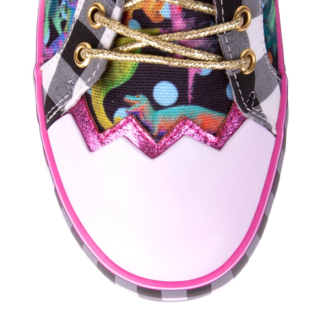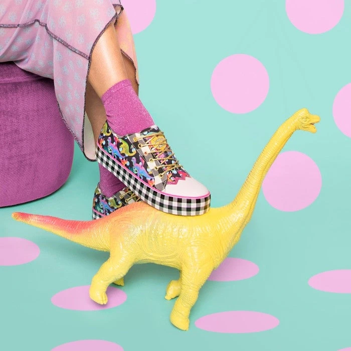 Stomp and jump in these super cool dino dreams! A fantastical multicoloured print of dinosaurs roaming along a black and blue polka-dot fabric, with metallic laces, zig zag toe cap and a platform sole covered in a monochrome gingham print. Lace them up and go on a Jurassic adventure!