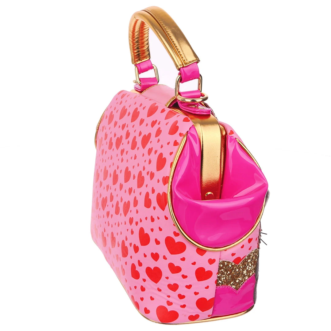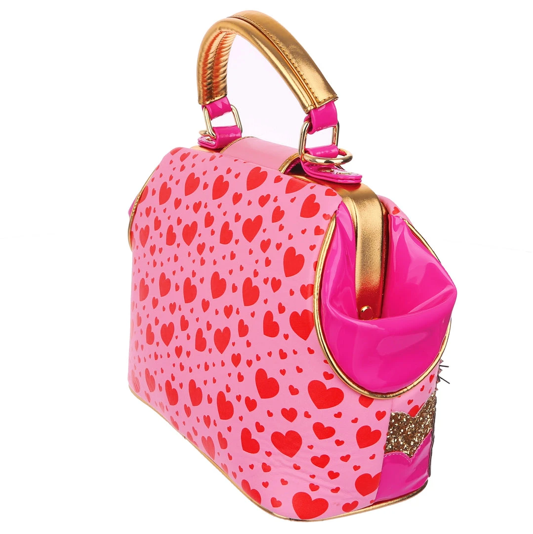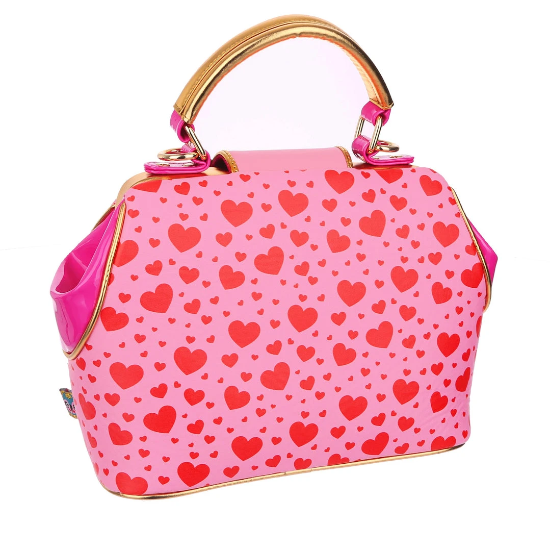 Are you feline fabulous? We know you are! Feel the love with this dreamy handbag which features two little kitties exchanging hearts which spell out “You’re so purr-fect”! Backed onto an adorable red and pink print of multi sized hearts, and accented with ruby red and gold scalloped details, this hand held bag also comes with an adjustable and detachable strap, so you can wear it however you would like!
