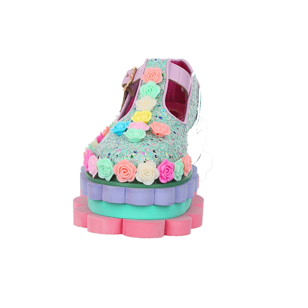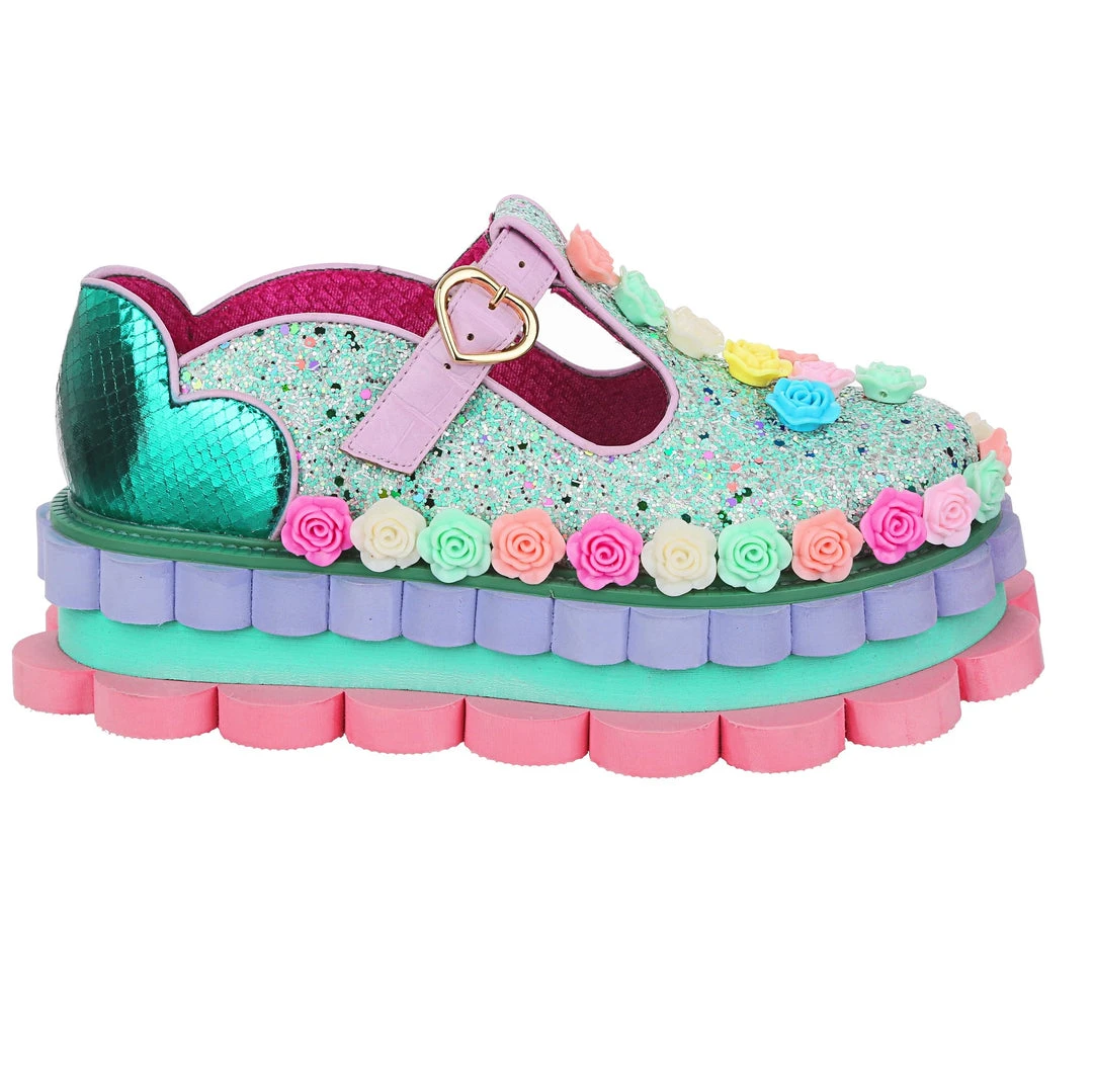Show the world that you are the sweetest cake on the stand in these flatform beauties! A fabulous and bright statement sole looks like layered sweet treats and is topped with the sweetest treat of all – you! The T-Bar upper is a gorgeous blend of chunky mint glitter and a shimmering teal metallic, which is all topped with fantastical multicoloured flowers! Add them to your plate today and feel like a kid in a candy store!