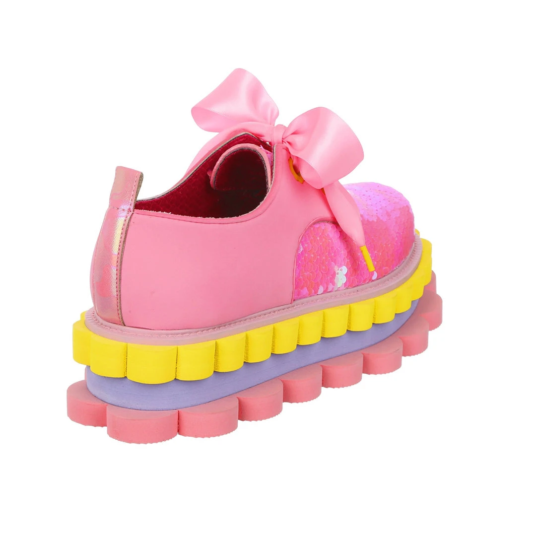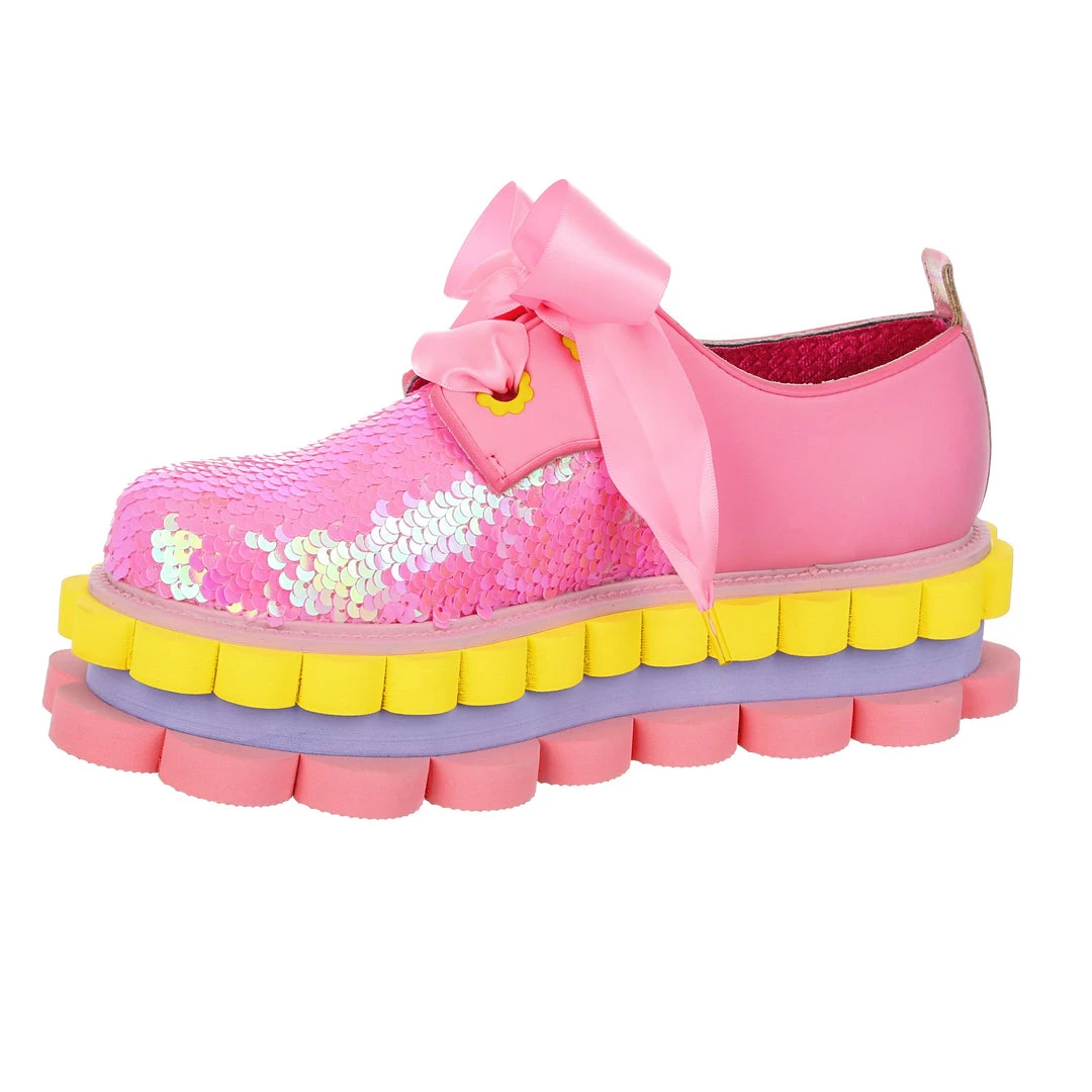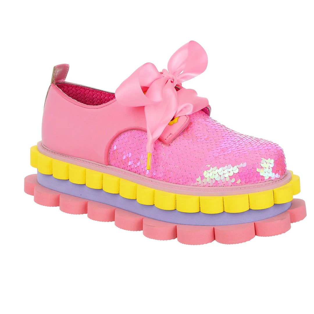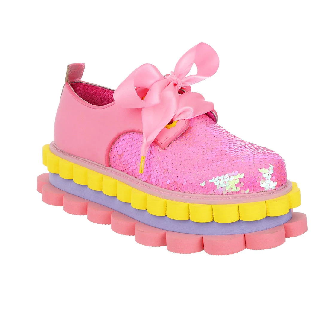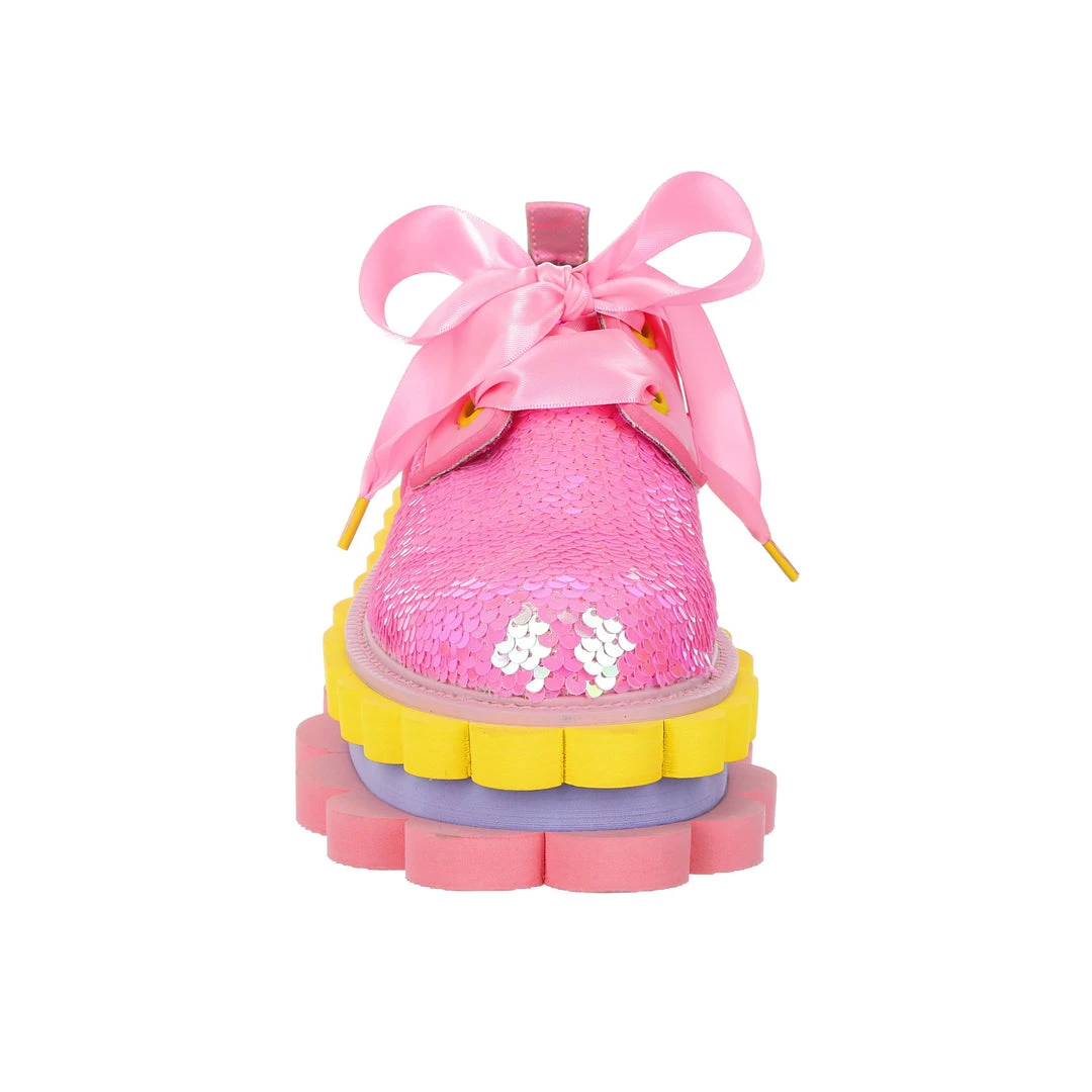 Perfect to add a POP of colour to any outfit these bright flatforms are your new wardrobe fave! With an upper of a unique pink foamy texture with matching pink sequins and a ribbon lace, the real super star of these shoes is the sole! Triple stacked scalloped and special, these block colour layers are here to take your outfit to the next level – give them a go today!