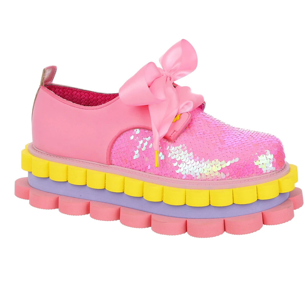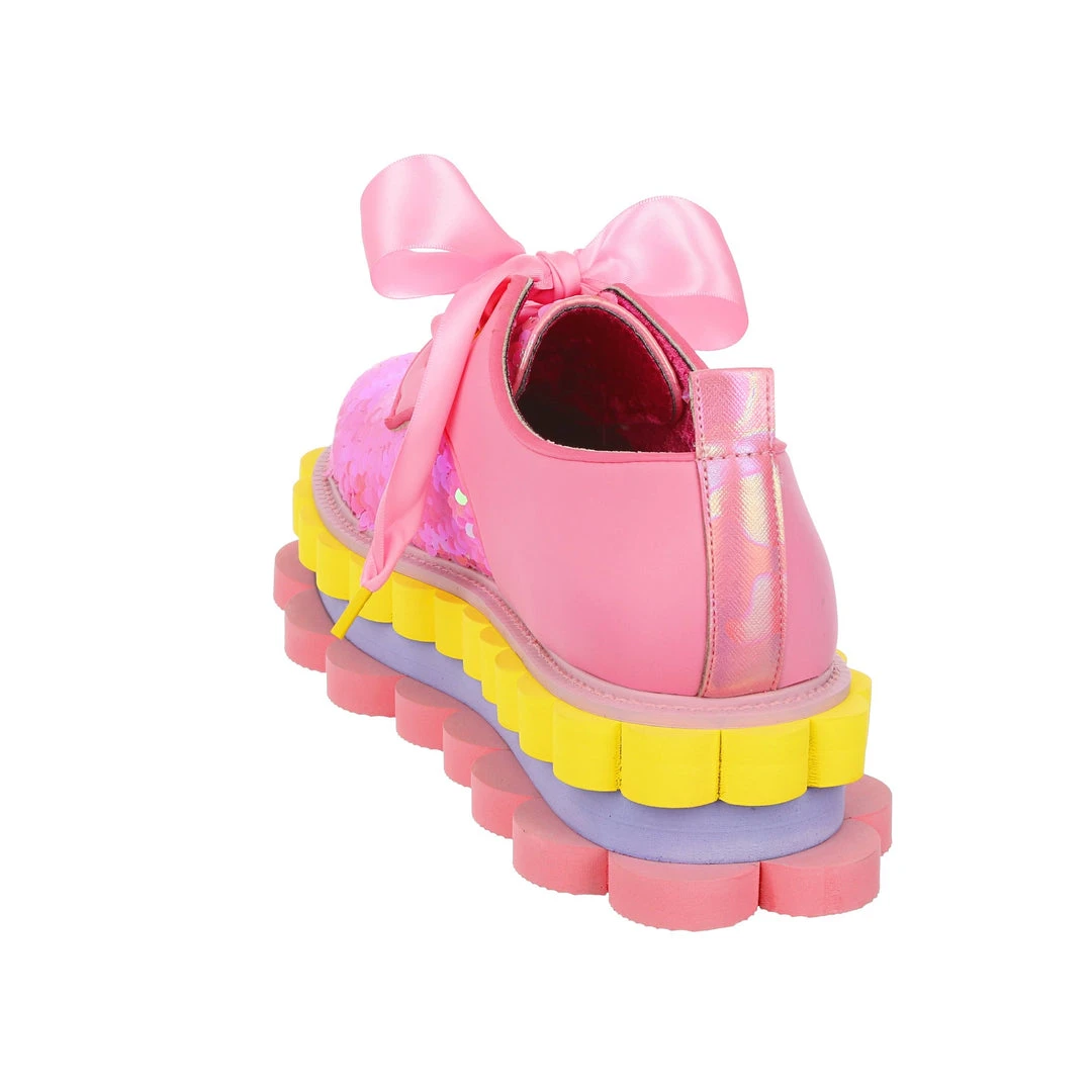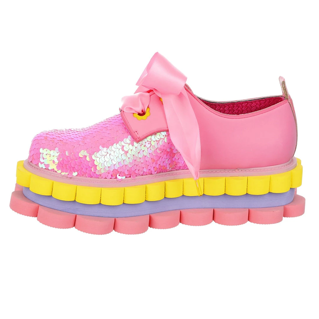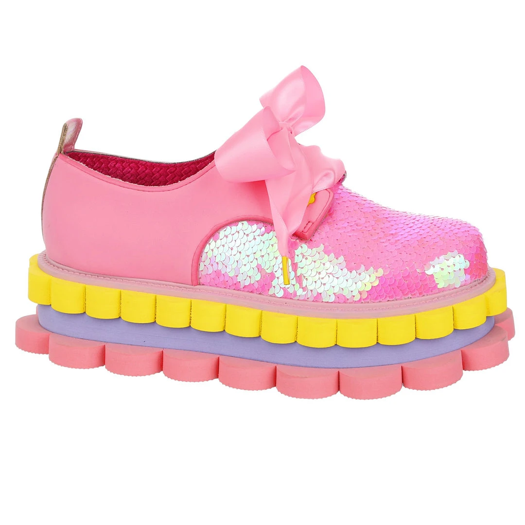 Perfect to add a POP of colour to any outfit these bright flatforms are your new wardrobe fave! With an upper of a unique pink foamy texture with matching pink sequins and a ribbon lace, the real super star of these shoes is the sole! Triple stacked scalloped and special, these block colour layers are here to take your outfit to the next level – give them a go today!