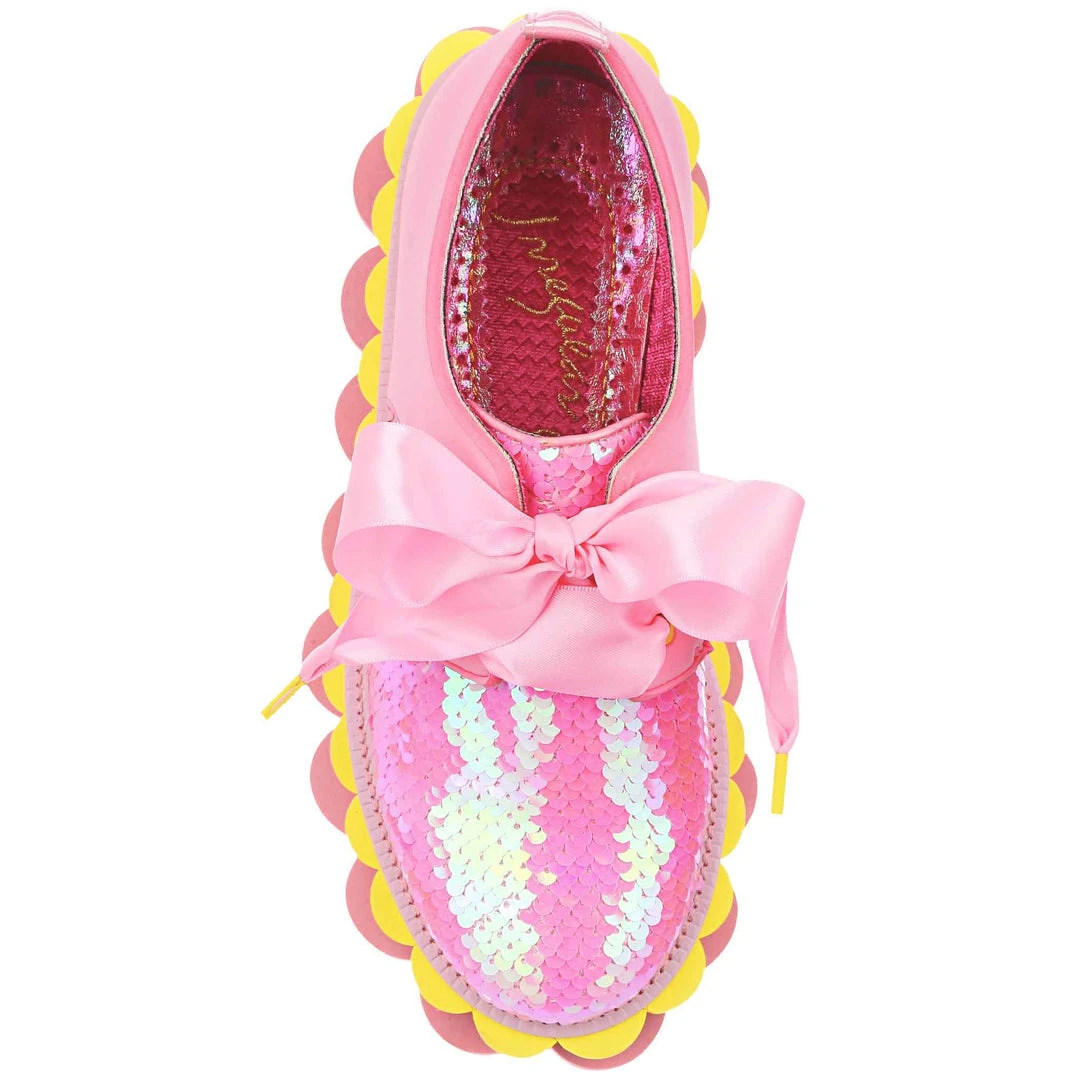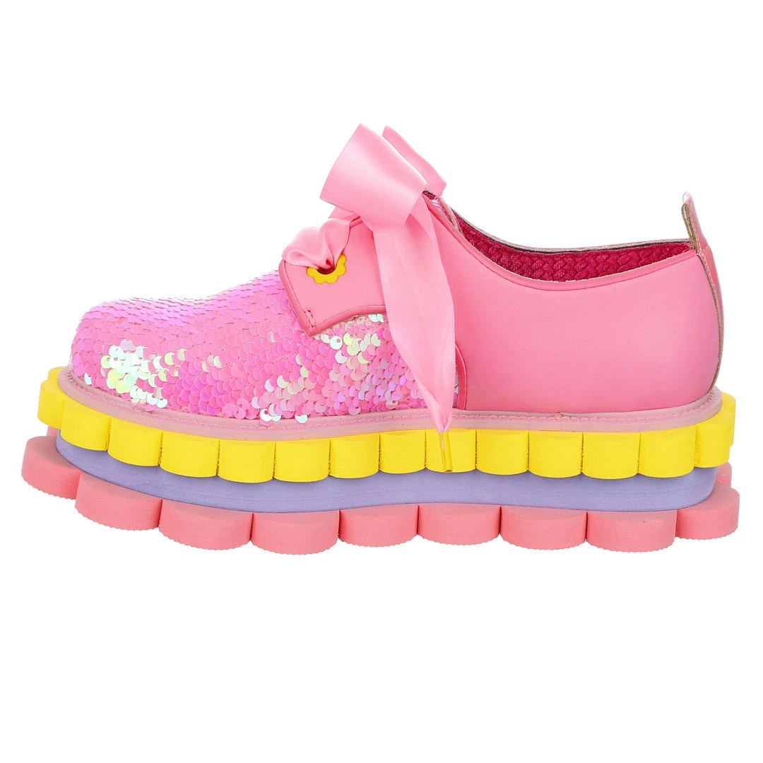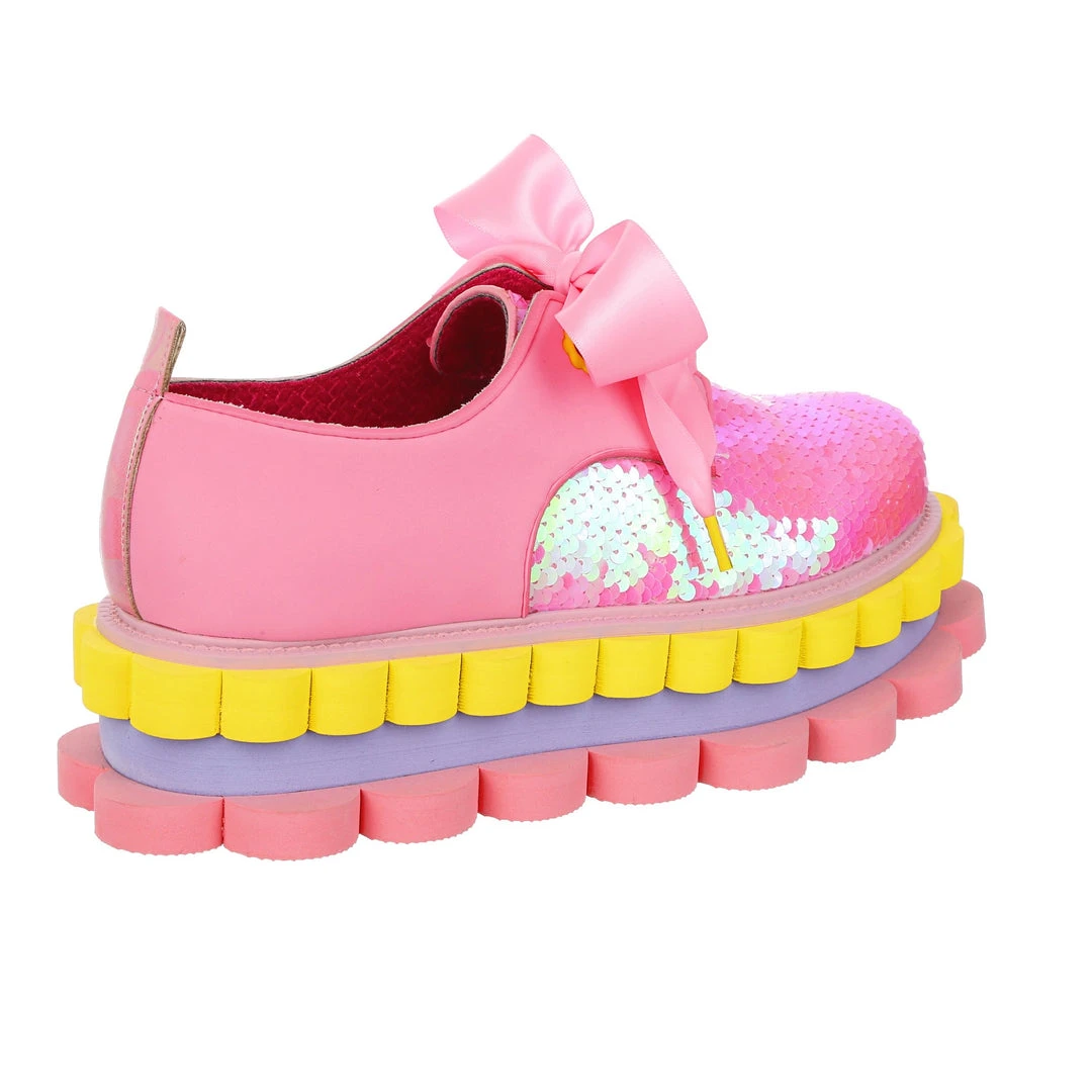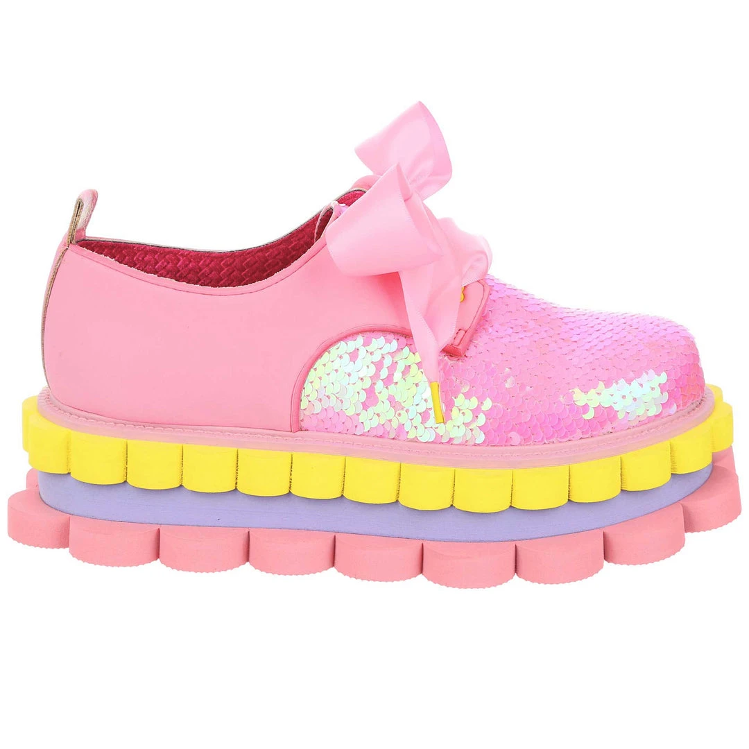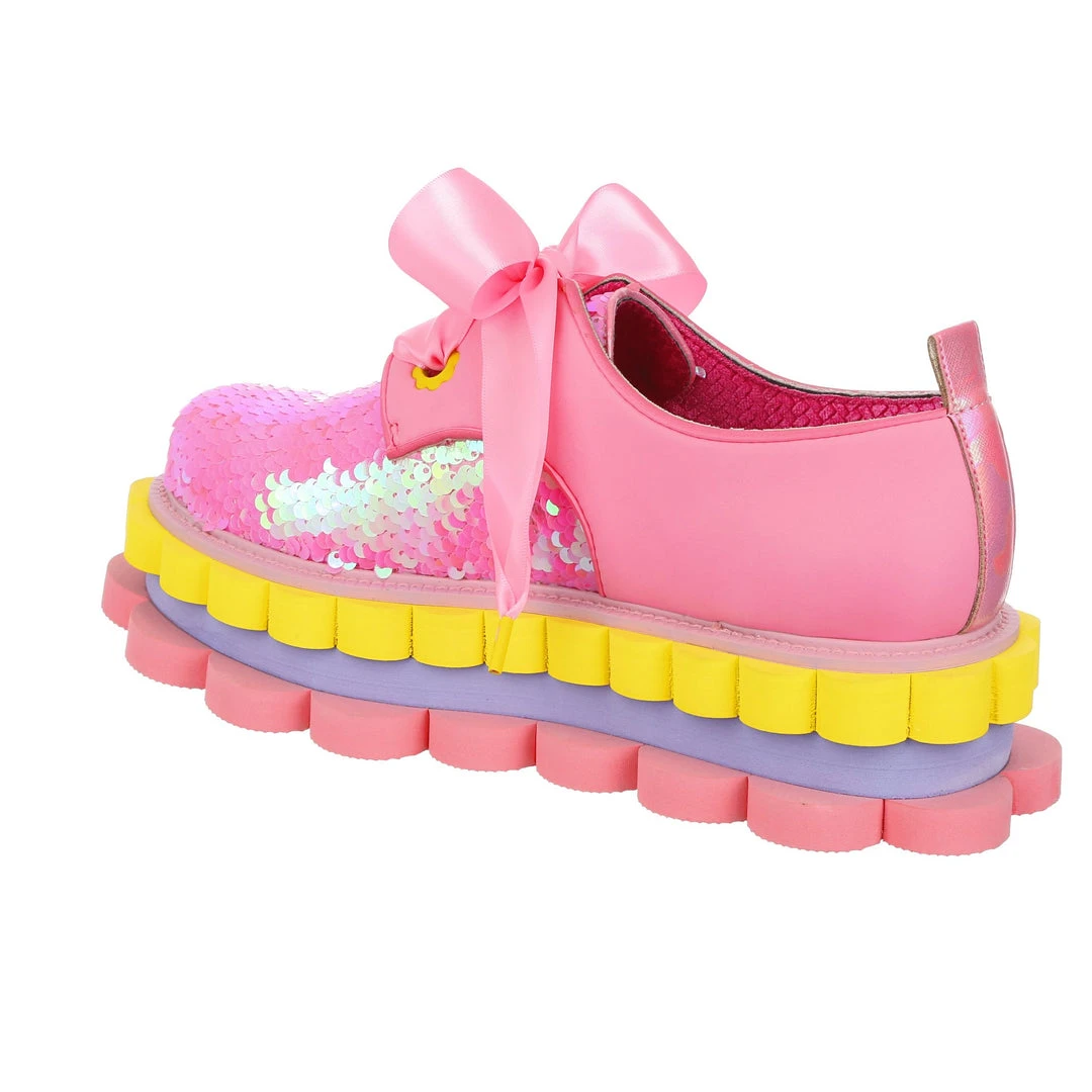 Perfect to add a POP of colour to any outfit these bright flatforms are your new wardrobe fave! With an upper of a unique pink foamy texture with matching pink sequins and a ribbon lace, the real super star of these shoes is the sole! Triple stacked scalloped and special, these block colour layers are here to take your outfit to the next level – give them a go today!