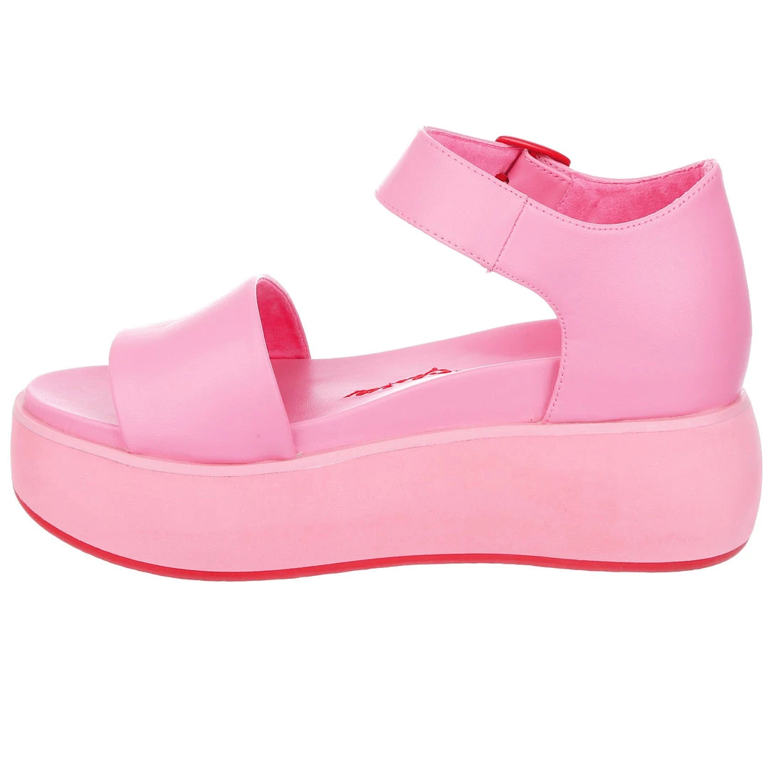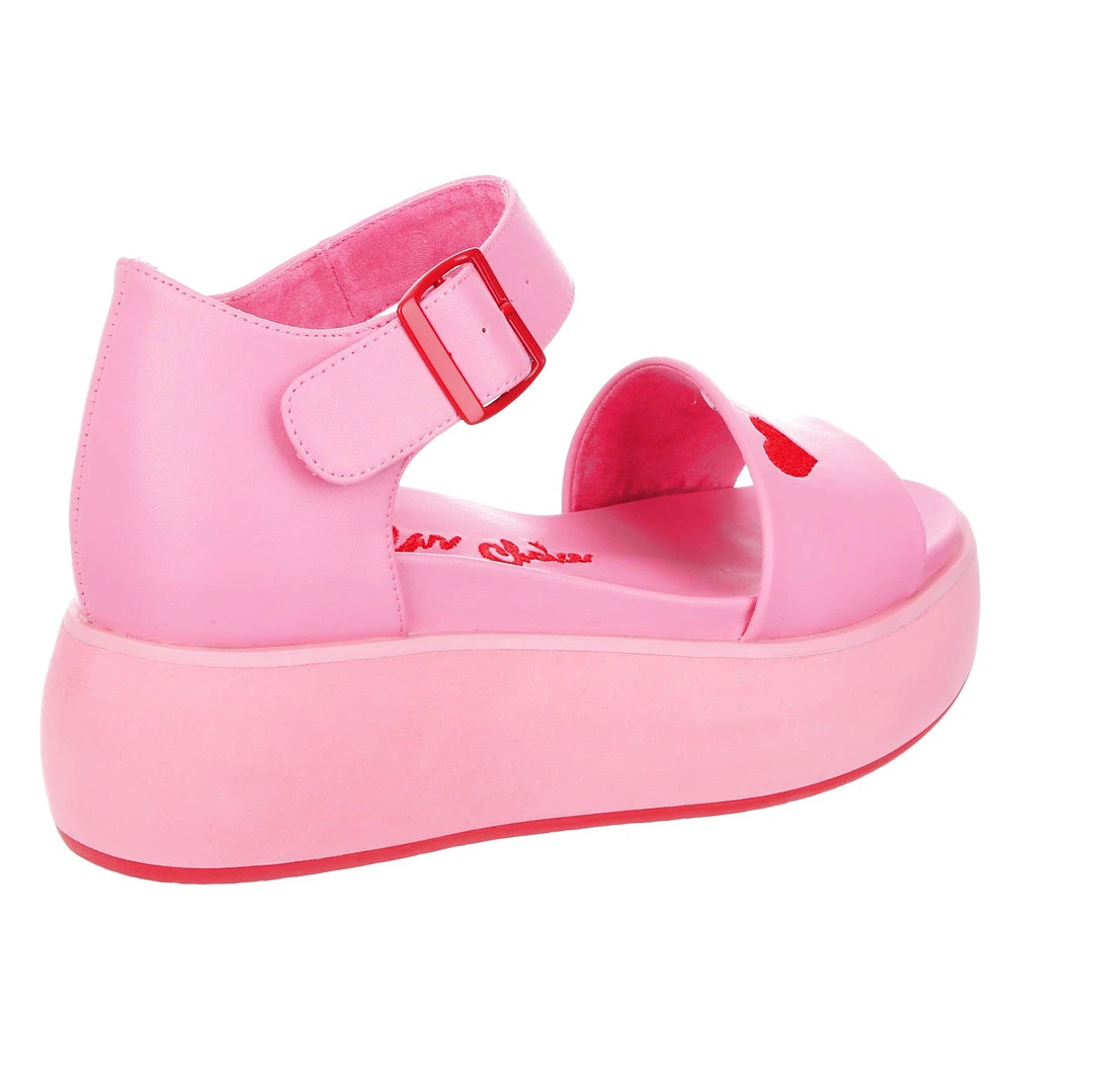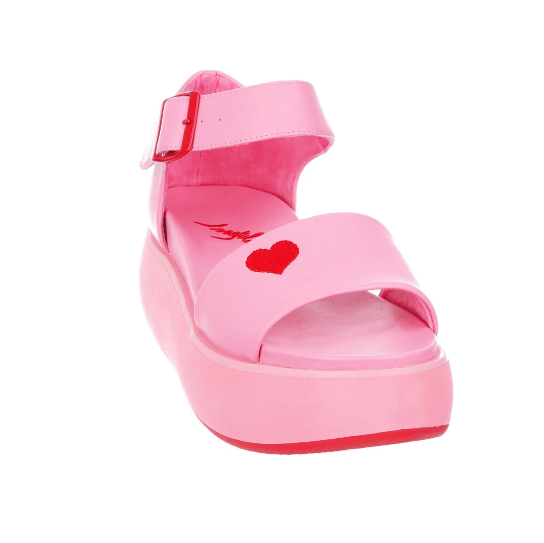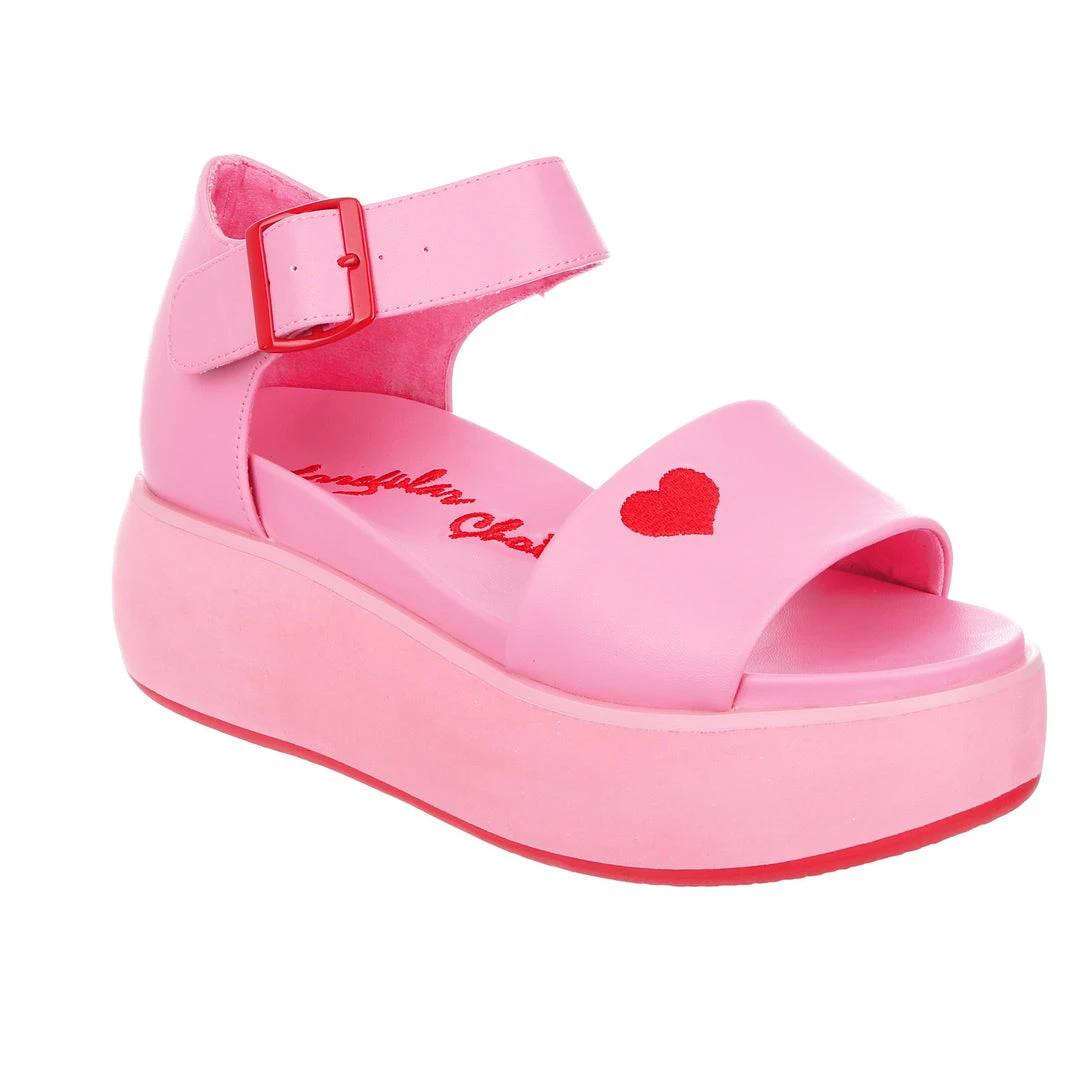 Hello new faves! These sleek and bright sandals are here to become your new go-to’s! A super comfy flatform sole and classic two strap look is all decked out in a pink monochromatic fantasy, only broken up by the striking red heart embroidery and matching buckle! Great to style with other block colours, or to use as a pop of colour in any outfit!