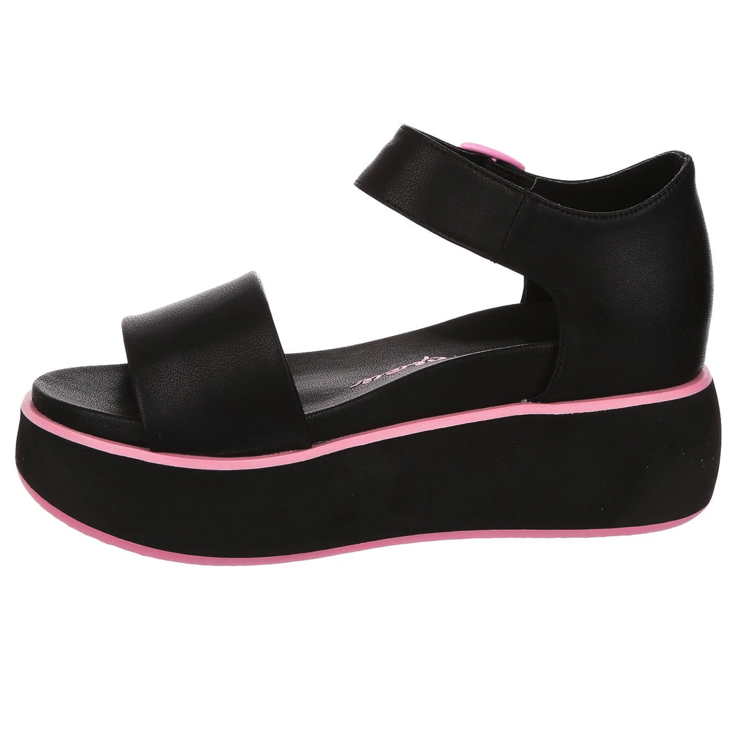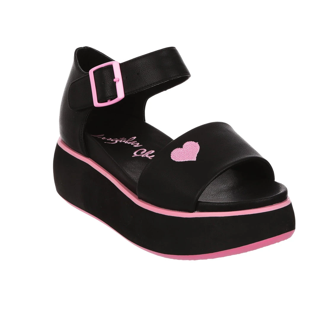 Hello new faves! These sleek and bright sandals are here to become your new go-to’s! A super comfy flatform sole and classic two strap look is all decked out in a black monochromatic fantasy, only broken up by the striking pink heart embroidery and matching buckle! Great to style with other block colours, or to use as a pop of colour in any outfit!