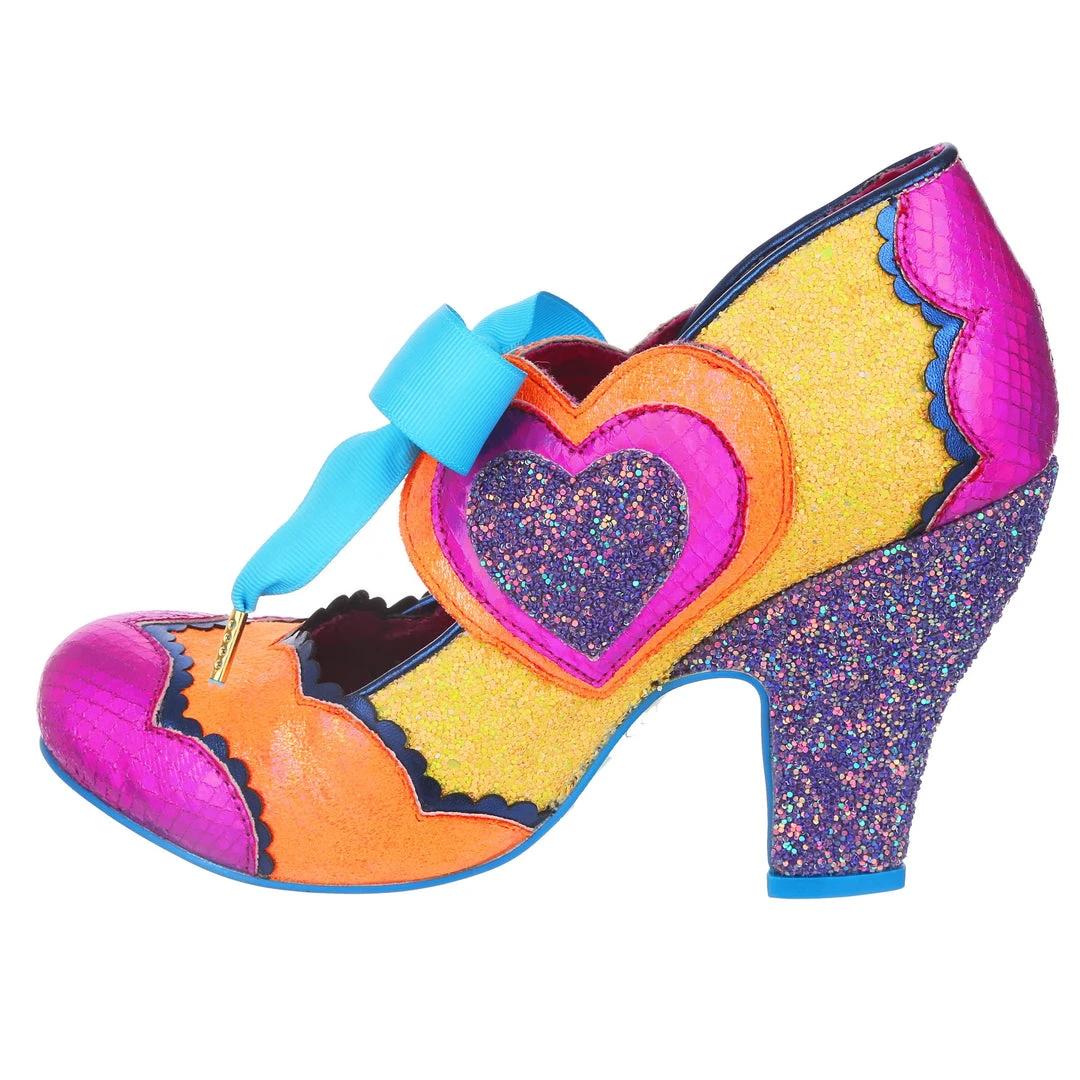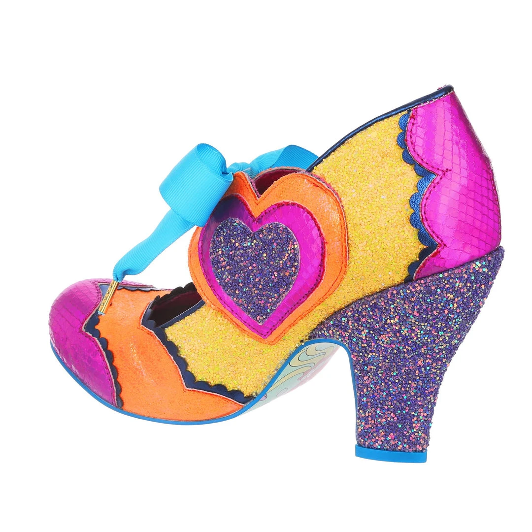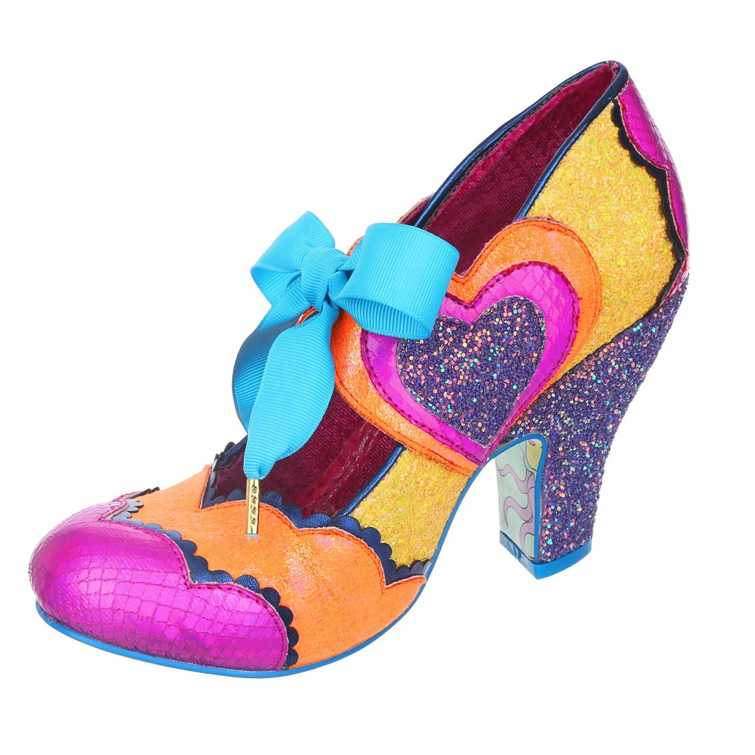 Oooooh feeling grooooovy! Capture the summer of love in these psychedelic wonders! A classic heel shape for us, paired with a tie up Mary Jane strap that forms the stunning retro hearts on the sides! An eye catching contrast of hot pink, orange and yellow – these are sure to make you fall in love with any outfit!