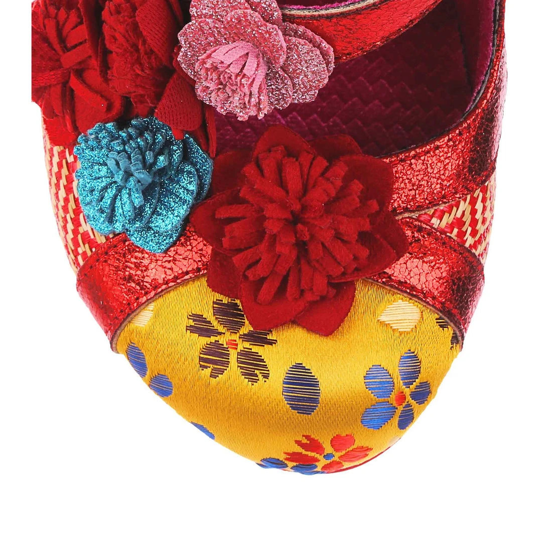 These are a pair of cuties! A diagonal strap crosses the foot, making the leg look longer and giving a beautiful silhouette, which is embellished with fabulous flowers! A stunning red and white herringbone is paired with the sleek shimmering red finishing on the other panels and a multicoloured floral brocade too! Perfect for all you floral lovers who want something a little different!