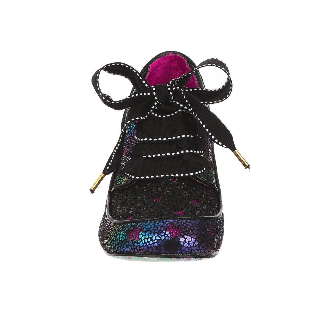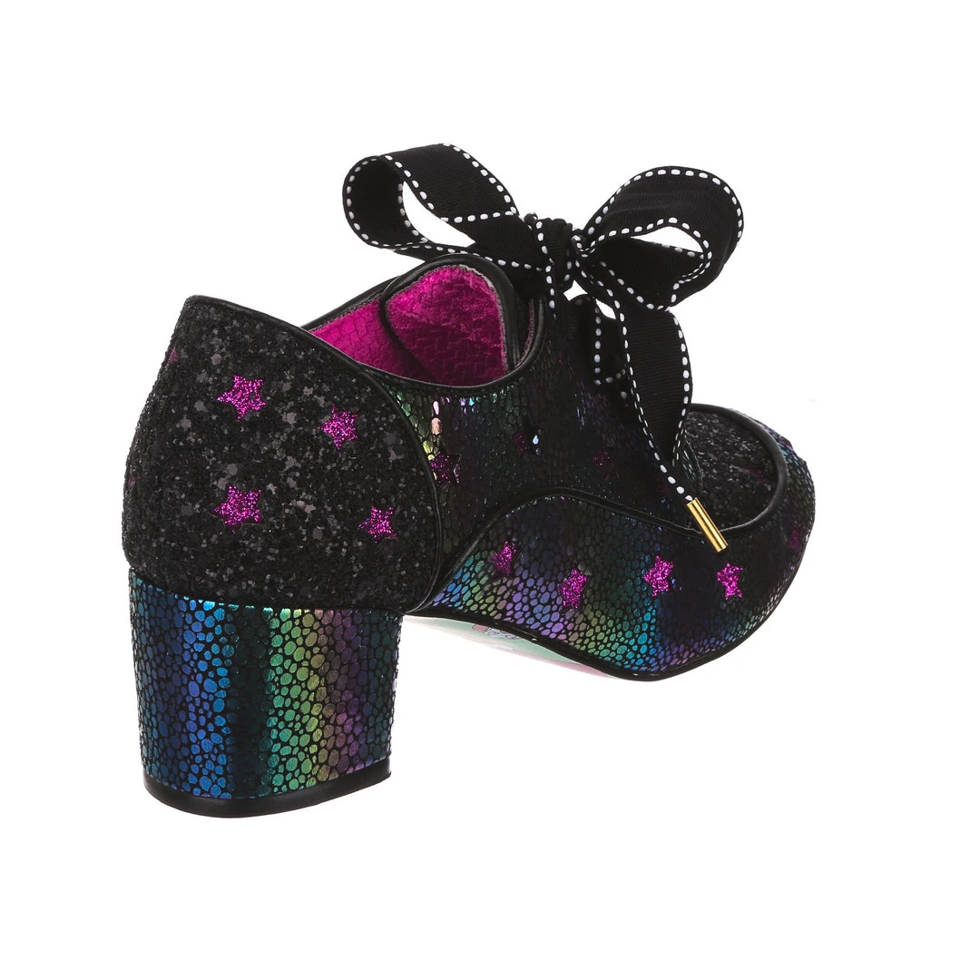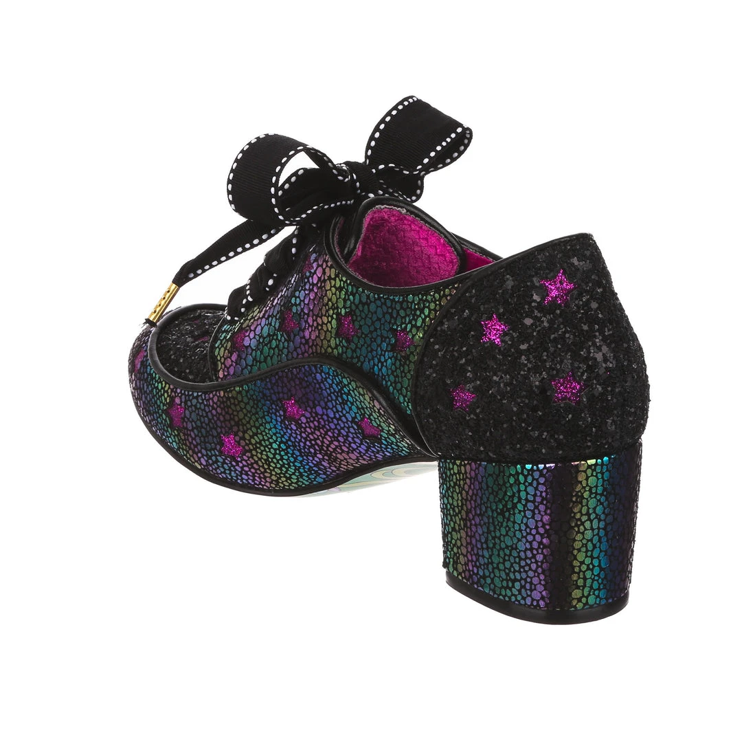Put a star in your step with these lovely lace ups! Featuring cut outs of magenta glitter stars, these bold and beautiful wearable chunky mid heels are a striking oil-slick colour scheme, with a reptilian pattern! Sure to turn heads and make people smile, and great to add a splash of magic to any look, make sure to add them to your wardrobe today!