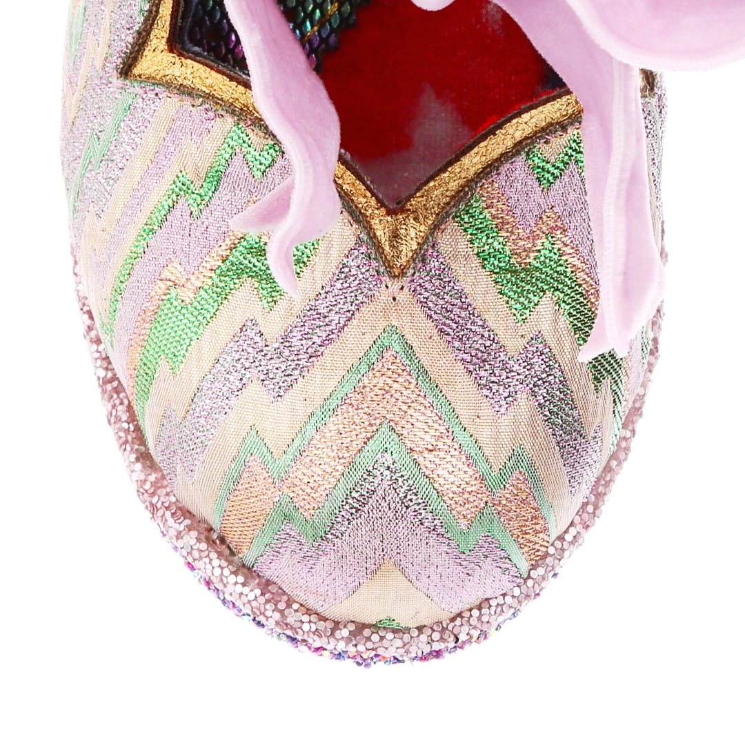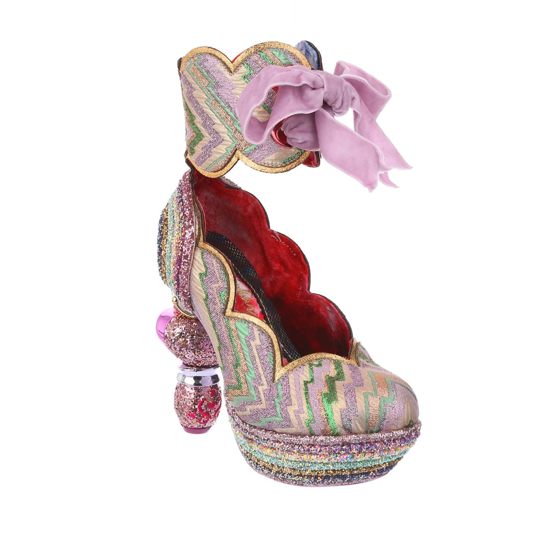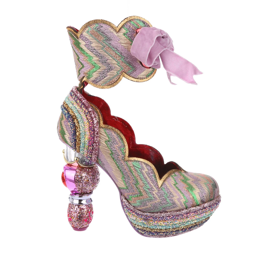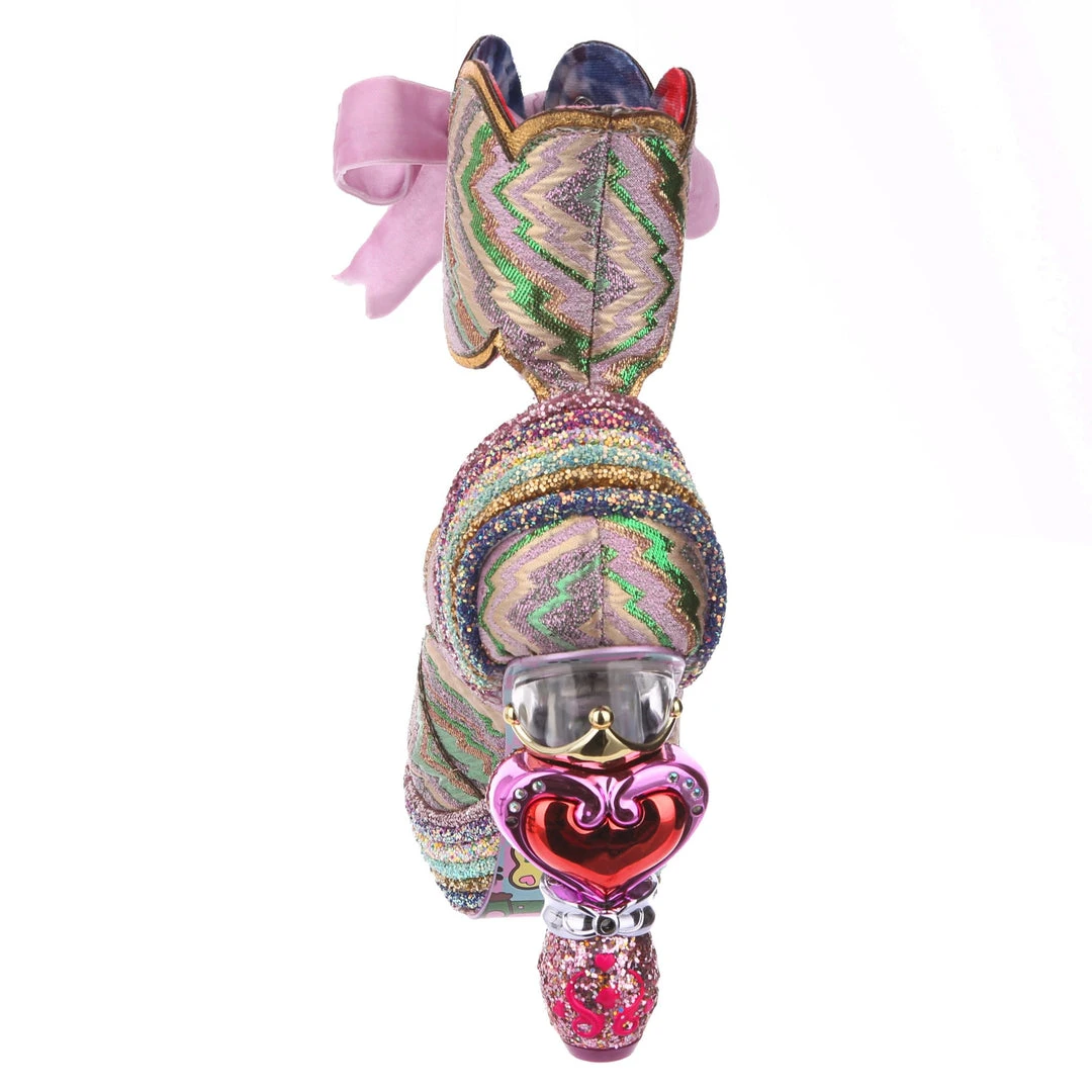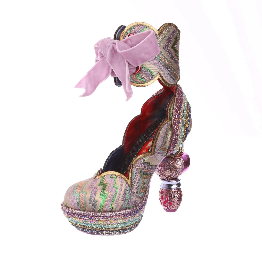 Feel the magic transform you! These absolutely dazzling heels are shaped like magic wands – they even light up and play music! Paired with a chevron striped texture of pink, silver and green, and a statement ankle strap tied with a bubblegum pink velvet ribbon – these beauties are sure to make you star of the show!