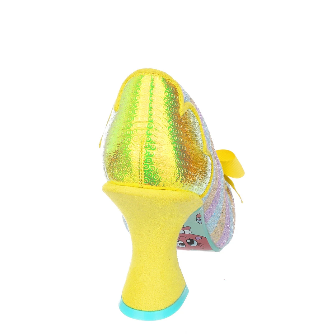 Feel like royalty in these regal heels! Featuring a shimmering yellow fleur de lis on the heel of the upper and tongue of the shoe, these bow topped lovelies are accented with a gorgeous curving heel to really give that opulent feeling all over! The pastel striped glitter upper is perfect to pair with all your favourite bright clothes, or even a more muted outfit so that they can really pop! Give them a whirl, why not?