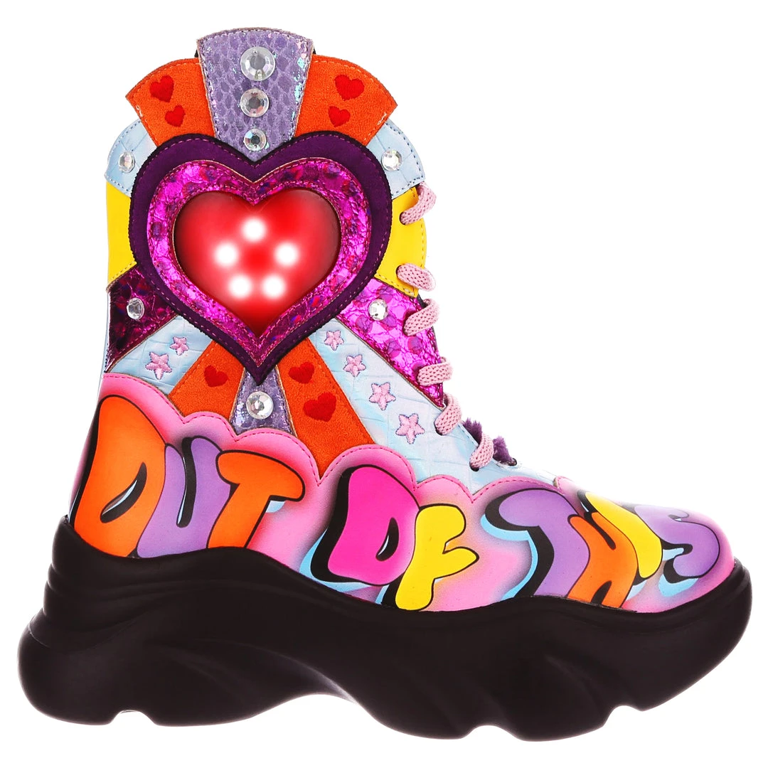 Spread the love and serve some funk in these statement boots! Featuring a chunky platform sole, retro graffiti style lettering reading ‘out of this world’, and a fairground style heart which lights up with each step.