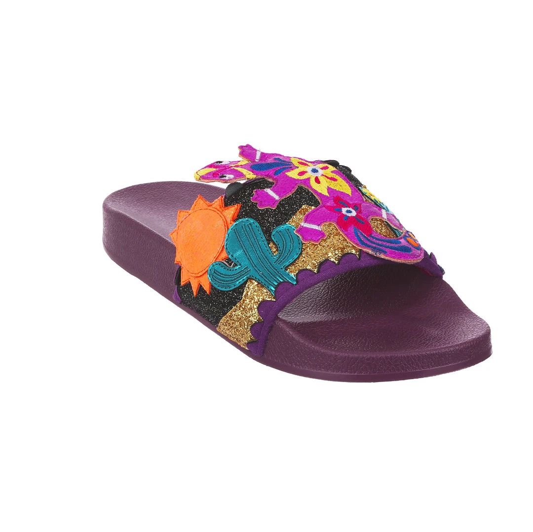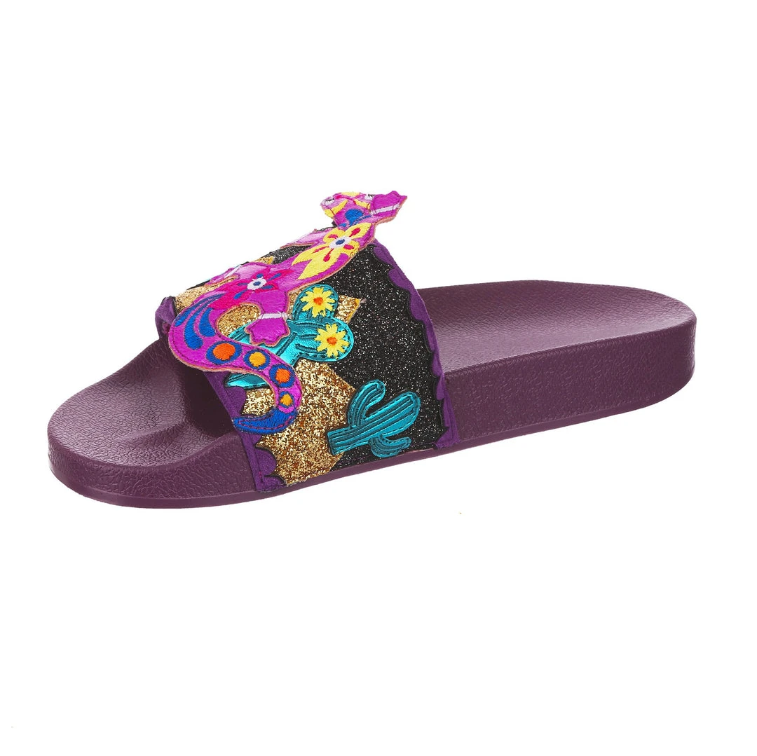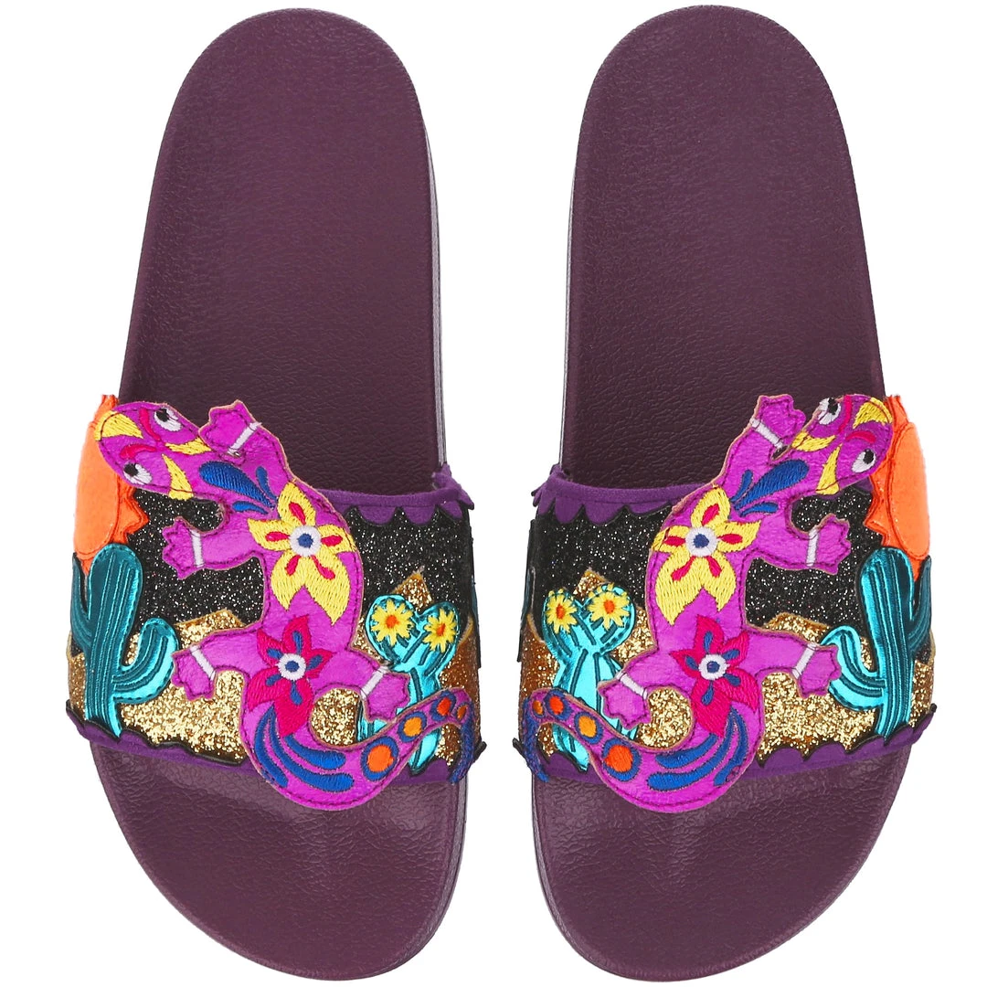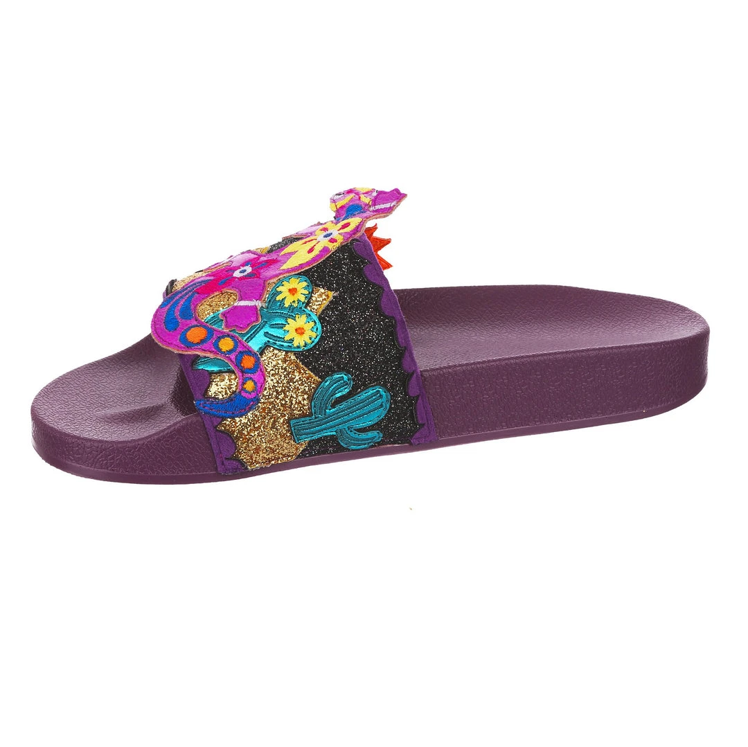 Want to slip in to something so salamader cool? These slides are ready to get up and gecko whenever you are! The aubergine coloured comfy footbed is combined with bright and eyecatching lizard applique, complete with a cactus and sun too! So what are you waiting for? You know you iguana have them in your life!