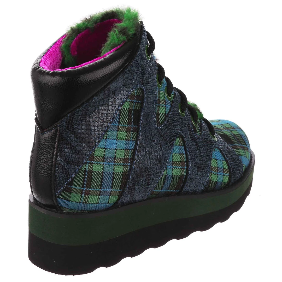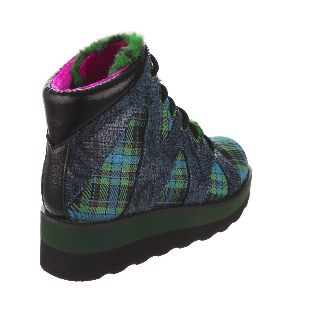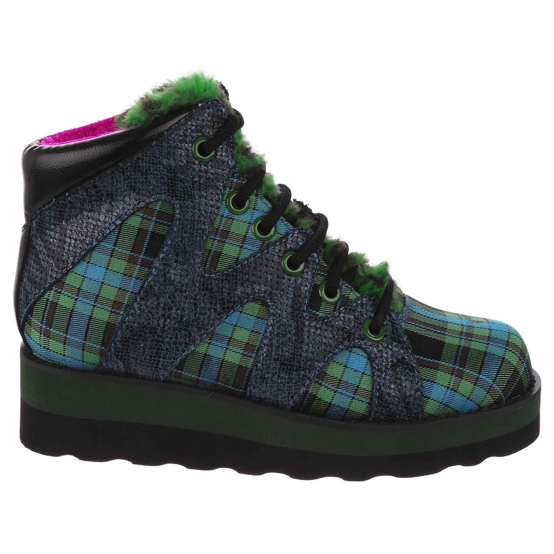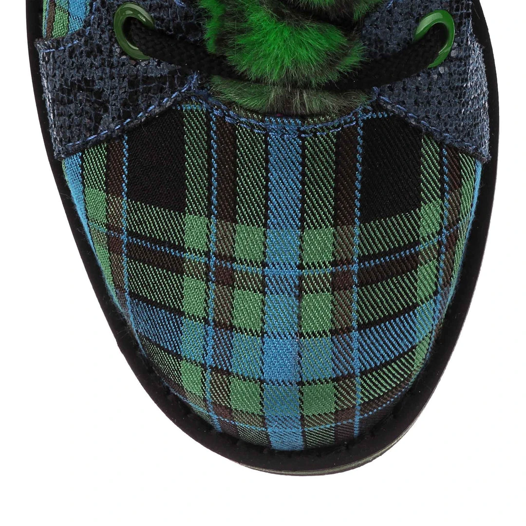 Lace-up into these awesome high tops! A striking dark blue snakeskin texture crisscrosses along the blue and green tartan upper, complemented by the tonal stacked sole and fun faux fur tongue! The perfect way to inject some texture and cool into your outfit!