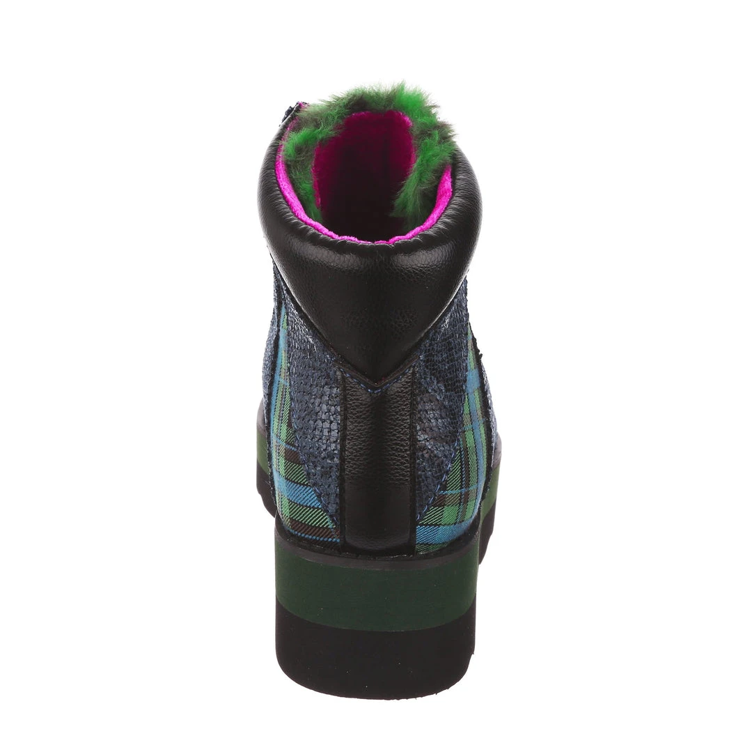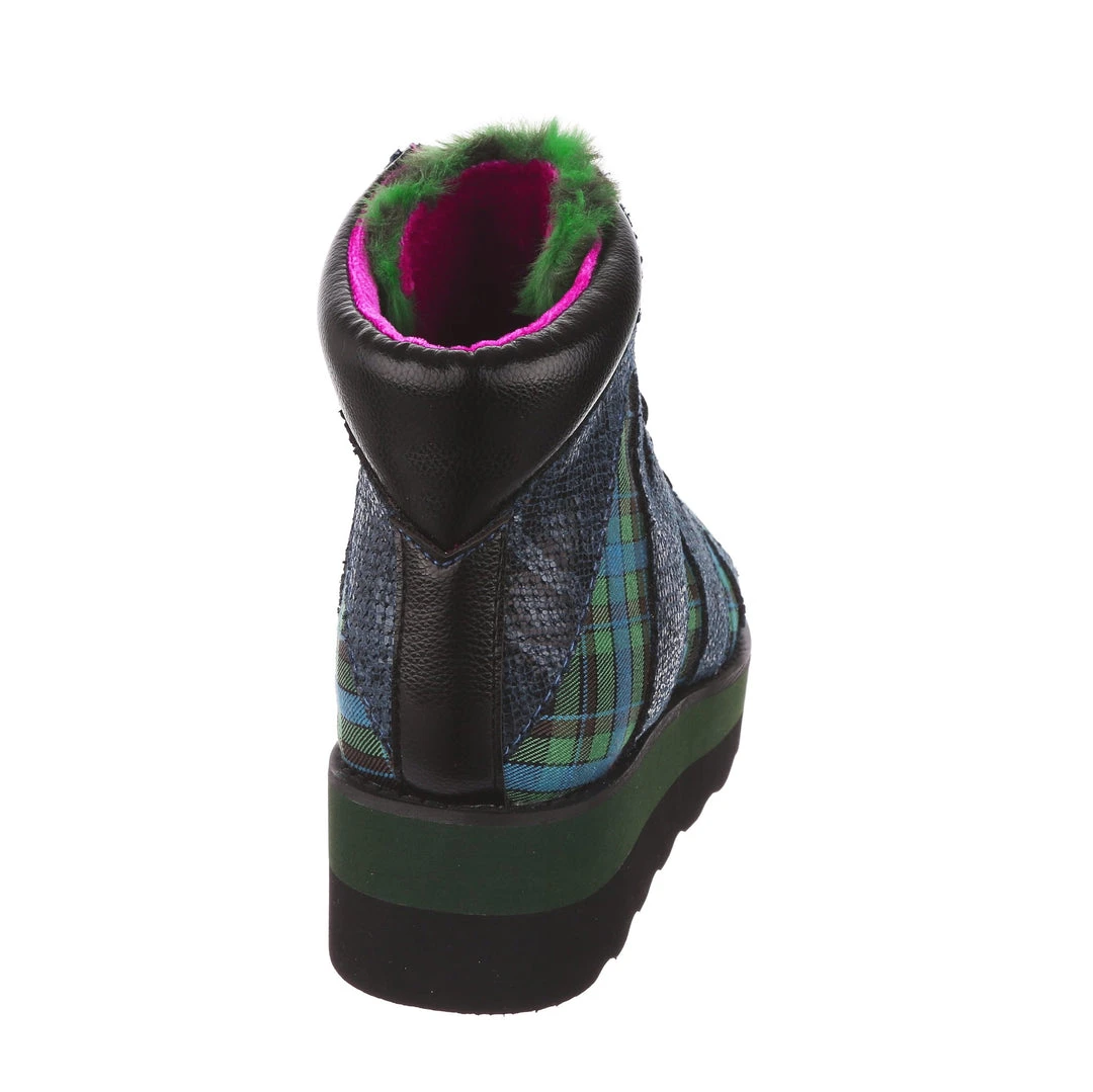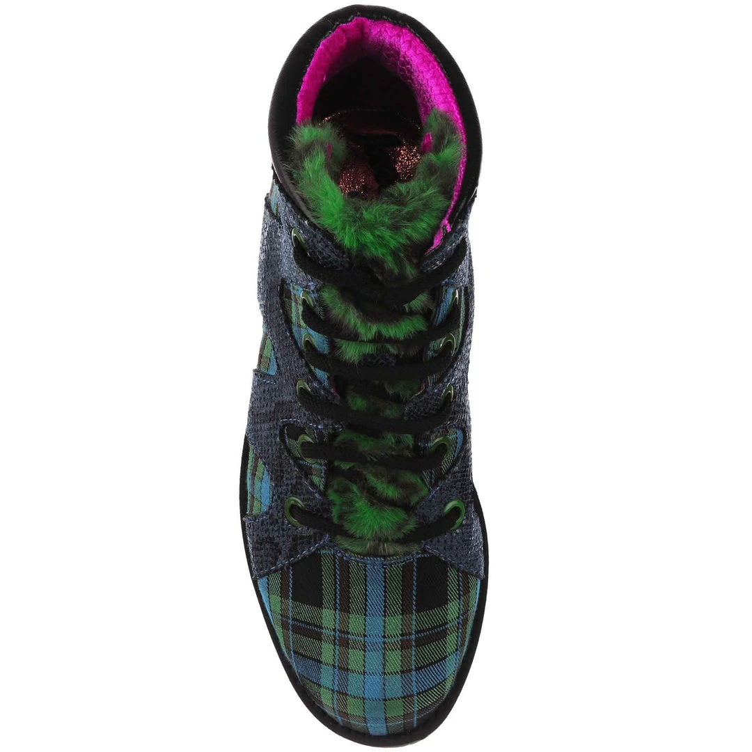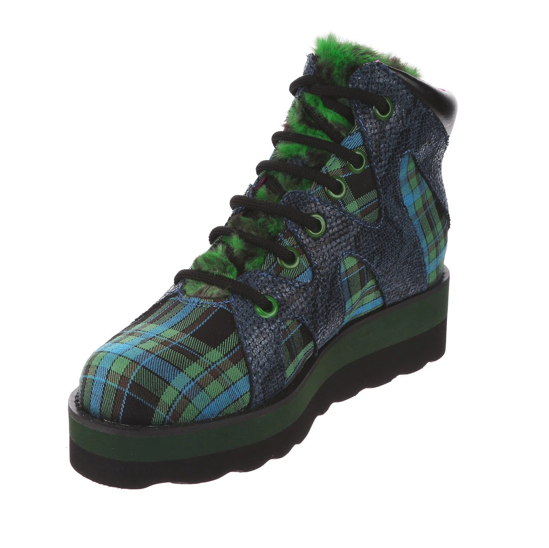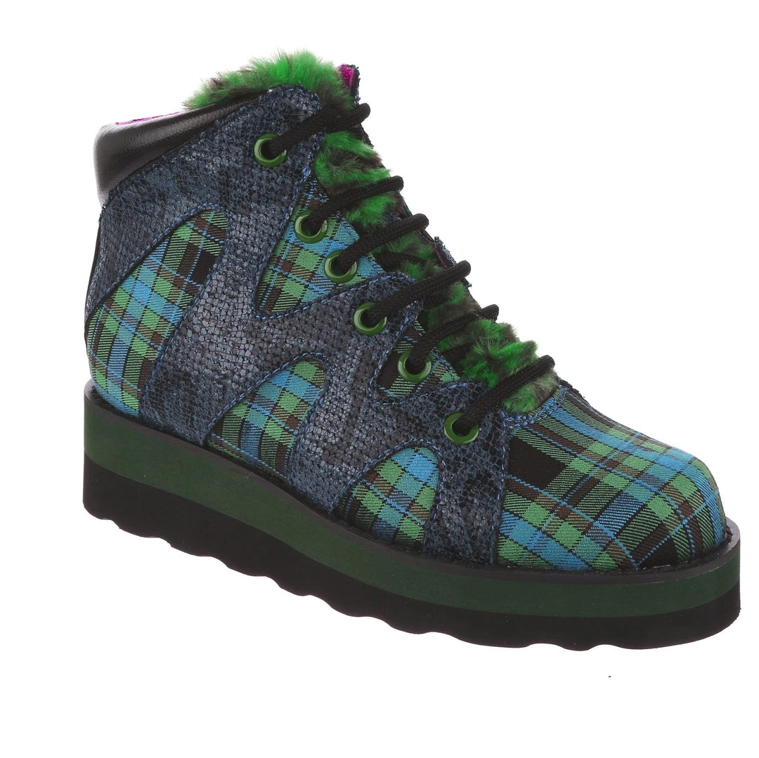 Lace-up into these awesome high tops! A striking dark blue snakeskin texture crisscrosses along the blue and green tartan upper, complemented by the tonal stacked sole and fun faux fur tongue! The perfect way to inject some texture and cool into your outfit!