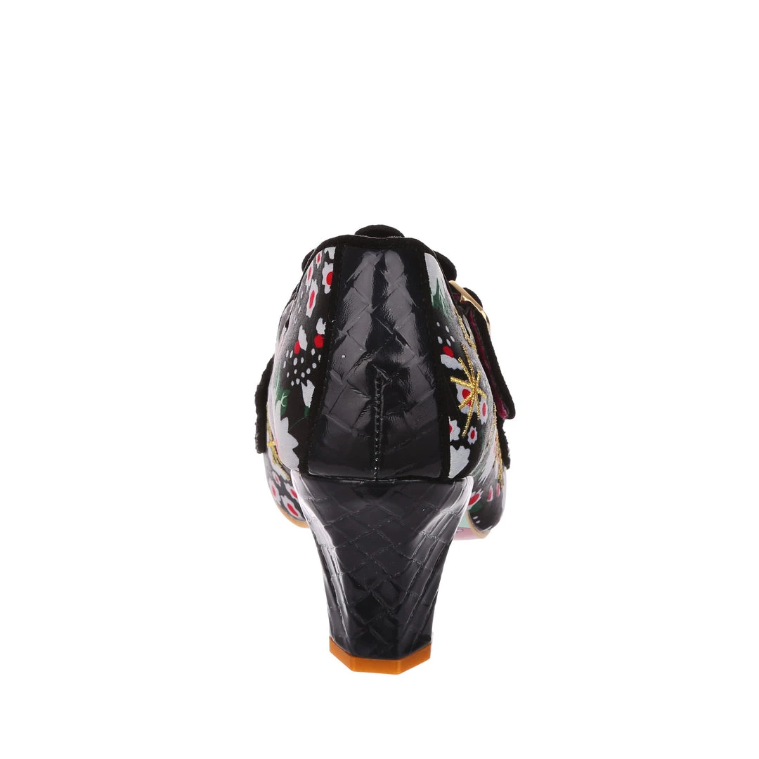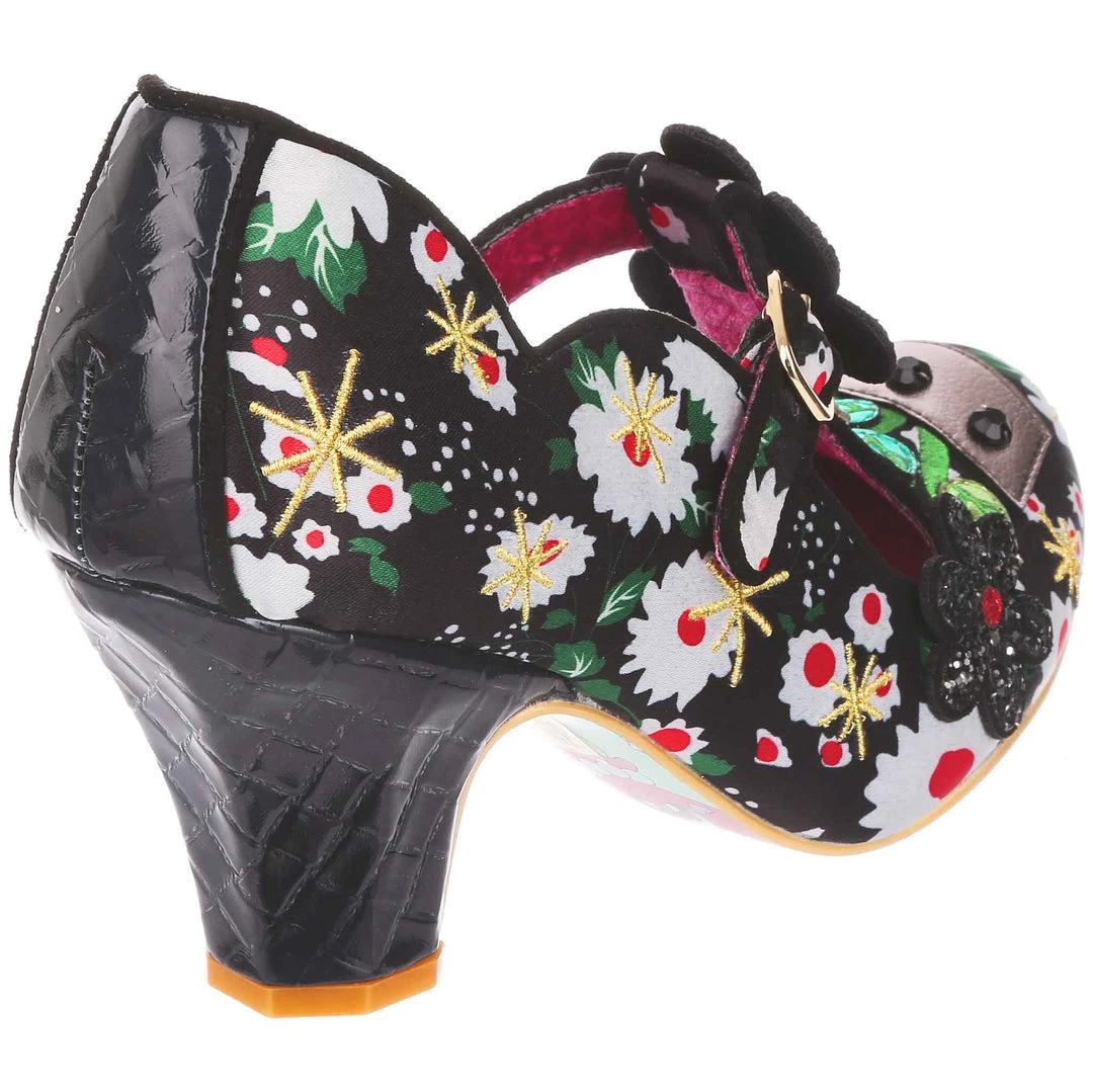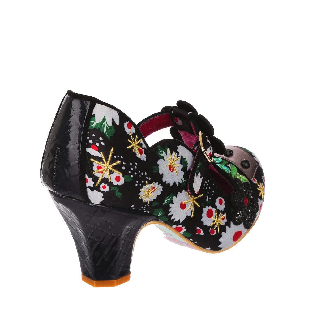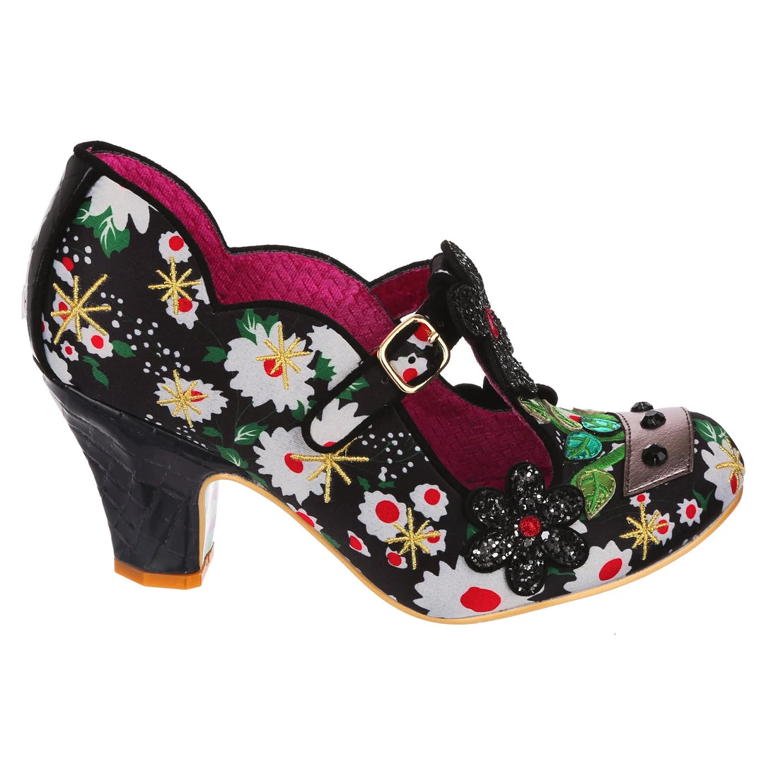 Potted and perfect, these house plant-tastic pretties are here for all you green fingered lovelies! A fabulous T-Bar strap is adorned with a fantastic beaded flower, stem and even a little pot on the toe! The main fabric is a sumptuous black based floral, which is paired with a matching black metallic texture on the heel and piping! Add these floral mid heels to your collection today!