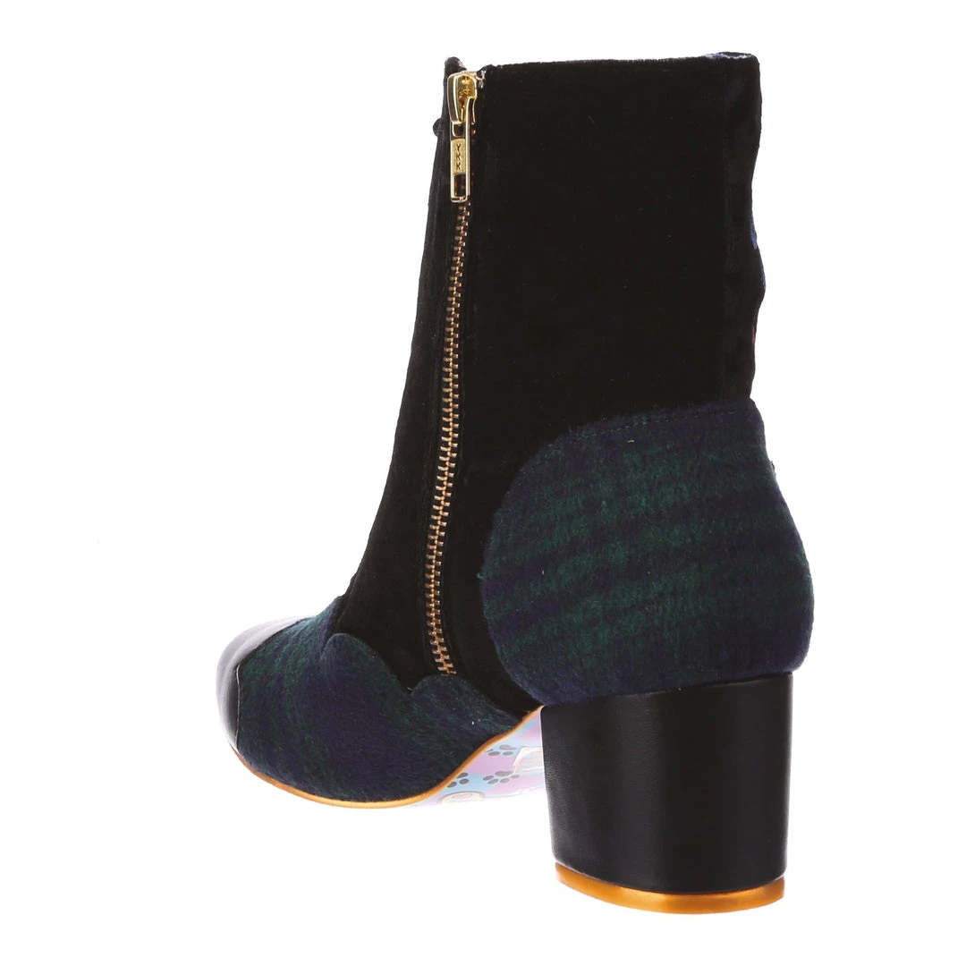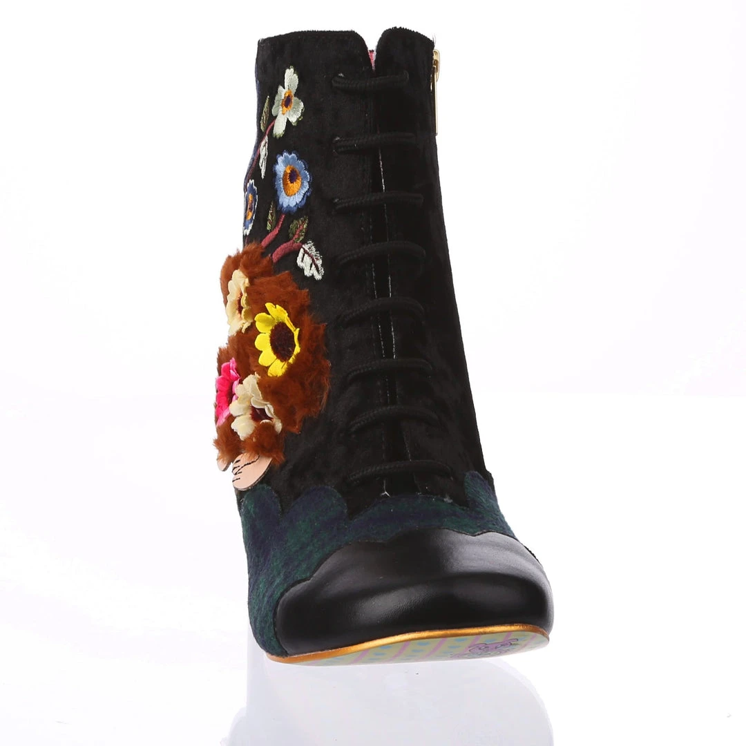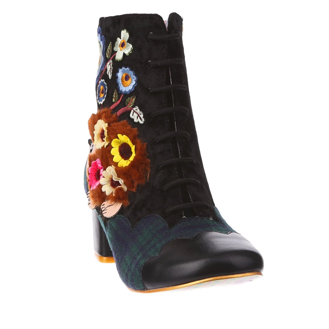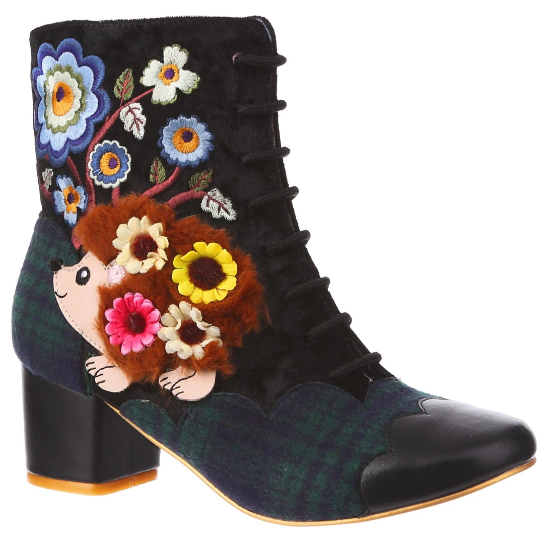 Wander through the forest and say hello to the wilderness! These adorable boots feature a 3D fluffy hedgehog, statement flowers and gorgeous floral embroidery. The fabulous blue tones of the flowers contrast beautifully to the deep black velvet on the upper, and are harmonious with the cosy green tone plaid which wraps around the rest of the boot. Lace up these beauties and have some fun today!