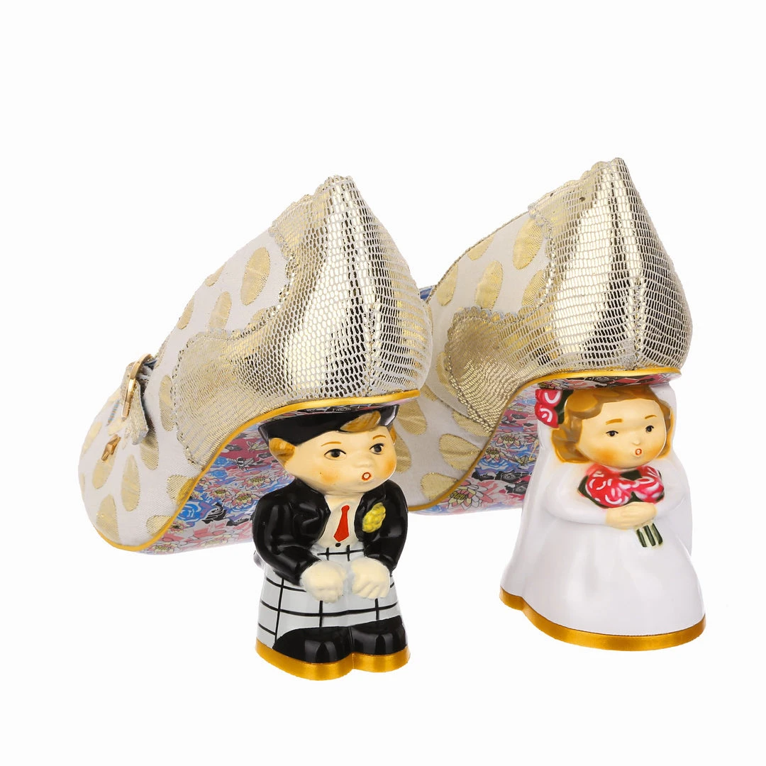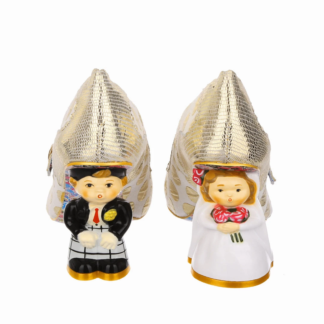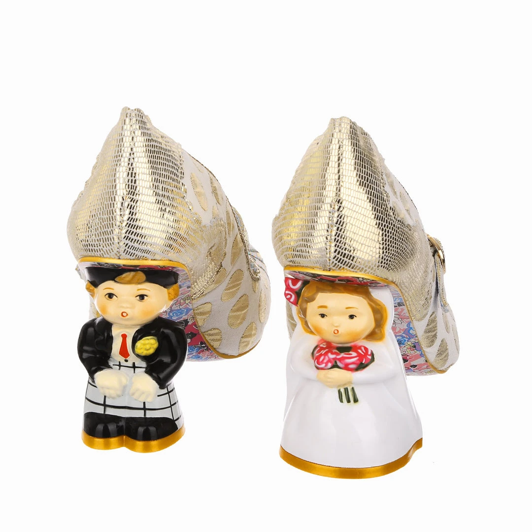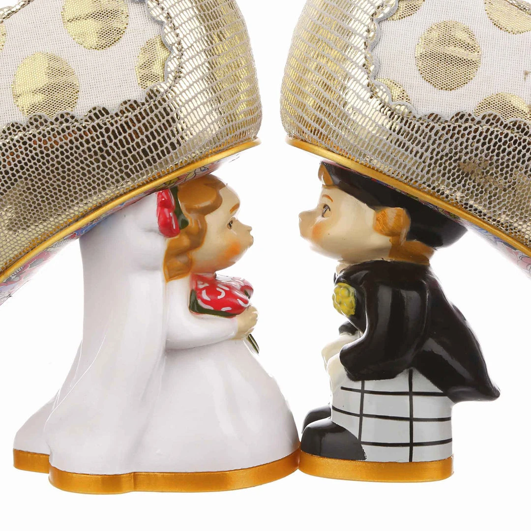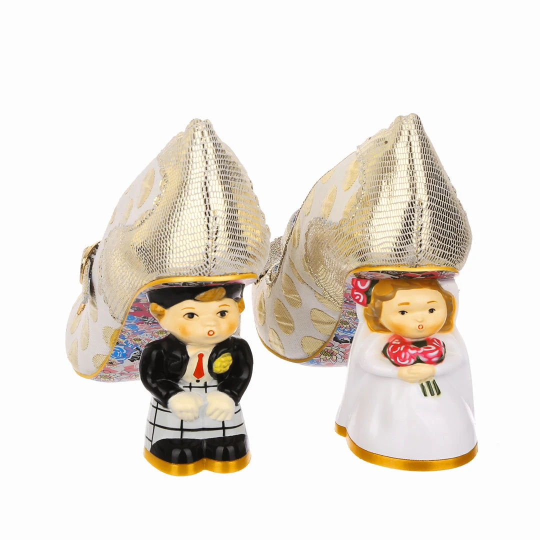 Say I love you with your shoes, literally! Wow guests as you walk down the aisle with bride and groom heels that are ready to say I do! Accented with matching metallic gold dots, edging and Mary-Jane strap, that fastens with a buckle. The ‘I ♡ You’ on the toe is a combination of shiny gold studs, appliquéd gold glitter heart and gold thread embroidery, covering all textural bases! The blushing bride and dapper groom heels really make these shoes stand out from the crowd, both are puckering up for their first kiss as Mr and Mrs. Make sure everyone knows how you feel with these stunning wedding shoes!