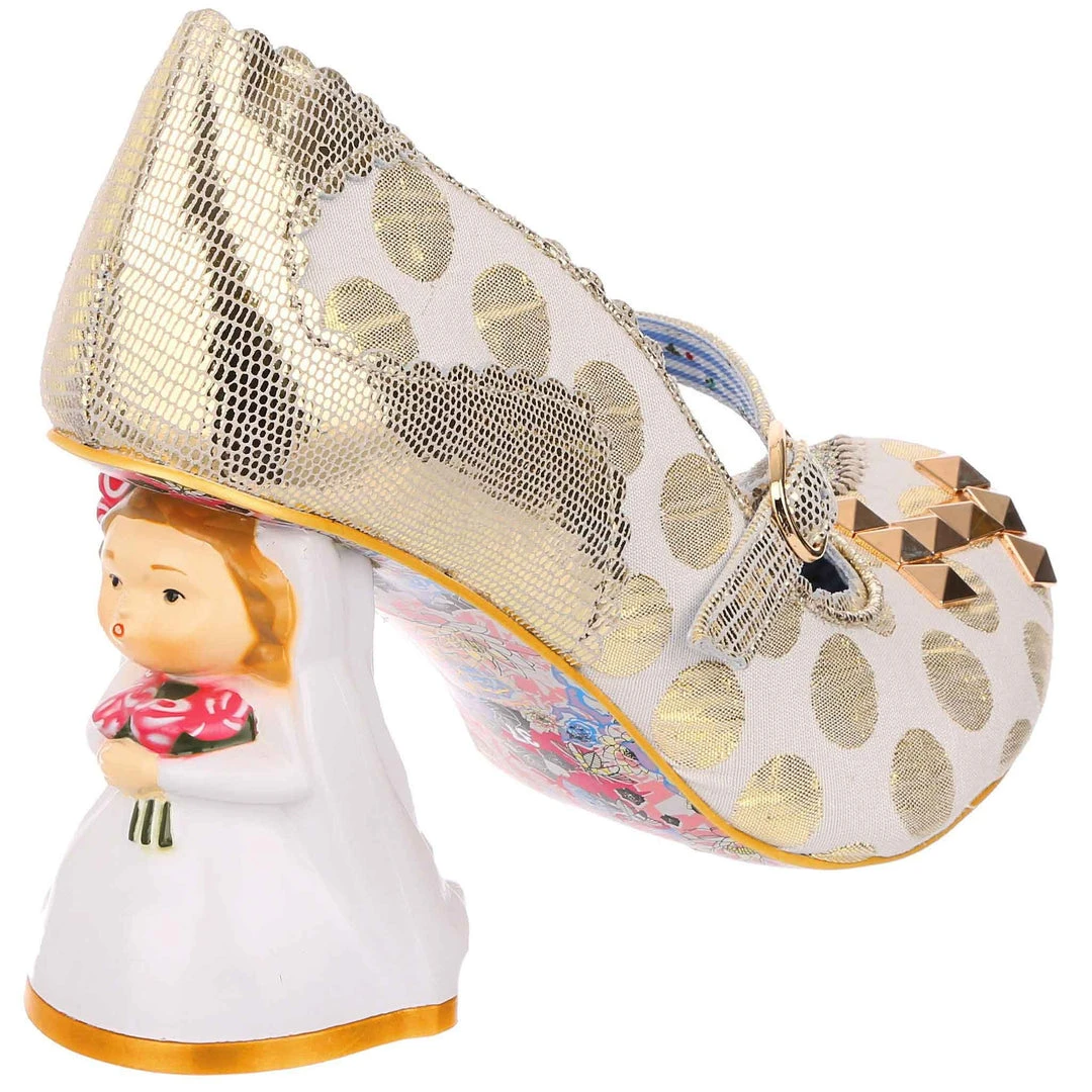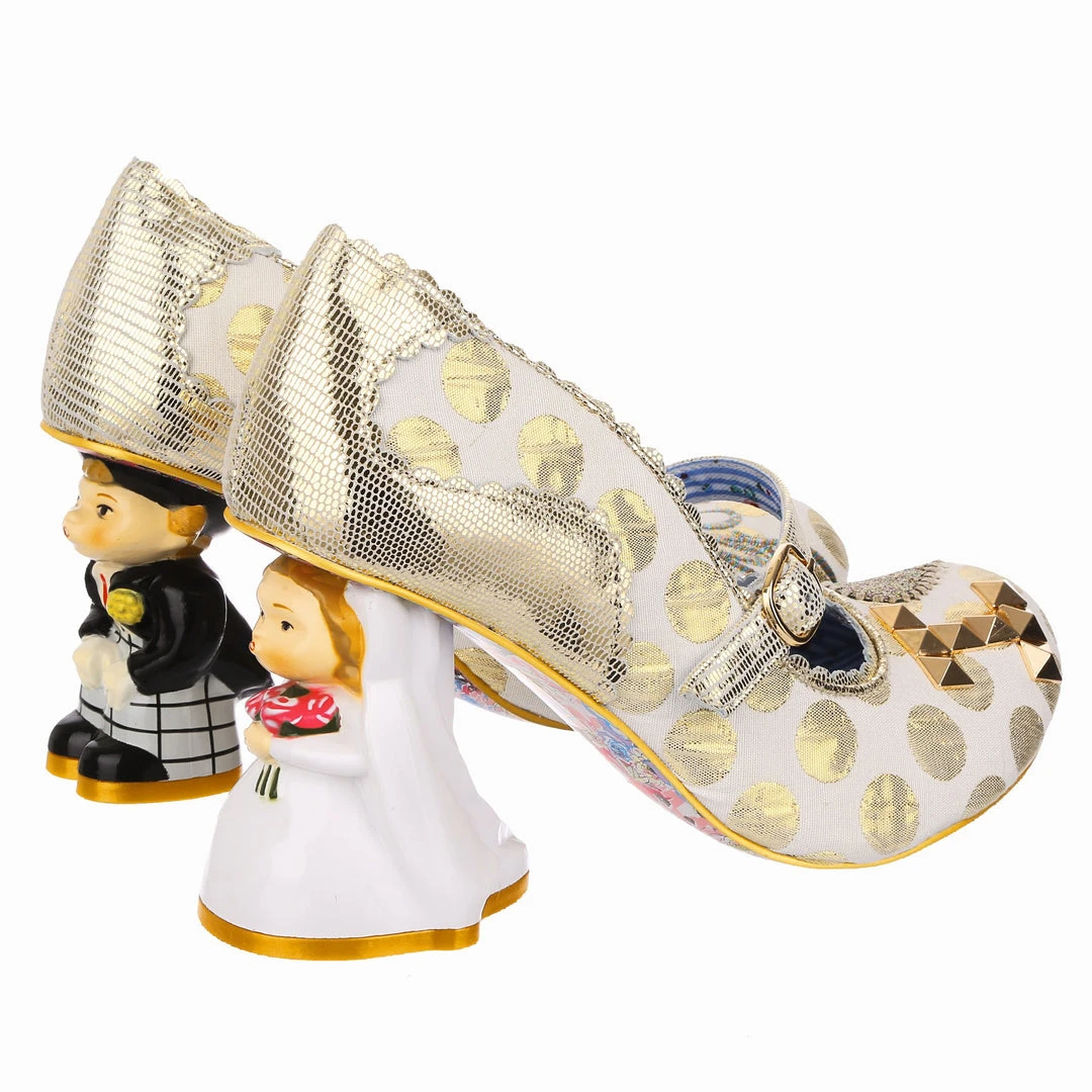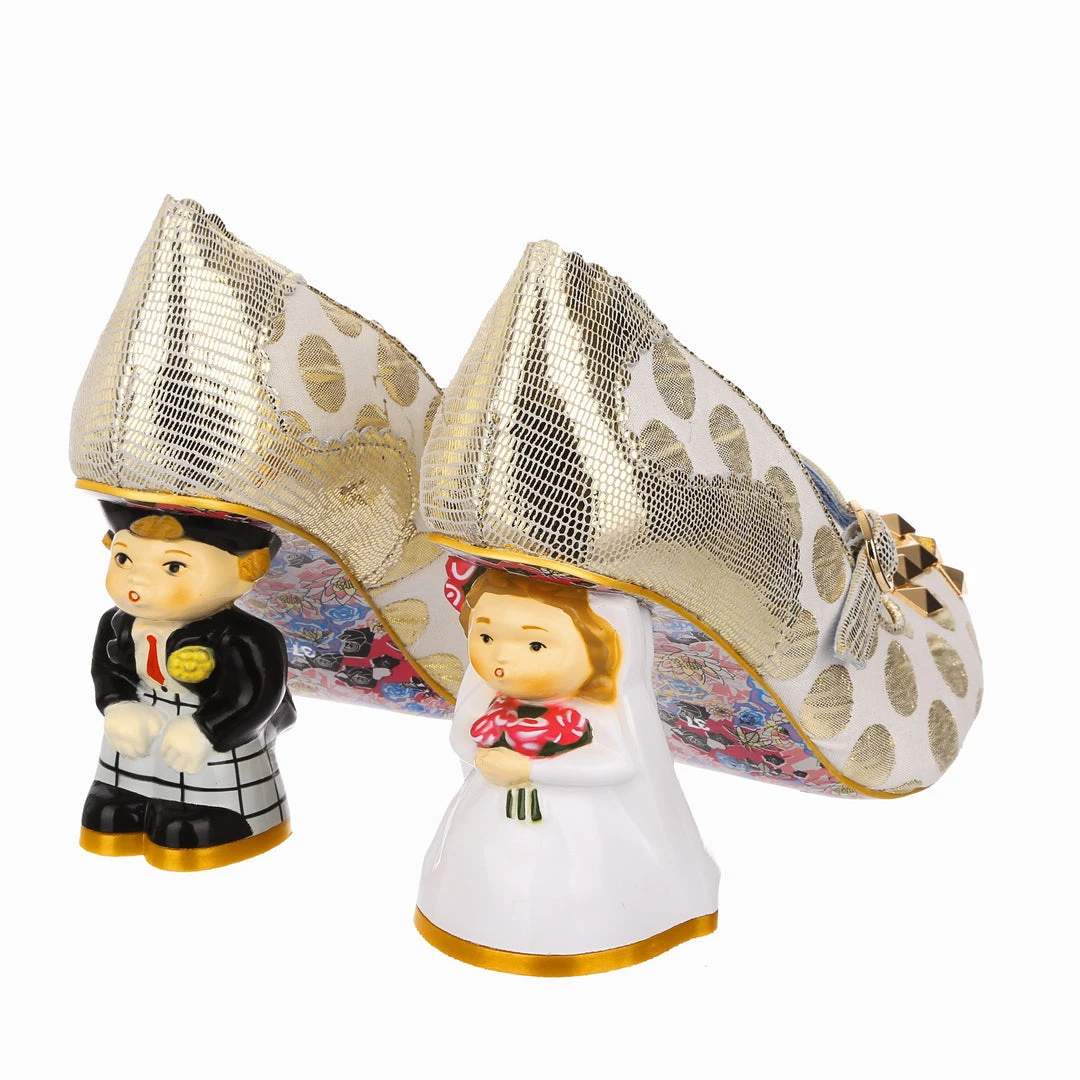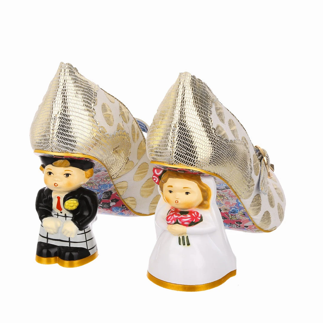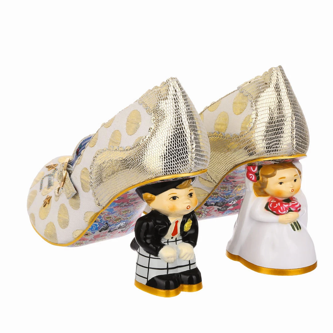 Say I love you with your shoes, literally! Wow guests as you walk down the aisle with bride and groom heels that are ready to say I do! Accented with matching metallic gold dots, edging and Mary-Jane strap, that fastens with a buckle. The ‘I ♡ You’ on the toe is a combination of shiny gold studs, appliquéd gold glitter heart and gold thread embroidery, covering all textural bases! The blushing bride and dapper groom heels really make these shoes stand out from the crowd, both are puckering up for their first kiss as Mr and Mrs. Make sure everyone knows how you feel with these stunning wedding shoes!