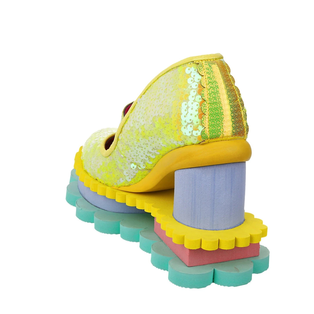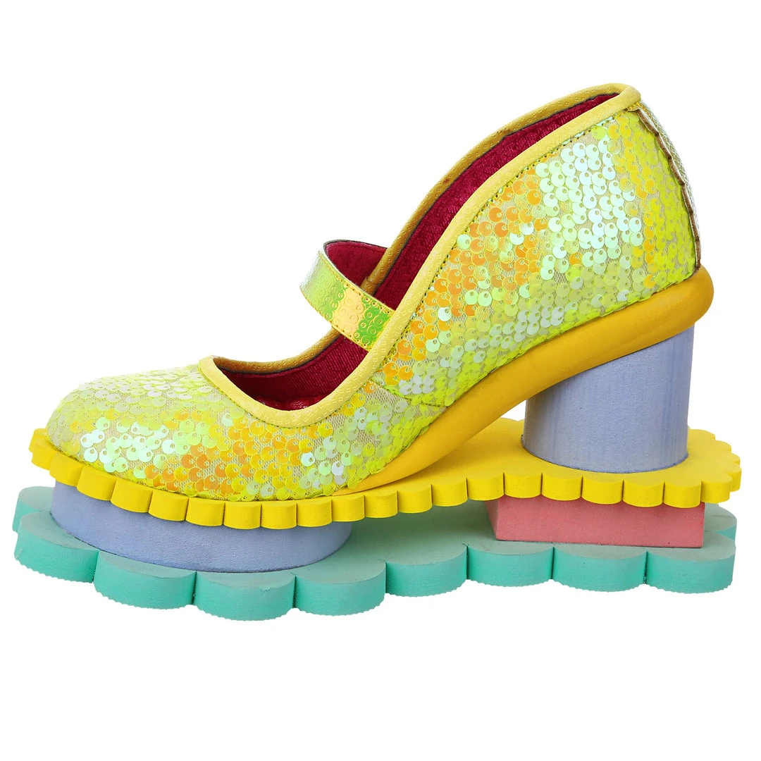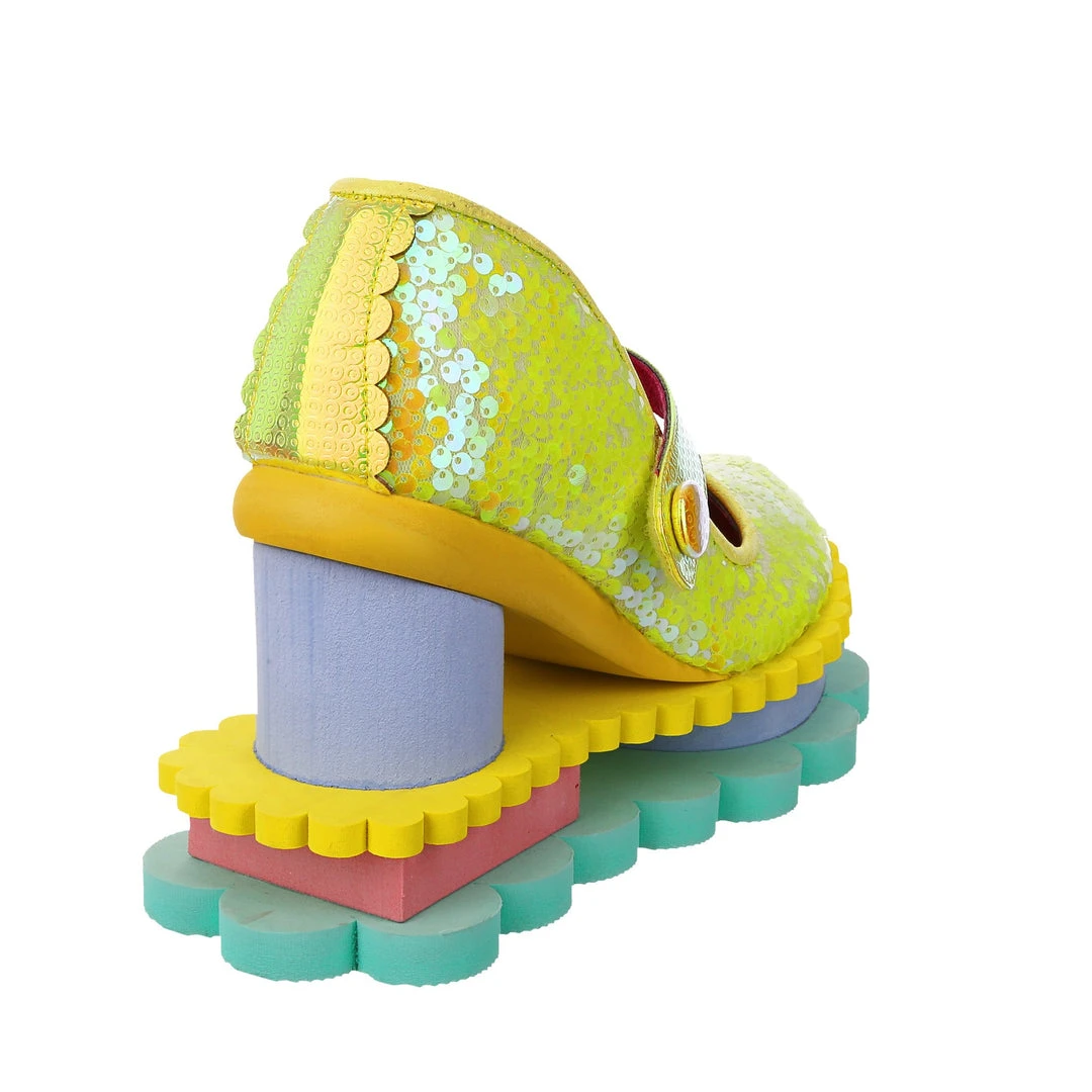 Give your outfit a SPLASH of colour in these special somethings! Bright and iridescent yellow sequins on the upper are combined with a matching iridescent Mary Jane strap and piping to give an overall appearance of magic! The eye-catching wedge heel is made from block colours in gorgeous pastel cookie-cutter inspired shapes – the perfect tasty addition to your wardrobe!
