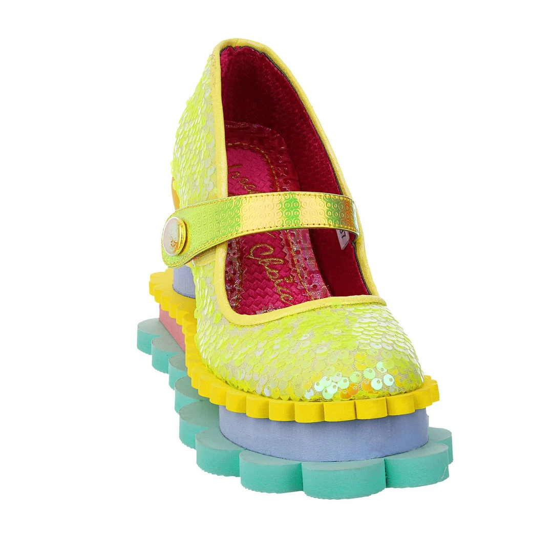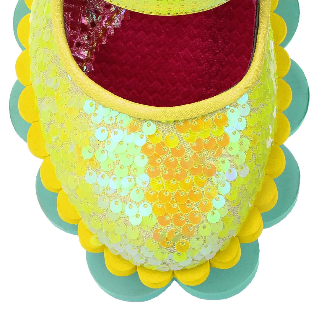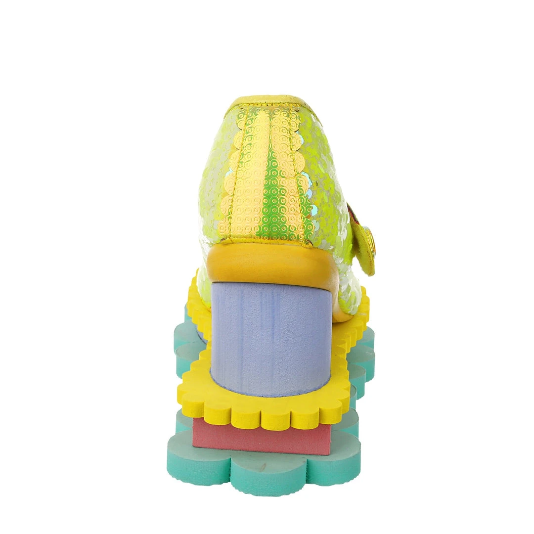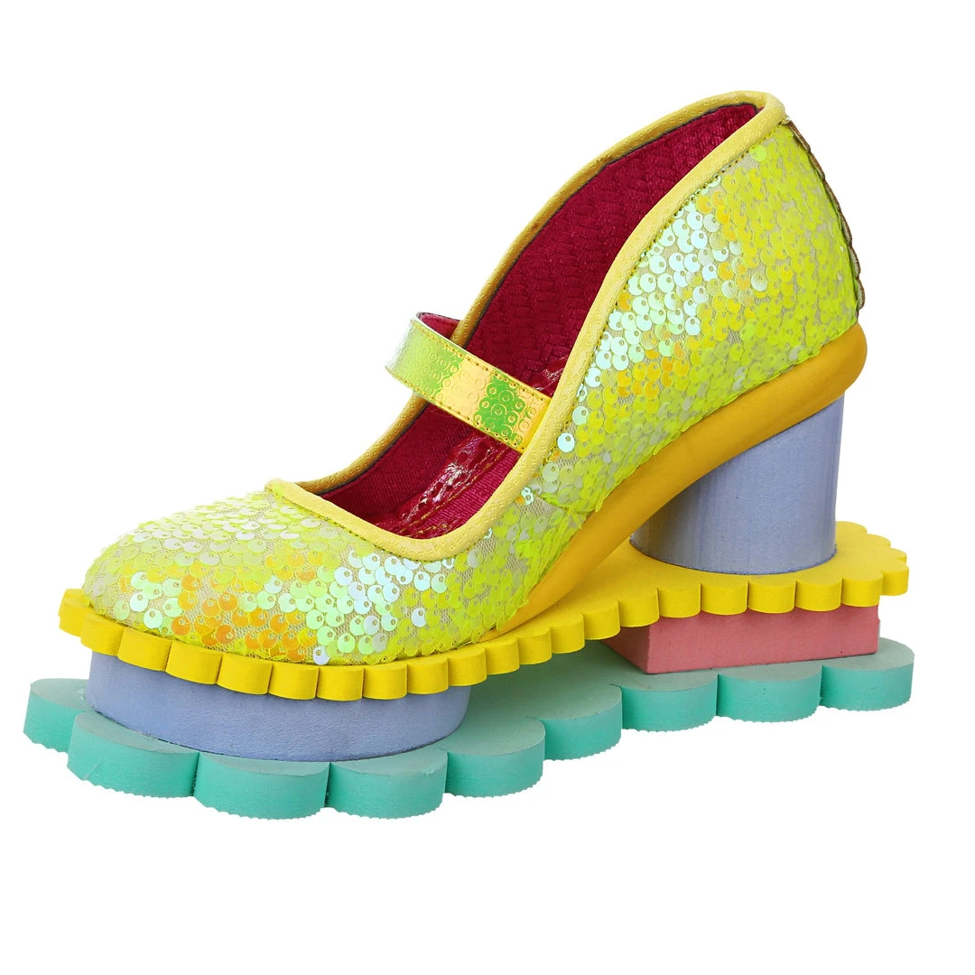 Give your outfit a SPLASH of colour in these special somethings! Bright and iridescent yellow sequins on the upper are combined with a matching iridescent Mary Jane strap and piping to give an overall appearance of magic! The eye-catching wedge heel is made from block colours in gorgeous pastel cookie-cutter inspired shapes – the perfect tasty addition to your wardrobe!
