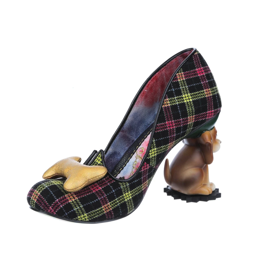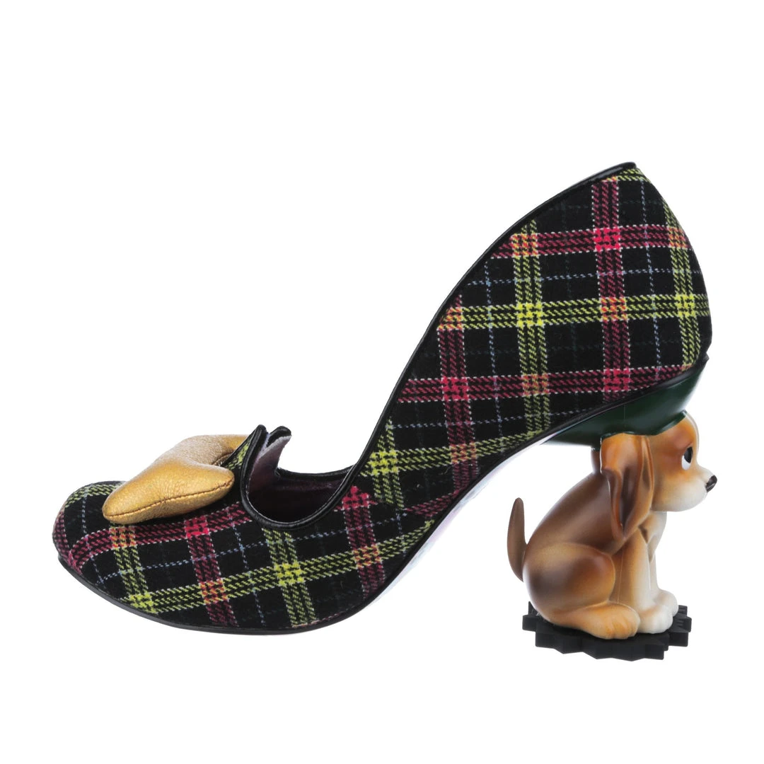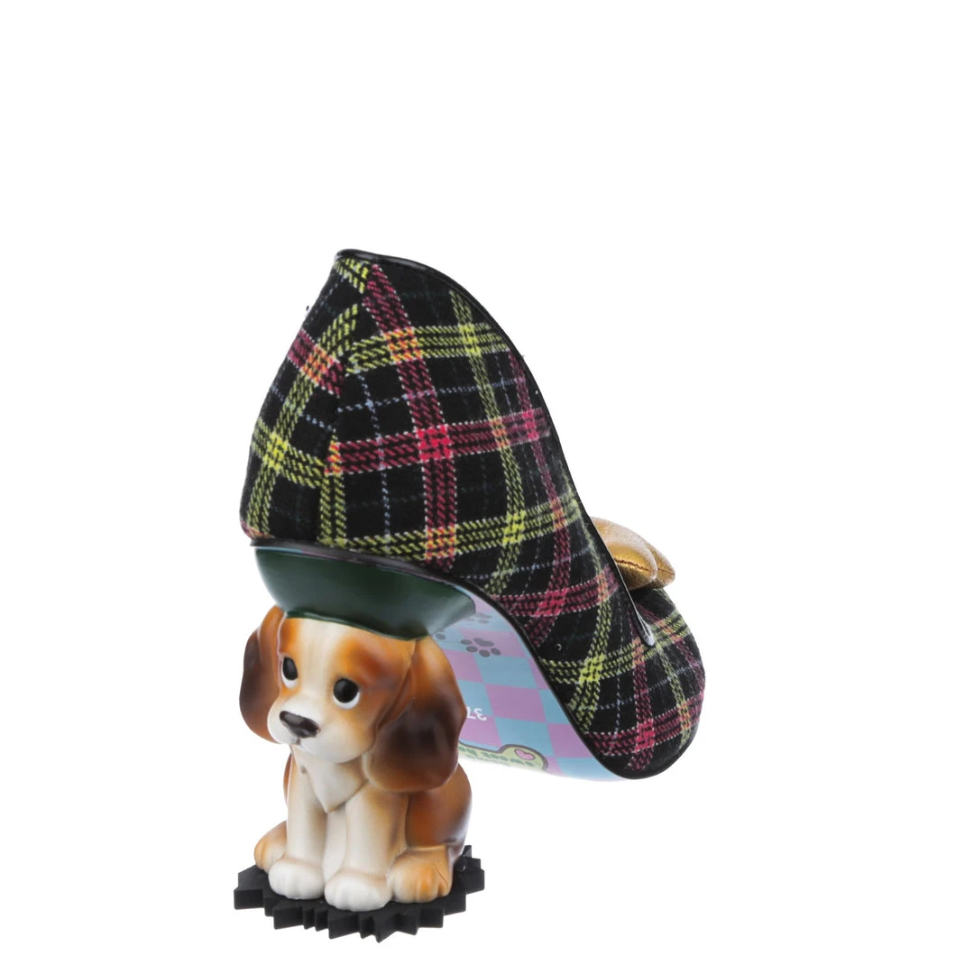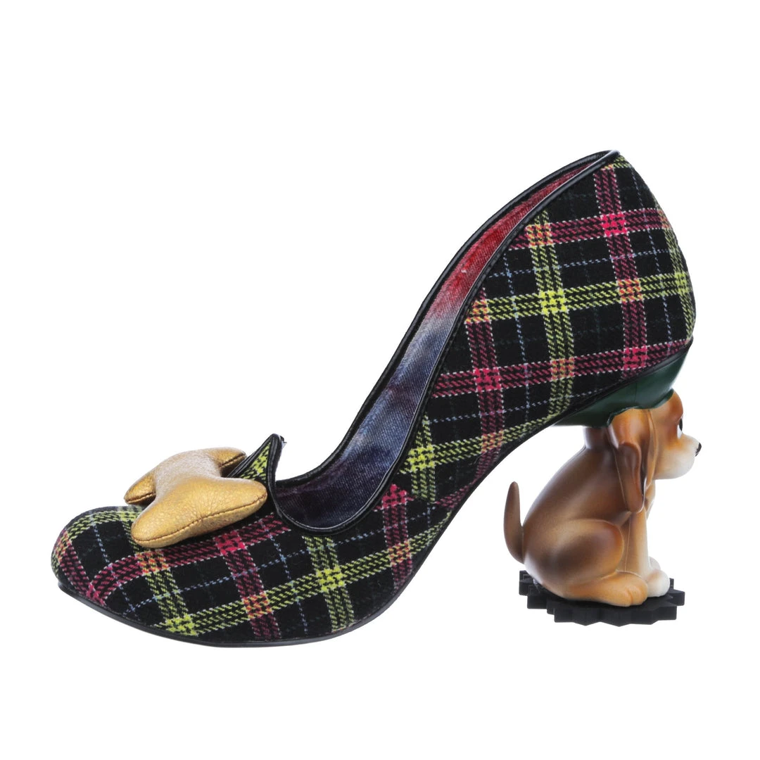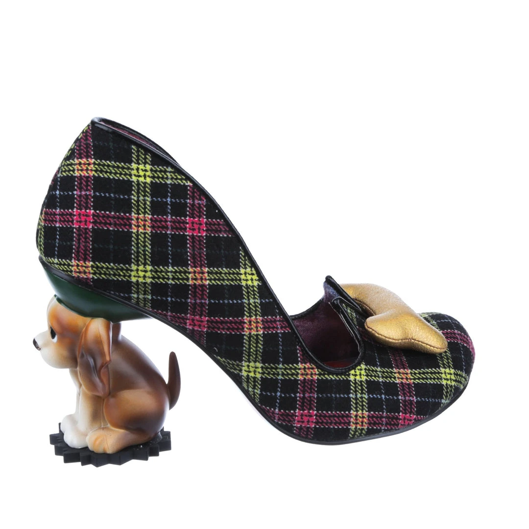 Feel like a dog with a bone in these statement court shoes! Featuring an adorable character heel shaped like a cute dog, these black, red and yellow plaid pretties are sure to make you smile! A classic IC upper shape, topped off with a plush gold bone on the toe – these shoes are sure to cause a stir at the dog park! Take them for walkies today!