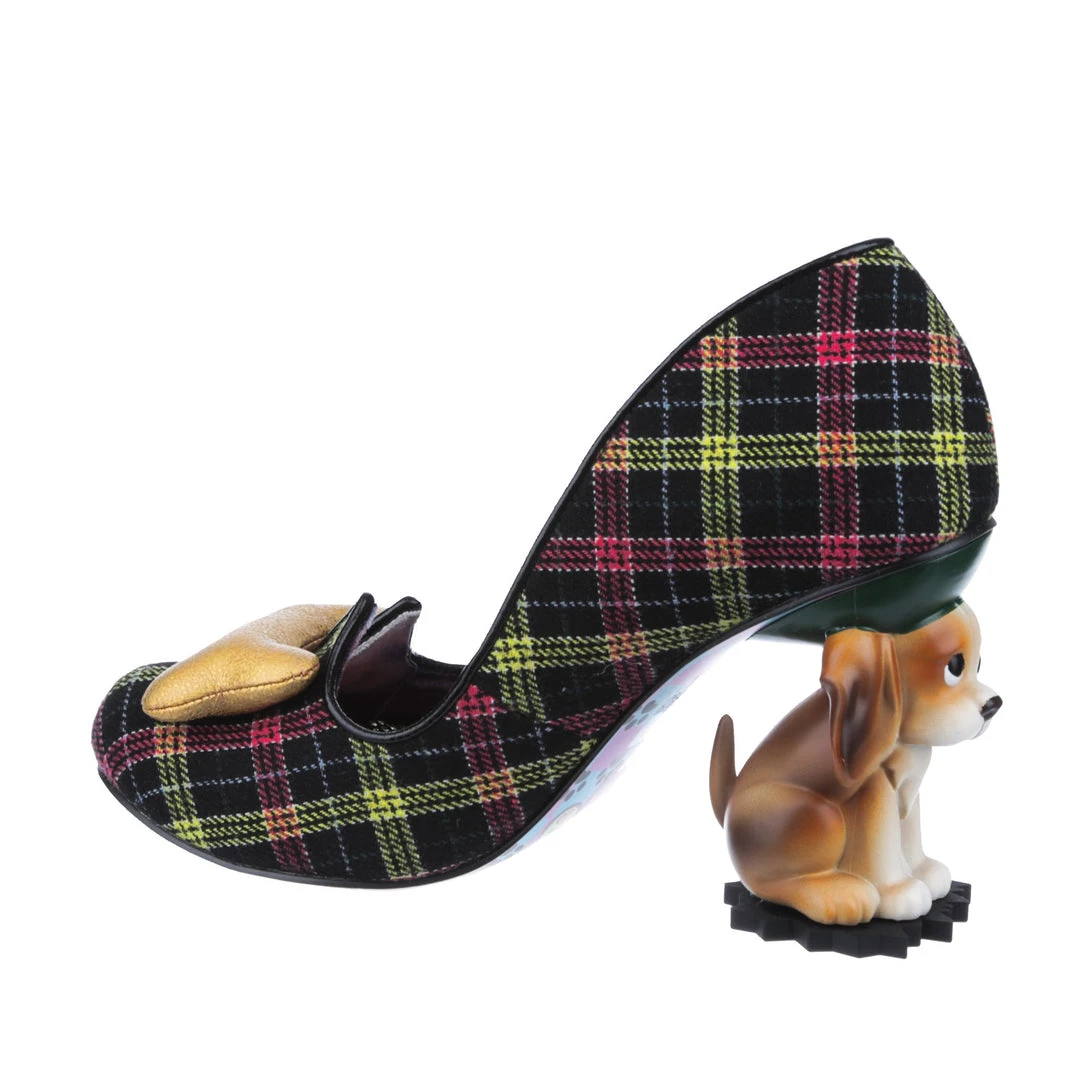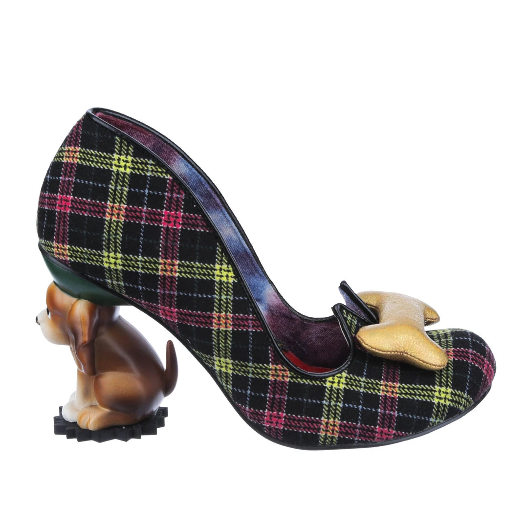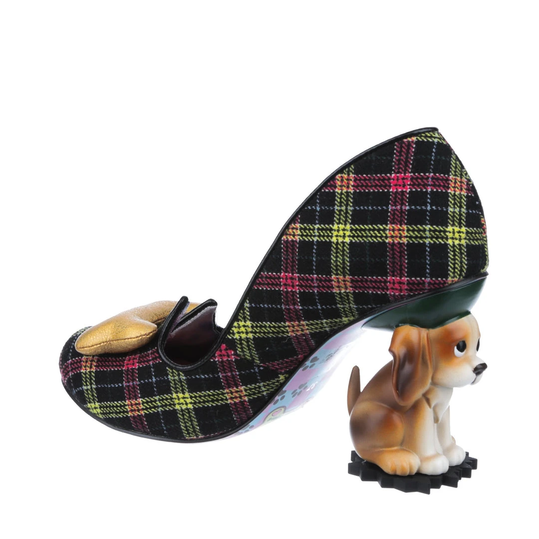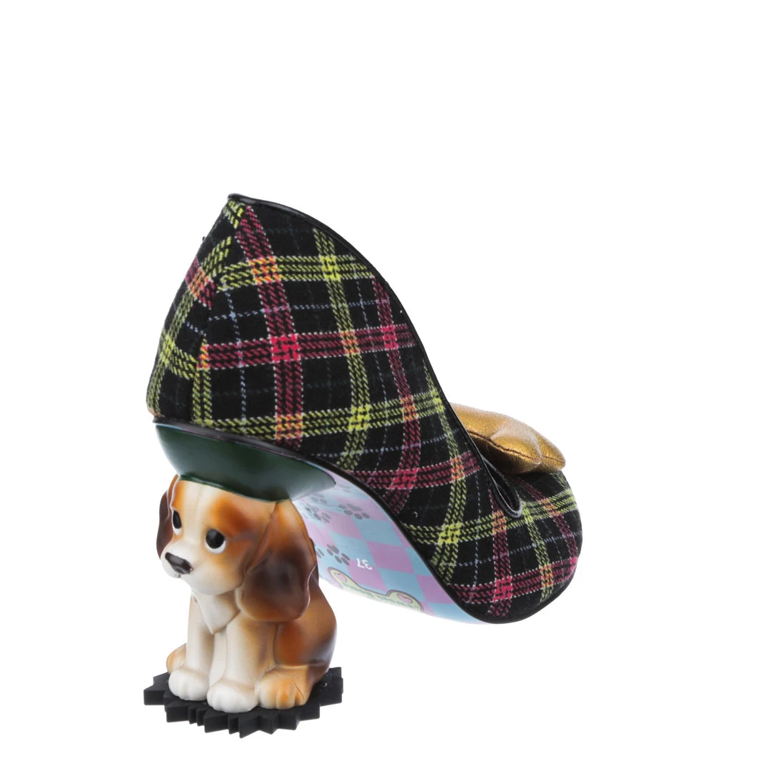 Feel like a dog with a bone in these statement court shoes! Featuring an adorable character heel shaped like a cute dog, these black, red and yellow plaid pretties are sure to make you smile! A classic IC upper shape, topped off with a plush gold bone on the toe – these shoes are sure to cause a stir at the dog park! Take them for walkies today!
