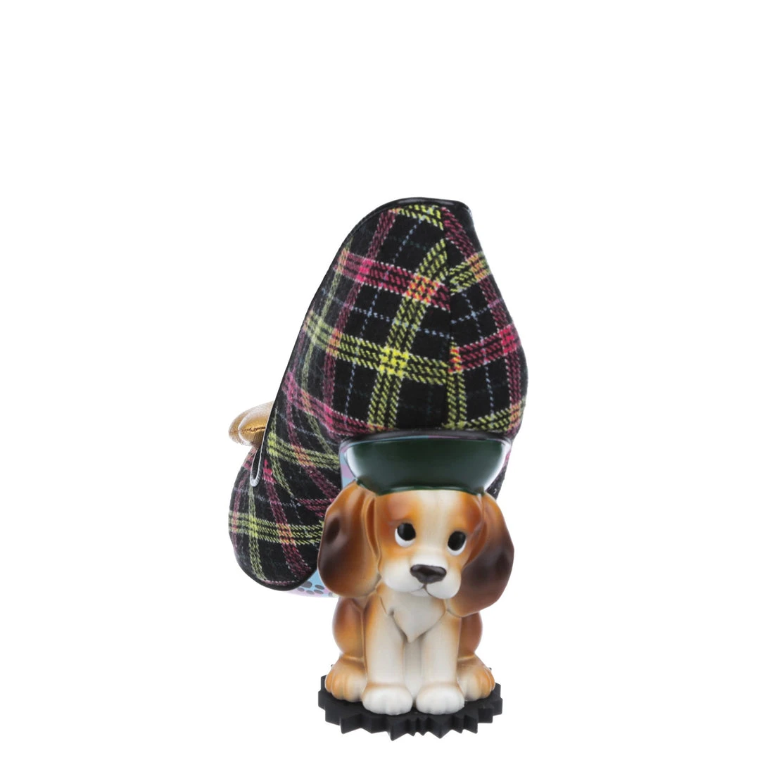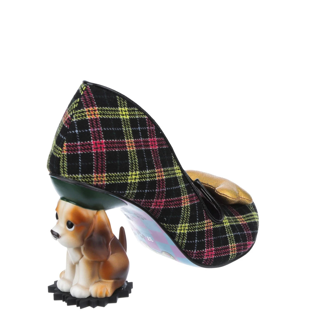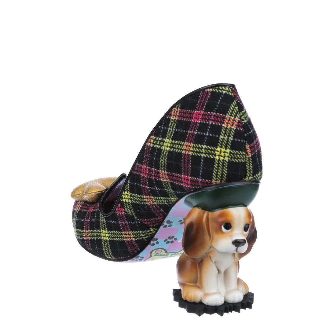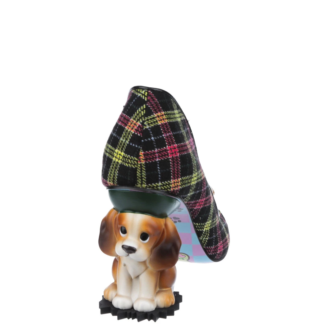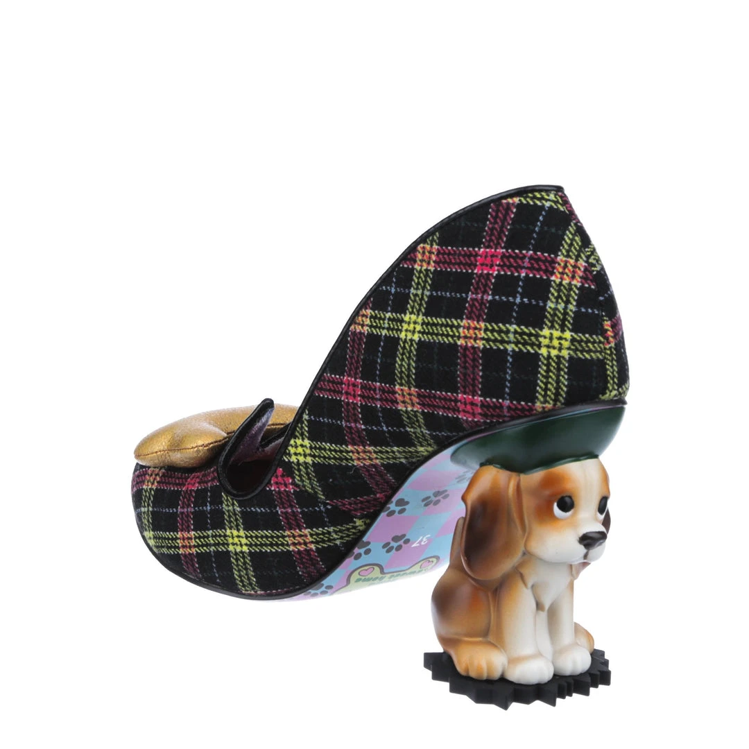 Feel like a dog with a bone in these statement court shoes! Featuring an adorable character heel shaped like a cute dog, these black, red and yellow plaid pretties are sure to make you smile! A classic IC upper shape, topped off with a plush gold bone on the toe – these shoes are sure to cause a stir at the dog park! Take them for walkies today!