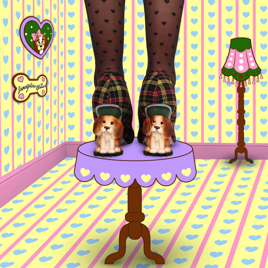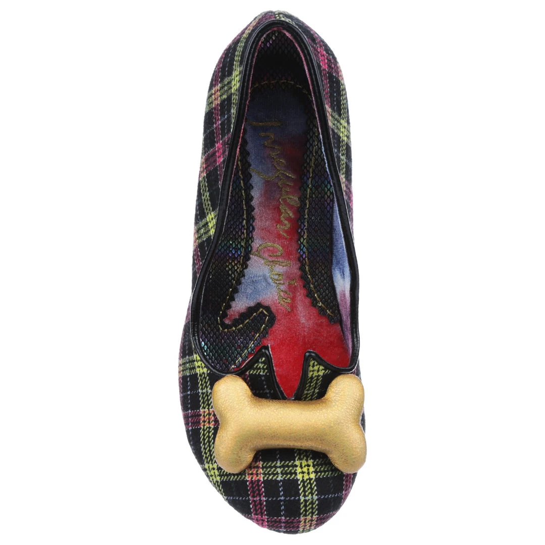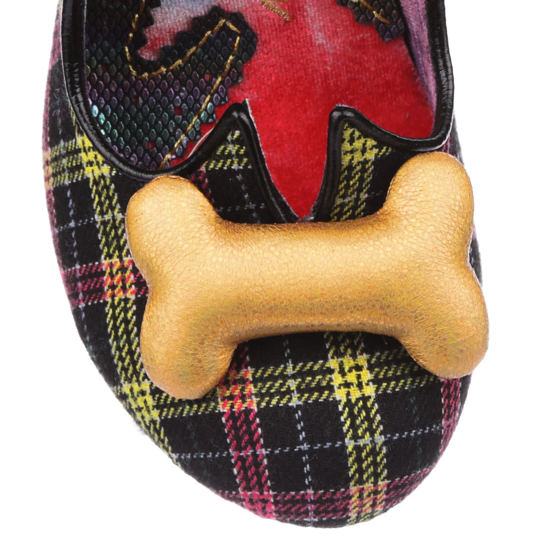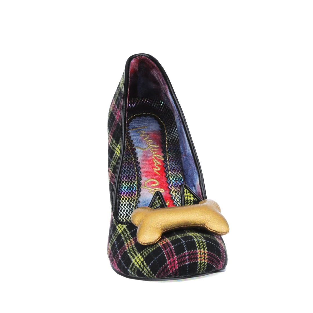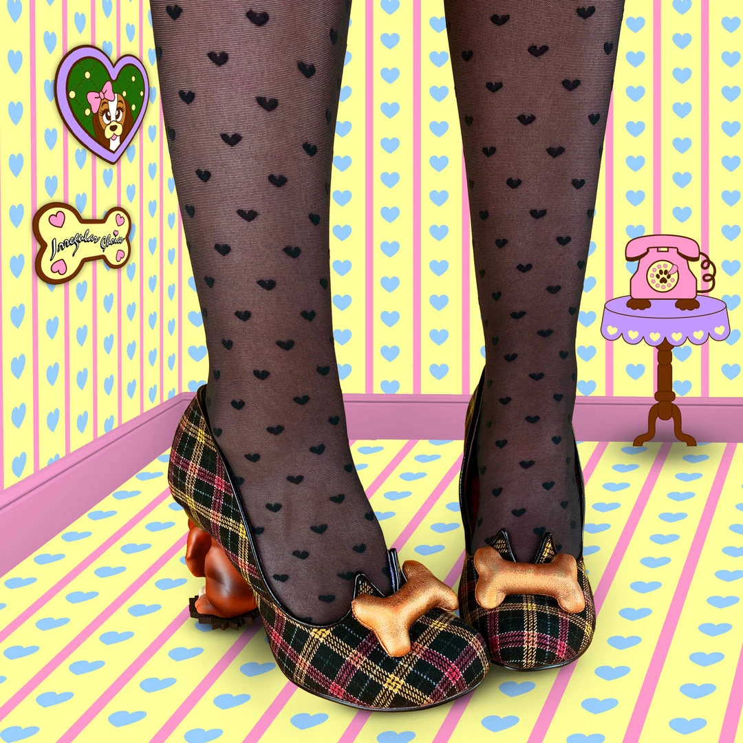 Feel like a dog with a bone in these statement court shoes! Featuring an adorable character heel shaped like a cute dog, these black, red and yellow plaid pretties are sure to make you smile! A classic IC upper shape, topped off with a plush gold bone on the toe – these shoes are sure to cause a stir at the dog park! Take them for walkies today!