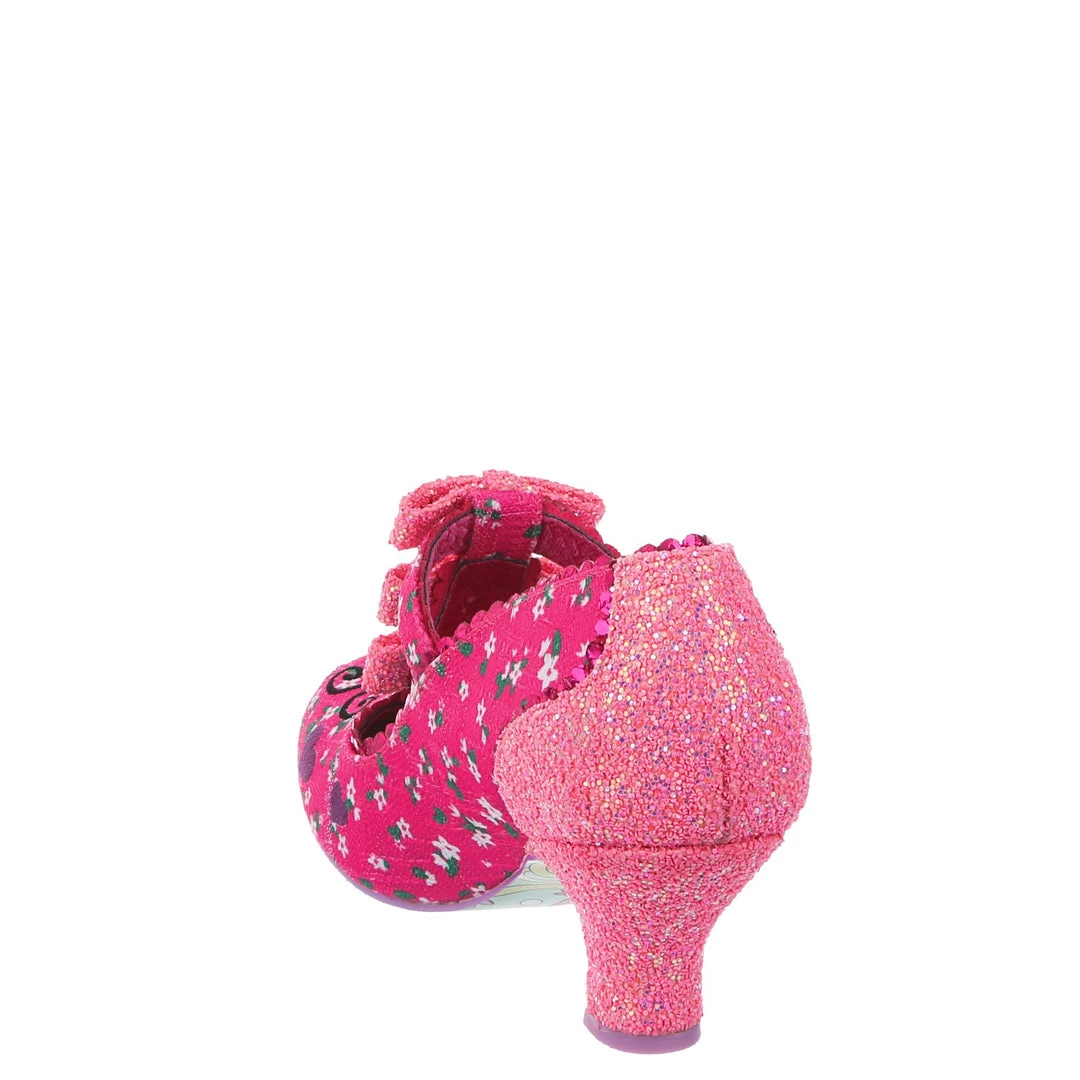 Flying along through the hedgerows its a lovely little ladybug! Swirling lines criss cross along the darling hot pink floral fabric leading to the adorable little lavender ladybug applique on the toe with matching embroidered hearts! The pink T-Bar straps are also adorned with three little pink glitter encrusted bows along the front strap! Perfect and prim, add them to your life today!