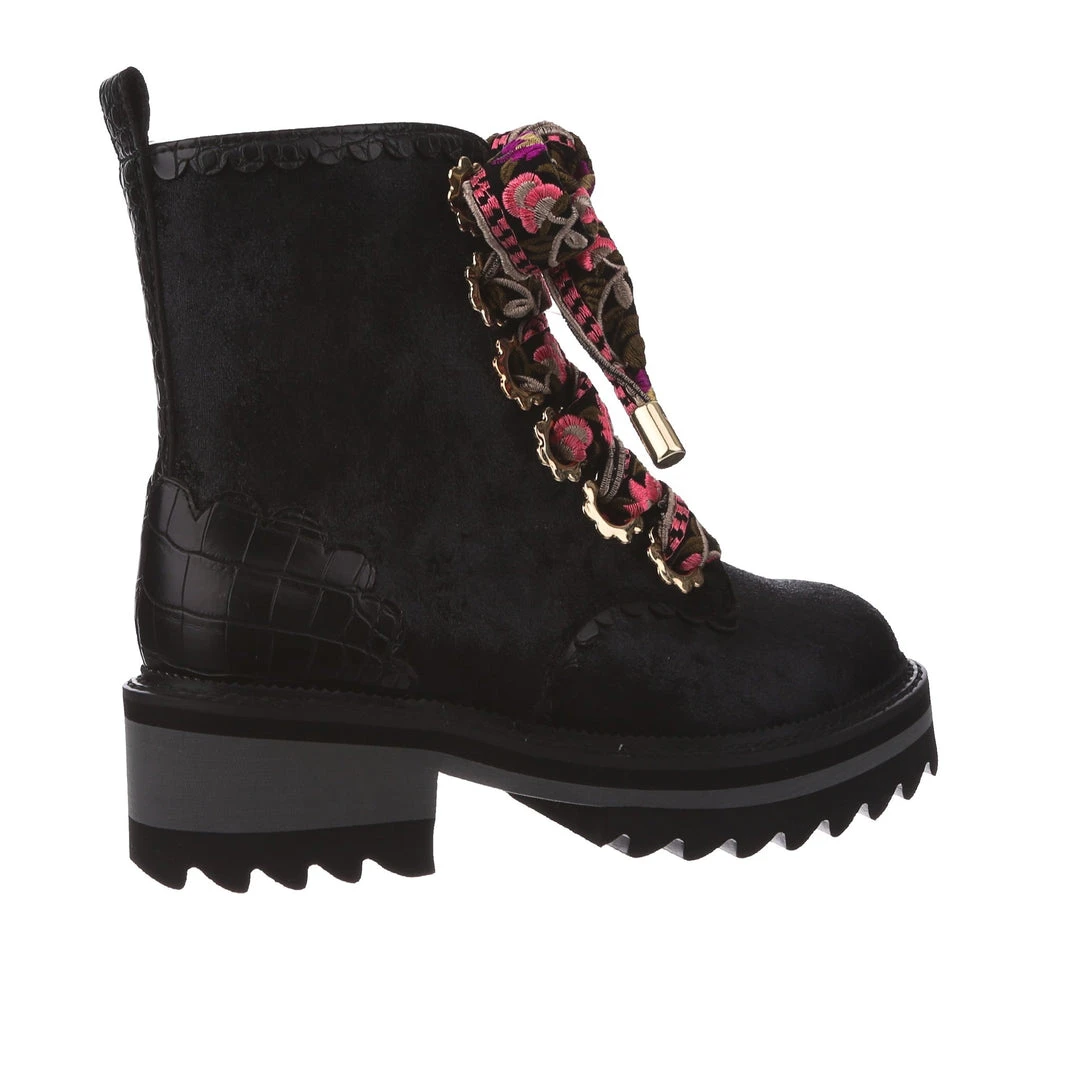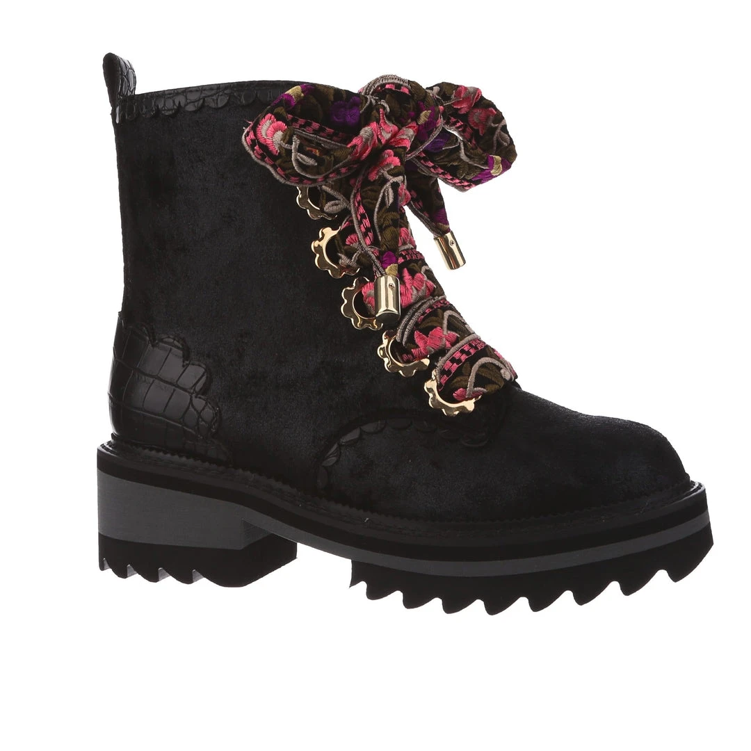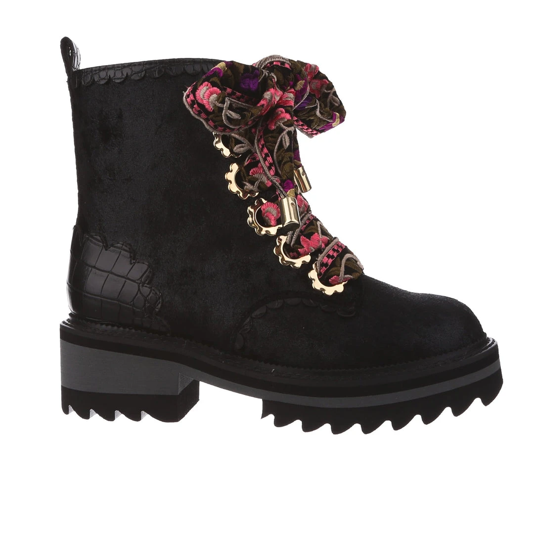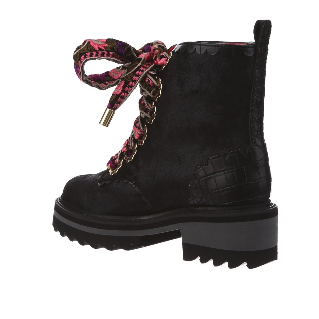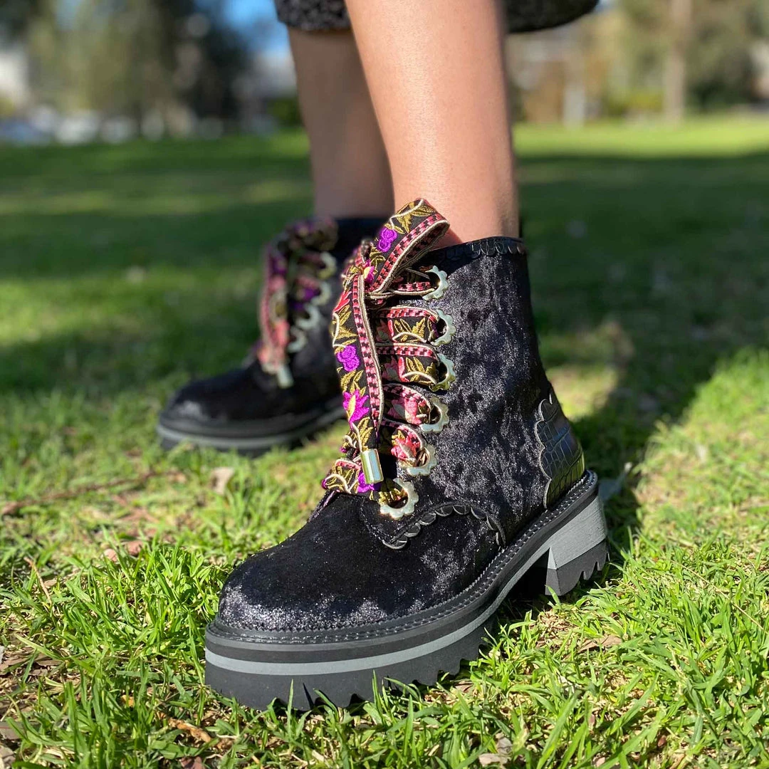 A great staple for your wardrobe, these boots are fun, comfy and practical – all with an irregular twist! Sumptuous black crushed velvet is wrapped around the upper, paired with matching glossy crocodile texture and gorgeous golden oversized eyelets in the shape of flowers! The laces are a spectacular woven fabric, with just a hint of mixed pinks in the pattern to really make these beauties pop! Add them to your wardrobe and up your boot game today!