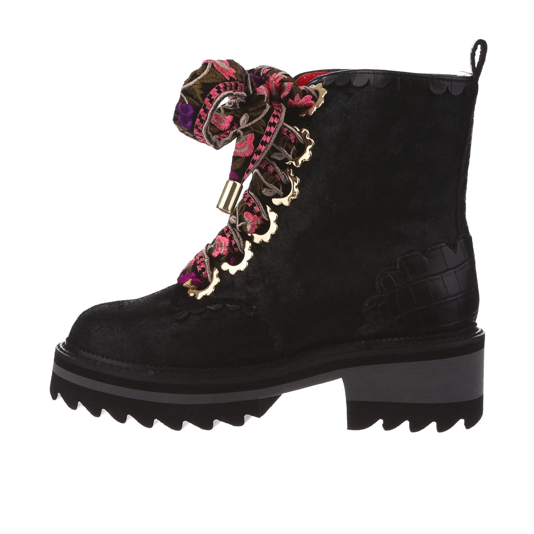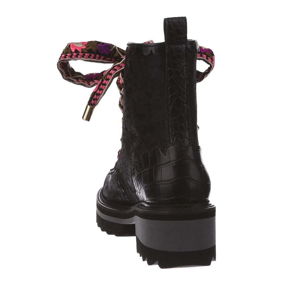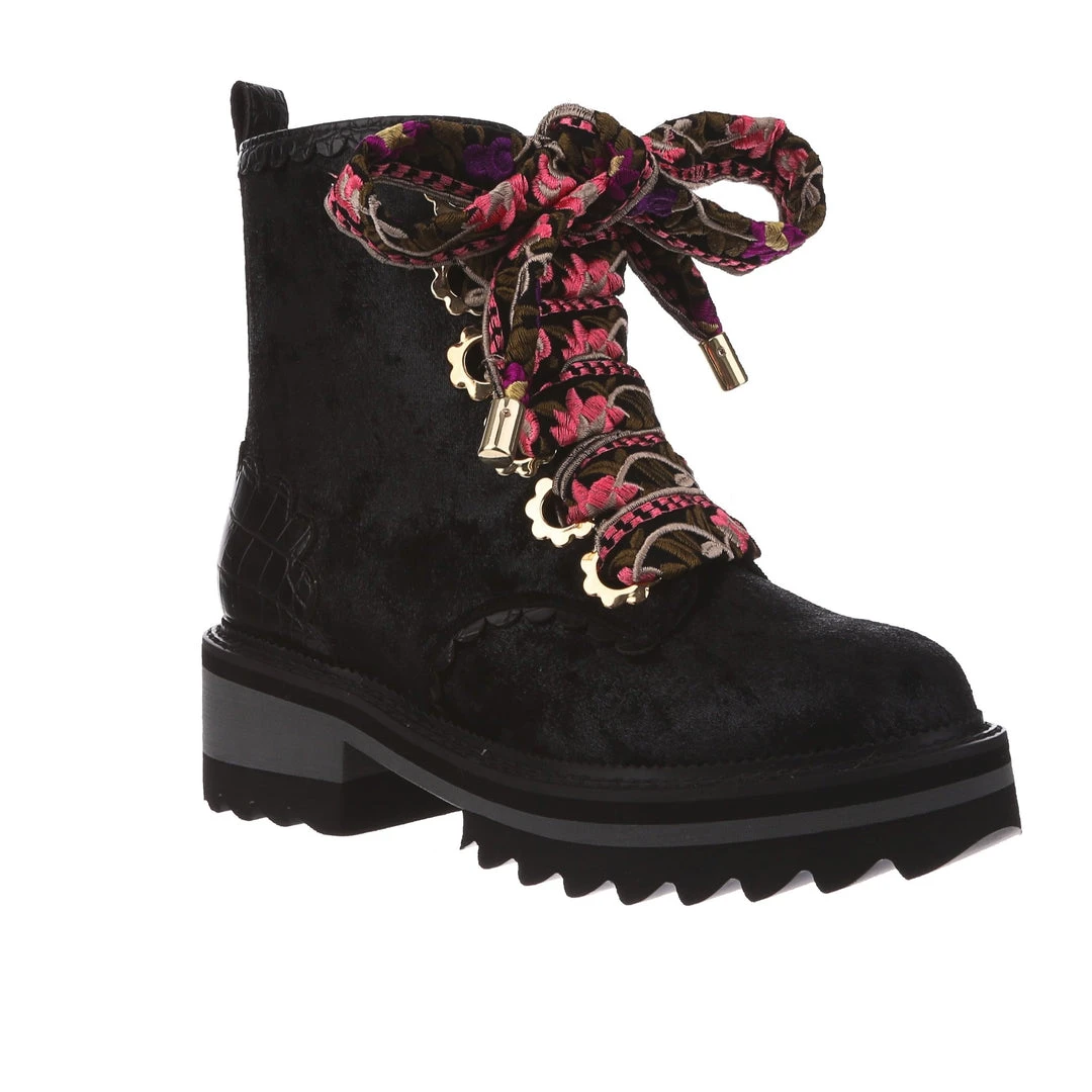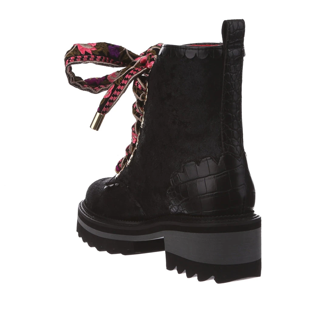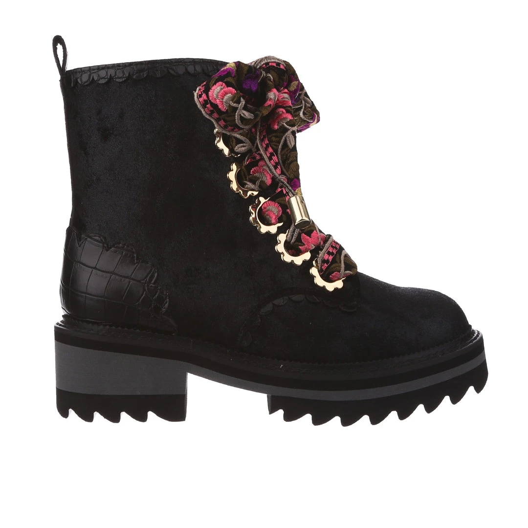 A great staple for your wardrobe, these boots are fun, comfy and practical – all with an irregular twist! Sumptuous black crushed velvet is wrapped around the upper, paired with matching glossy crocodile texture and gorgeous golden oversized eyelets in the shape of flowers! The laces are a spectacular woven fabric, with just a hint of mixed pinks in the pattern to really make these beauties pop! Add them to your wardrobe and up your boot game today!