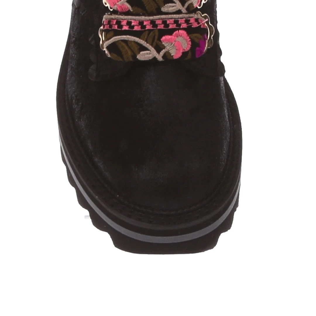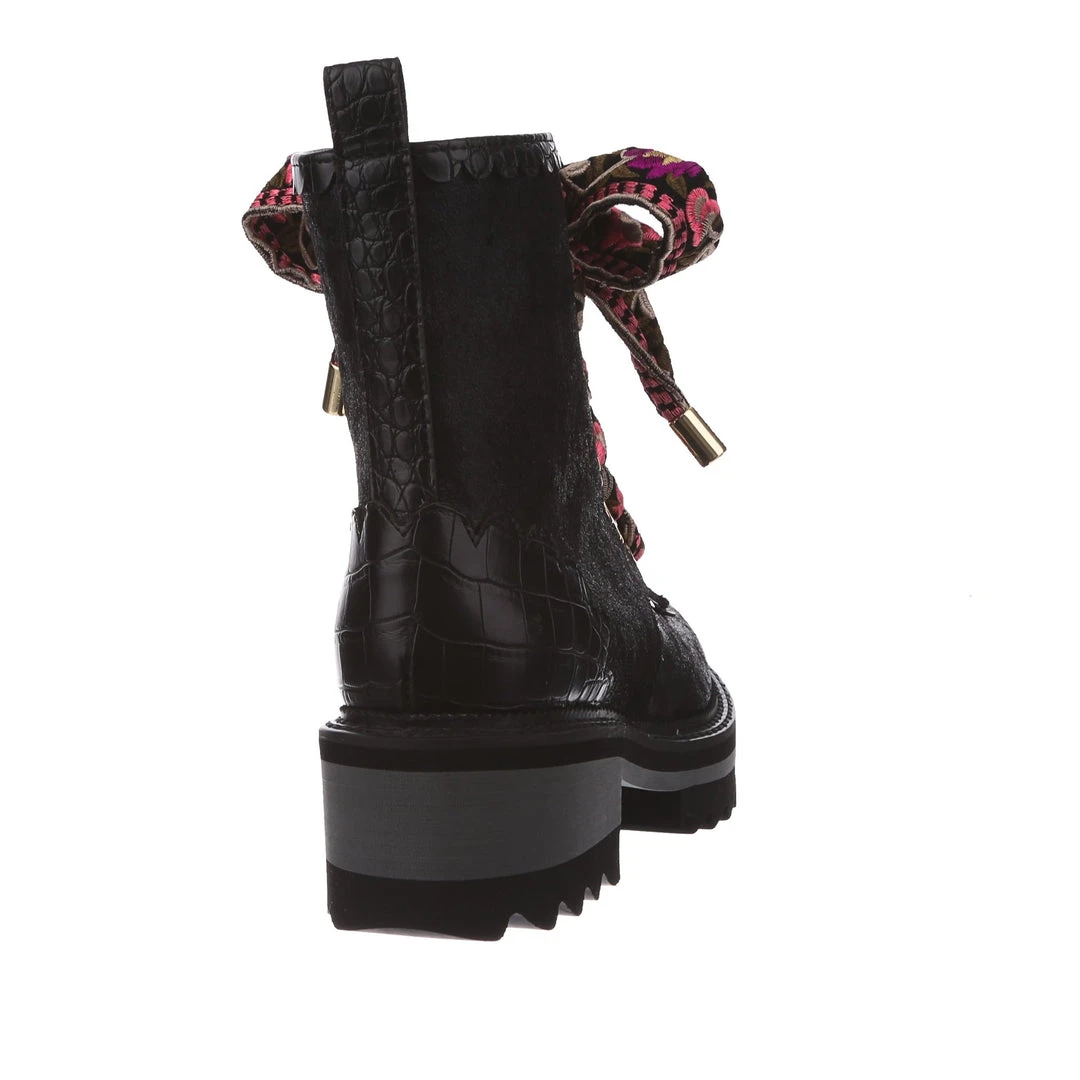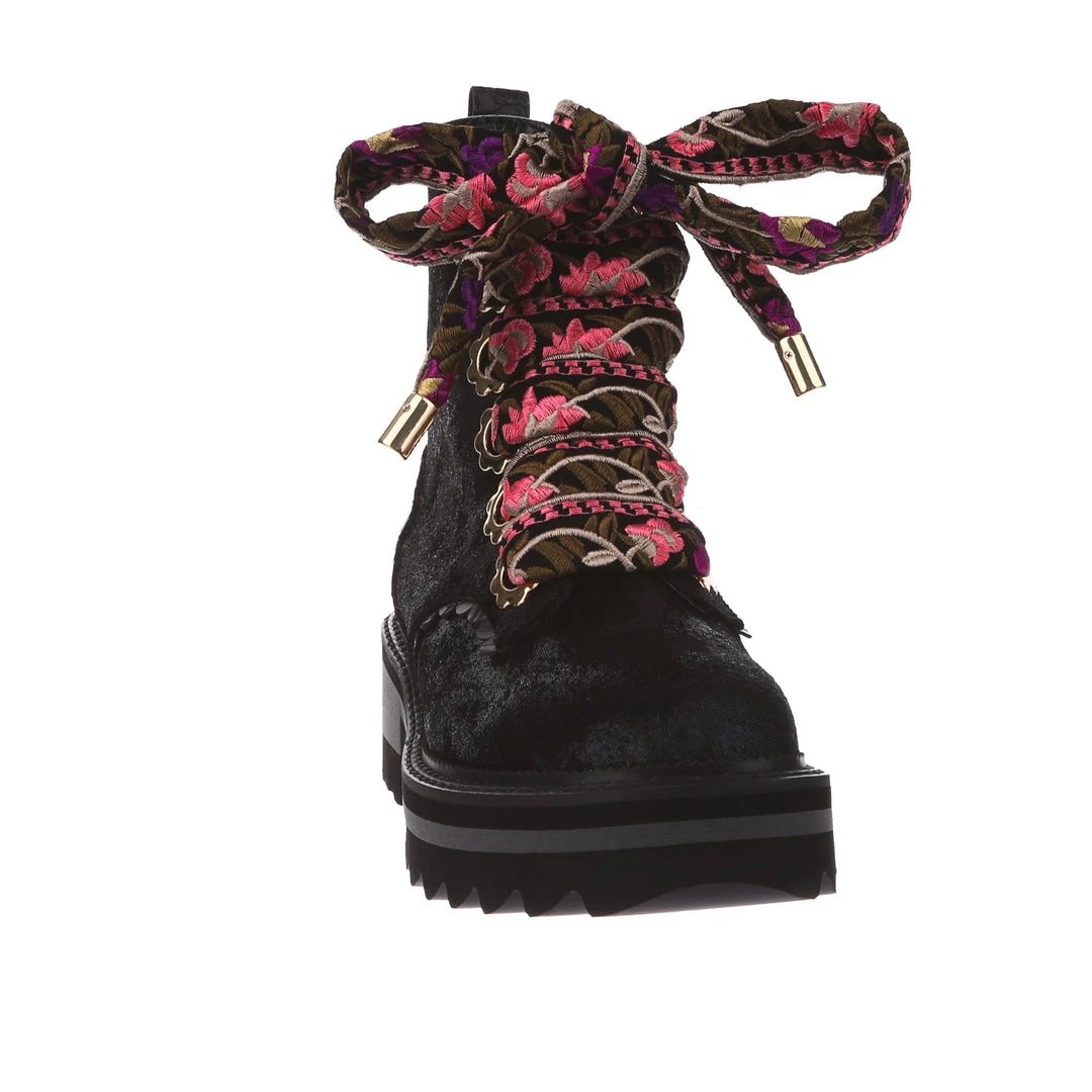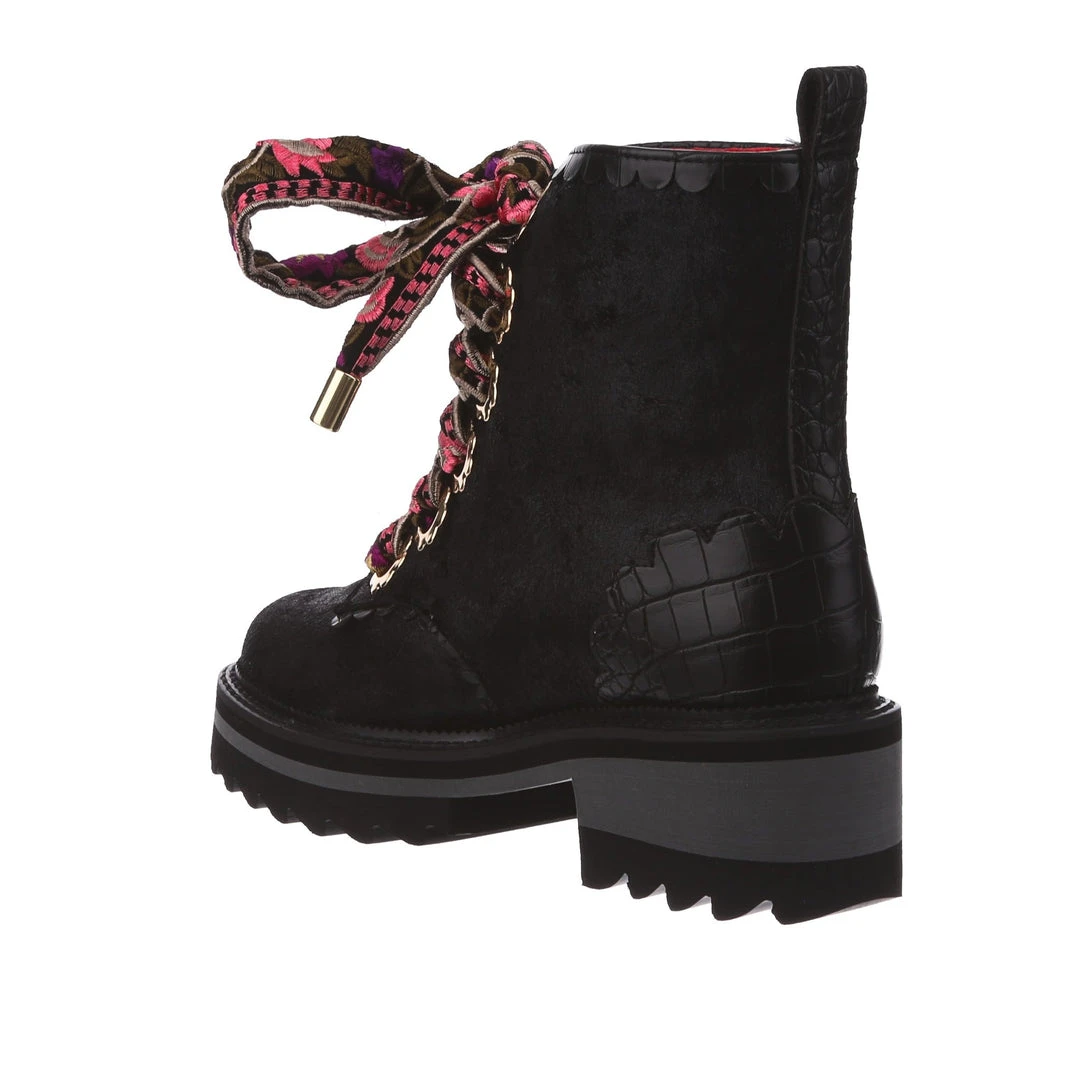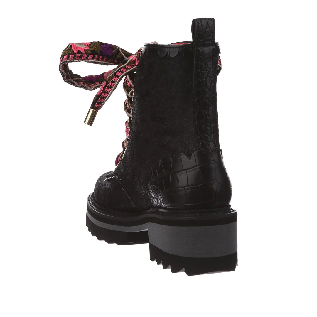 A great staple for your wardrobe, these boots are fun, comfy and practical – all with an irregular twist! Sumptuous black crushed velvet is wrapped around the upper, paired with matching glossy crocodile texture and gorgeous golden oversized eyelets in the shape of flowers! The laces are a spectacular woven fabric, with just a hint of mixed pinks in the pattern to really make these beauties pop! Add them to your wardrobe and up your boot game today!