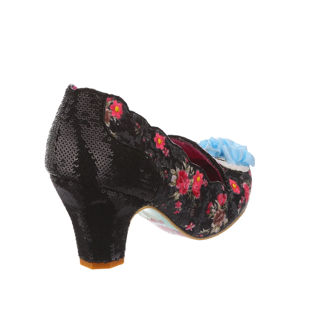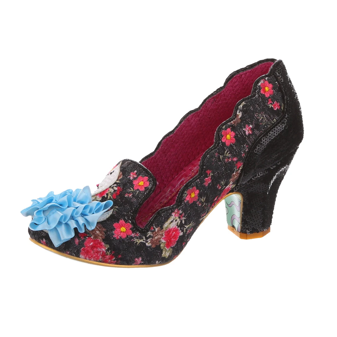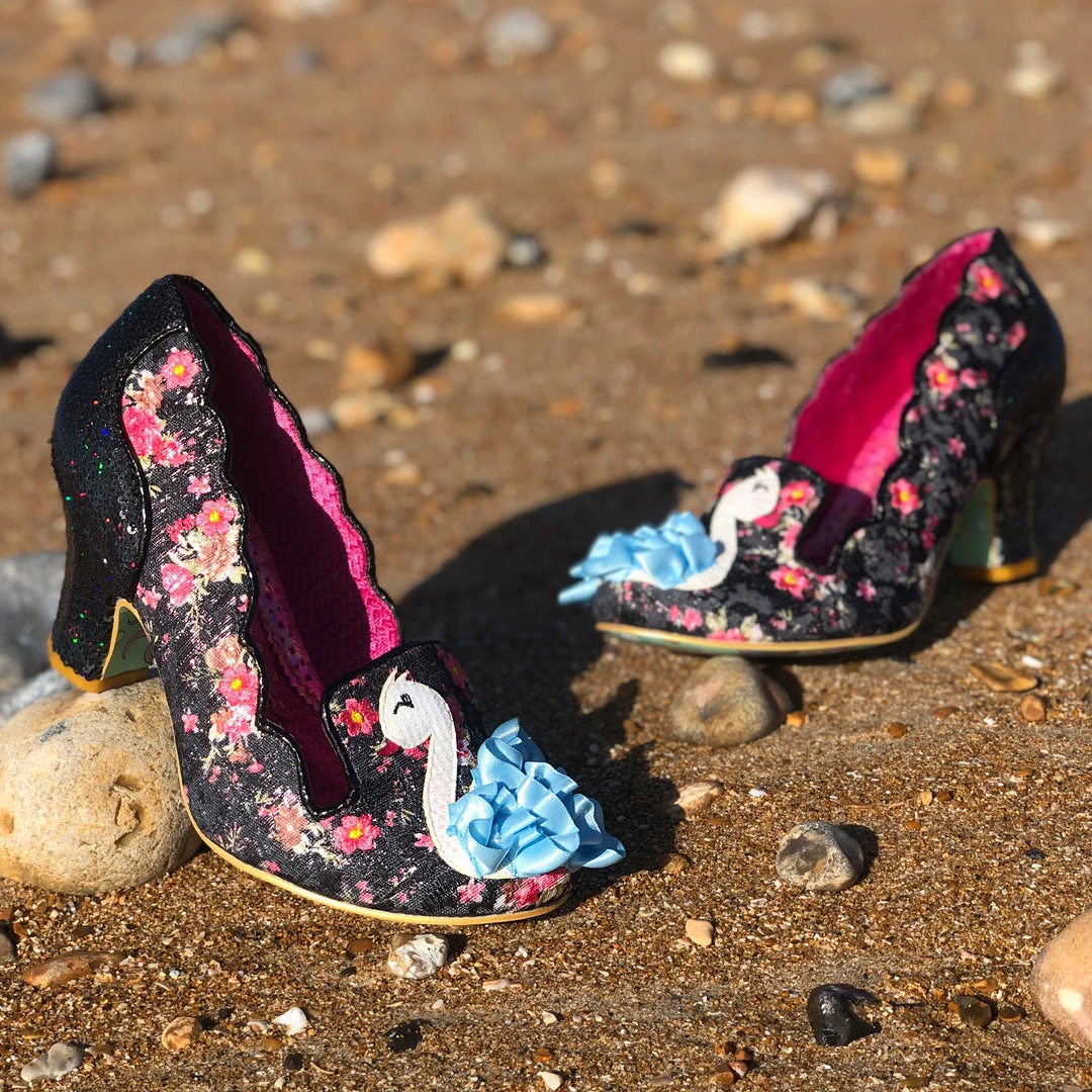 Lets go for a ride in these dreamy swan mid heel beauties! Heartwarming black and pink ditsy floral is paired with a shimmering metallic monochrome texture on the heel, all coming together with the fabulous applique and 3D detailing of the ruffle-tastic blue and white swan on the toe! Perfect to at some poise to any pose, and sure to keep you smiling all day long!