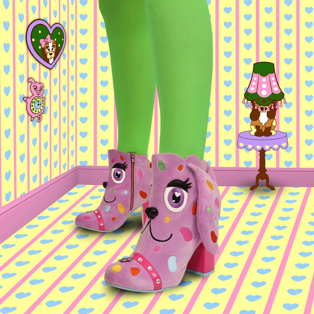Woof! Woof! Step out in the ultimate canine couture! These statement boots are styled to look like a fabulous multicoloured spotted doggy friend, with striking fuchsia accents on the heel and collar detailing! With 3D ears, a tail, and even a shimmering tag dangling from the rhinestoned collar – these are sure to make you feel like the top dog!