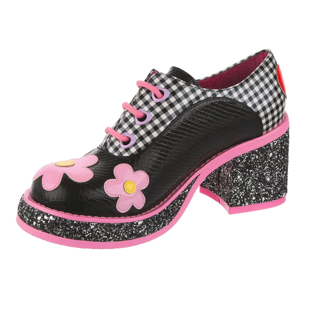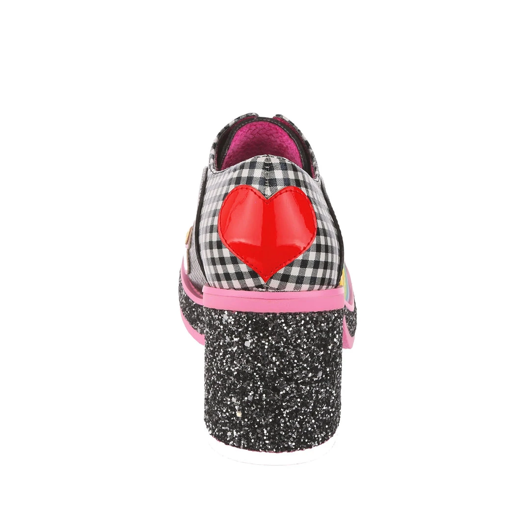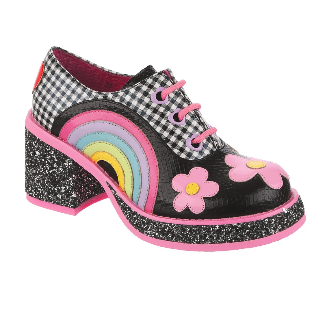 Oh so rainbow bright, these super cute retro platforms are a fabulous black and white gingham adorned with patent daisies along the toe and a rainbow on the side! The wearable and fun chunky heel is covered in a shimmering black glitter which is contrasted beautifully with the pastel pink sole and piping.