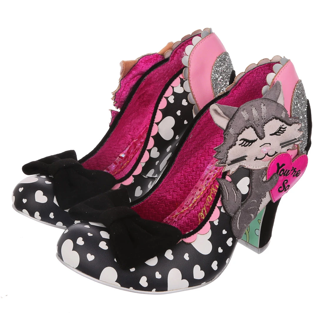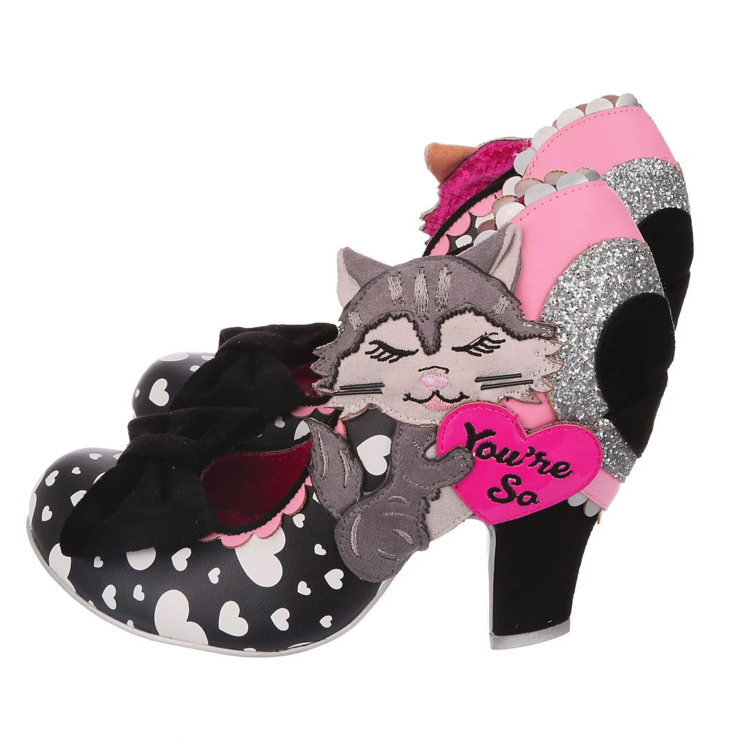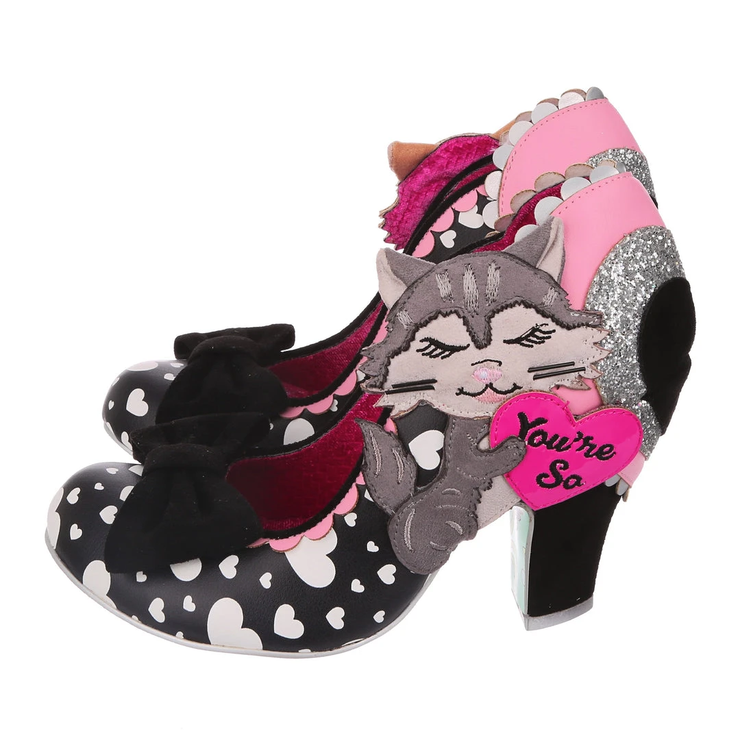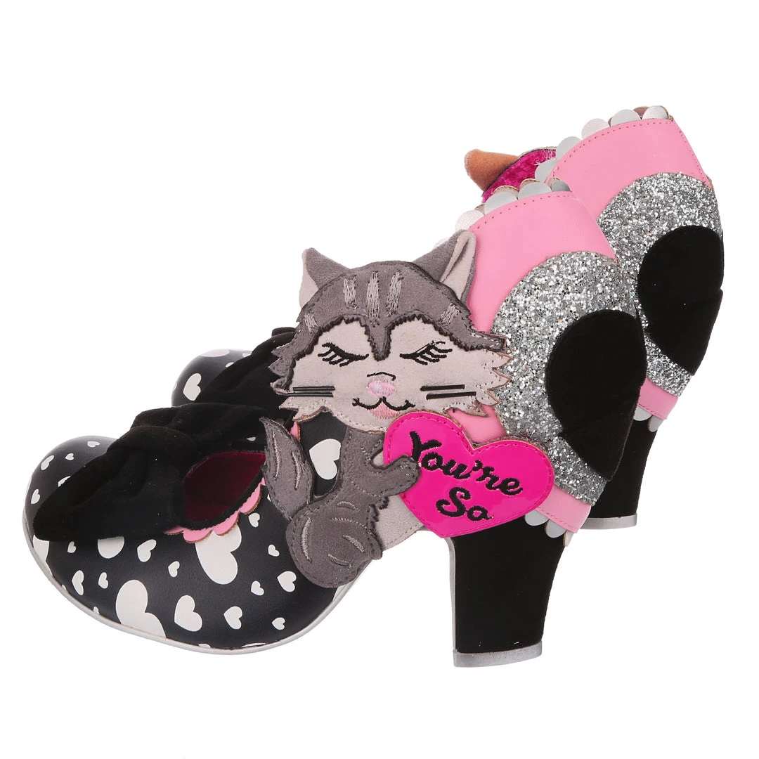 Be your own smitten kitten in these darling kitty cat heels! Perfect for a cat person, these pink, silver and black wonders are dazzling and darling, featuring two fabulous felines holding hearts with romantic messages inside. The black glitter bow on the toe matches the encrusted heel, and the scalloped edging along the back edge is the perfect tiny detailing to make these a pair of shoes you will never forget! A wonderful gift for a cat lover to show them how much they mean to you!