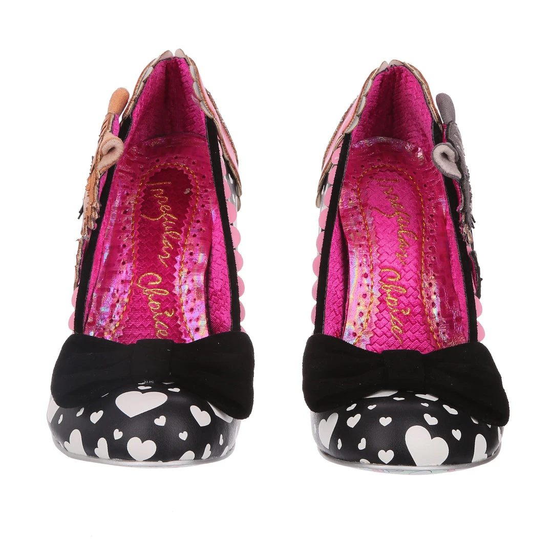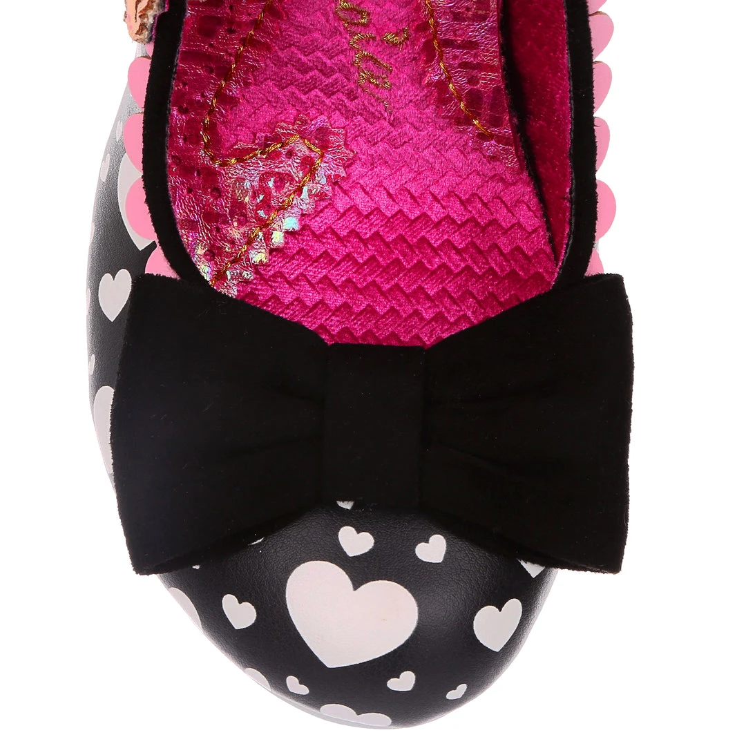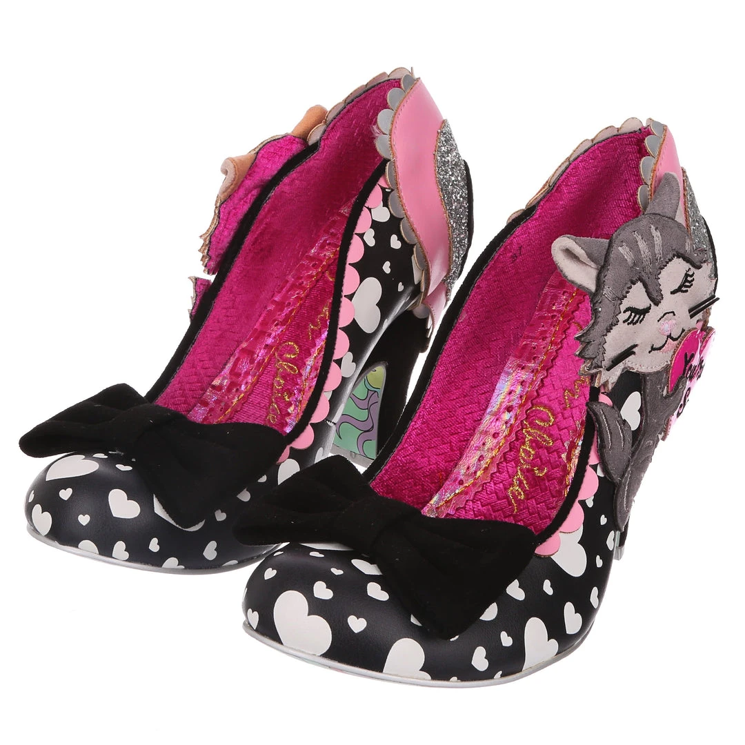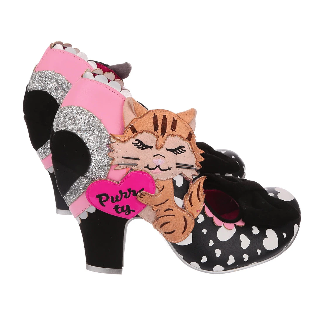 Be your own smitten kitten in these darling kitty cat heels! Perfect for a cat person, these pink, silver and black wonders are dazzling and darling, featuring two fabulous felines holding hearts with romantic messages inside. The black glitter bow on the toe matches the encrusted heel, and the scalloped edging along the back edge is the perfect tiny detailing to make these a pair of shoes you will never forget! A wonderful gift for a cat lover to show them how much they mean to you!