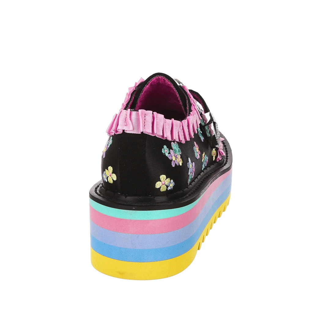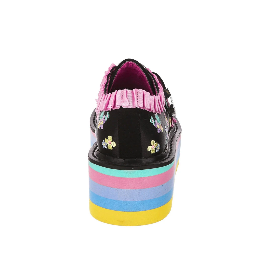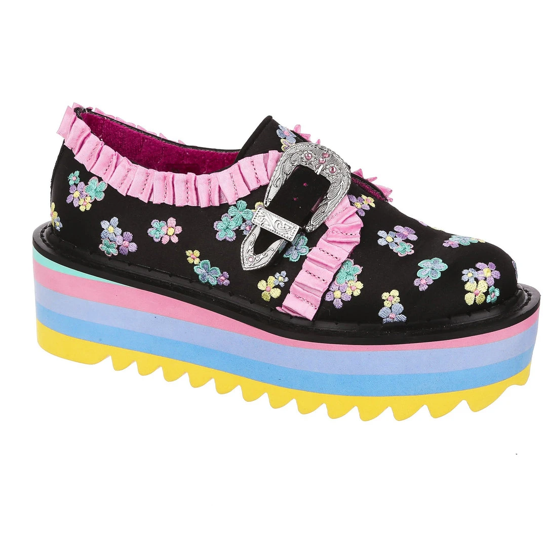 Buckle up! These beauties are something special! An adorable black and pastel floral brocade is paired with darling baby pink ruffles and a statement vintage style buckle, to give a completely unique feel! The sole is layers of pastel block colours finished with a chunky tread for ease of wear, these are definitely party shoes! Sure to turn heads and get you feeling like the star of the show, add them to your life today!