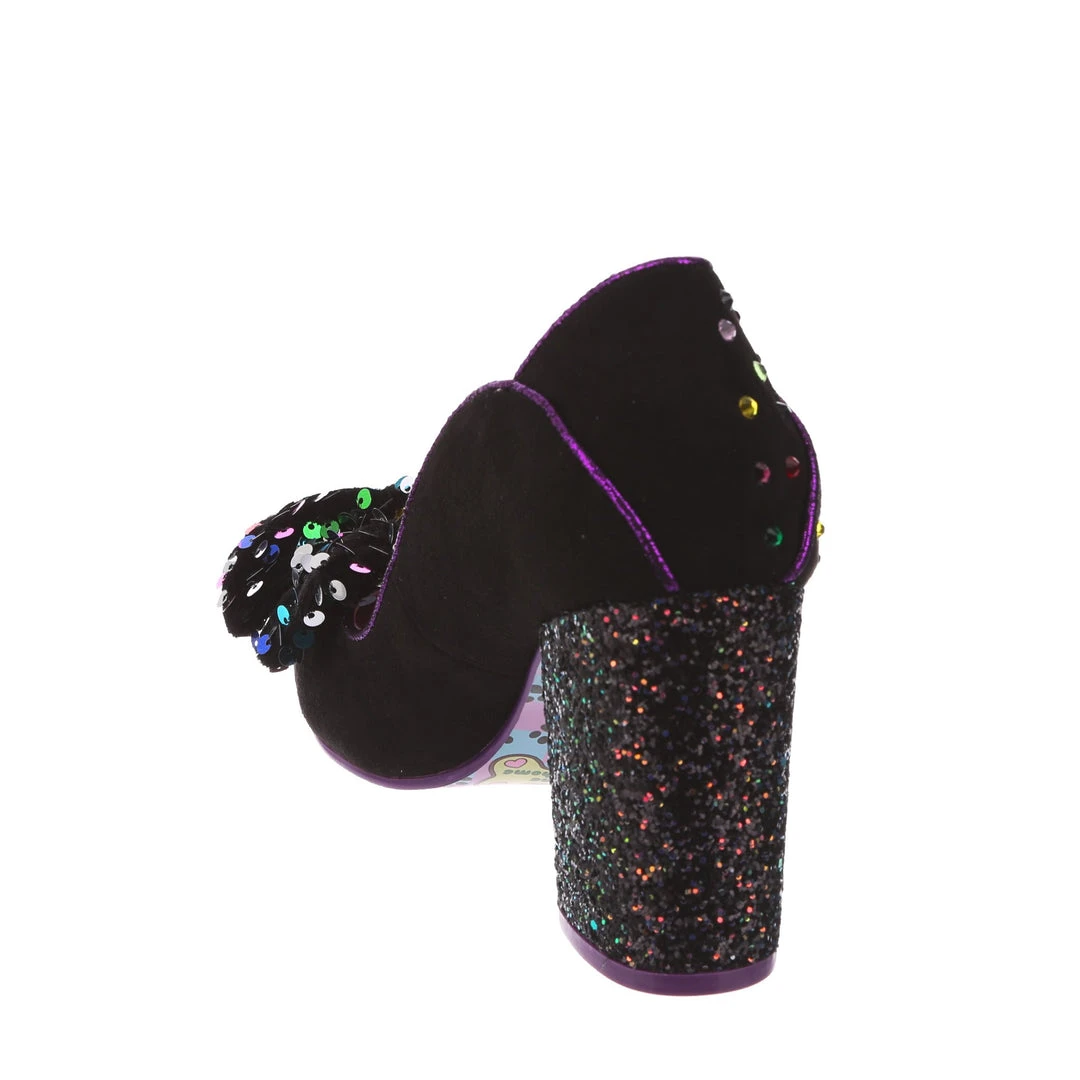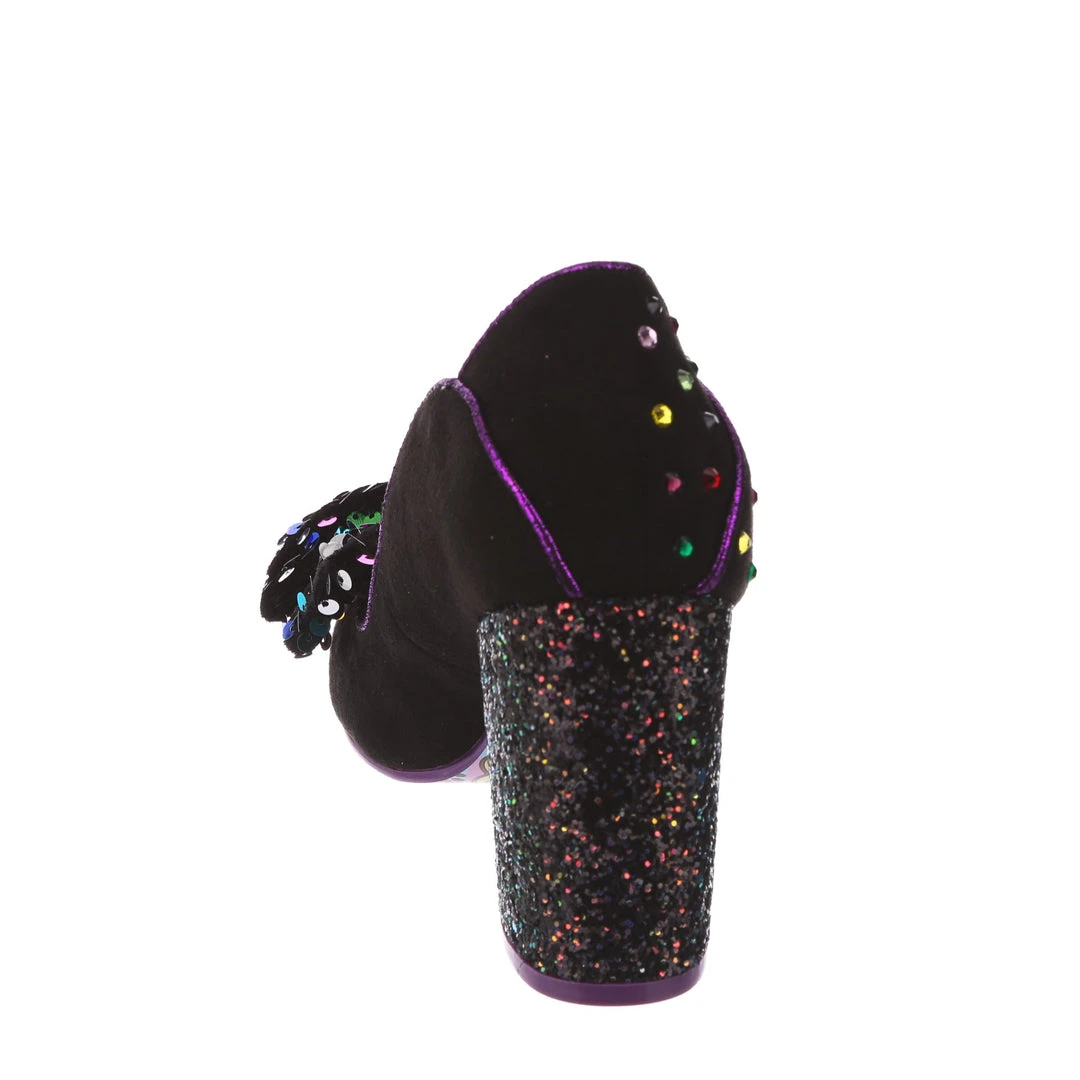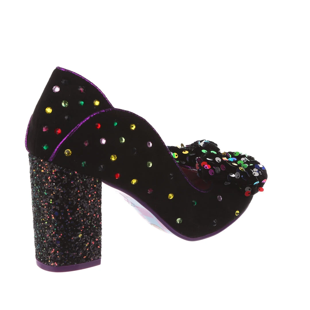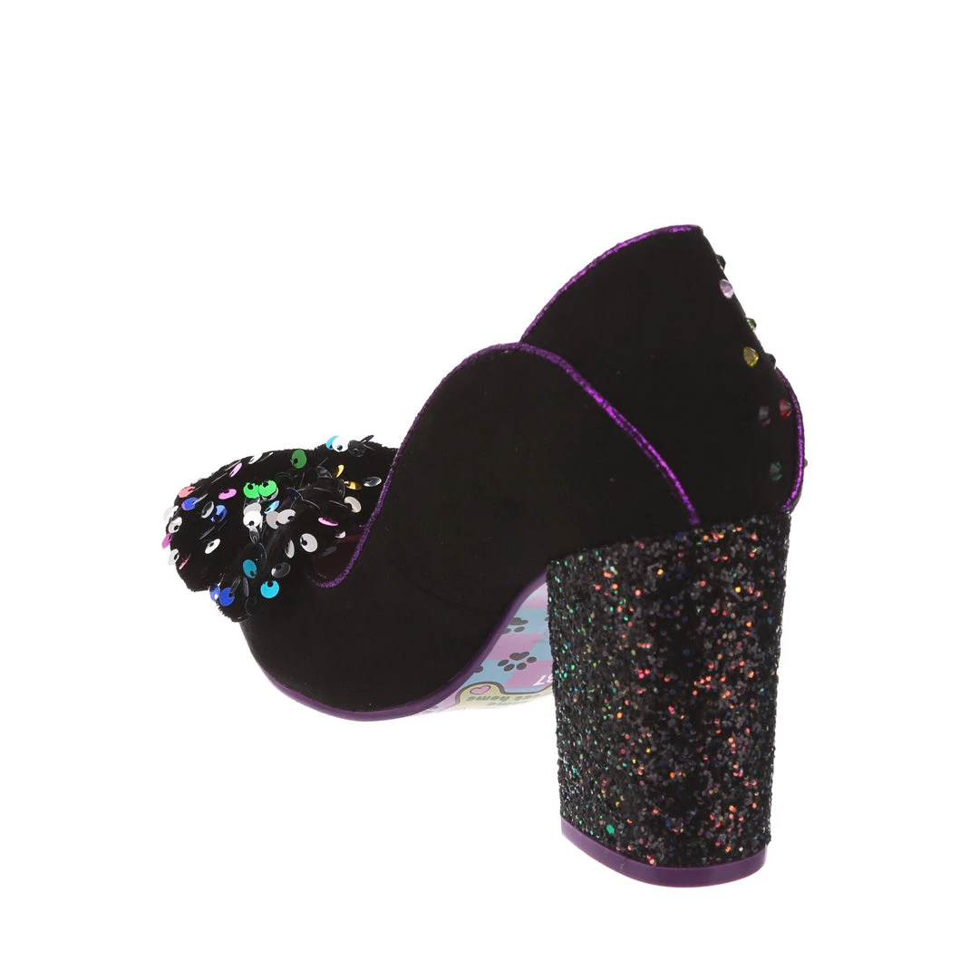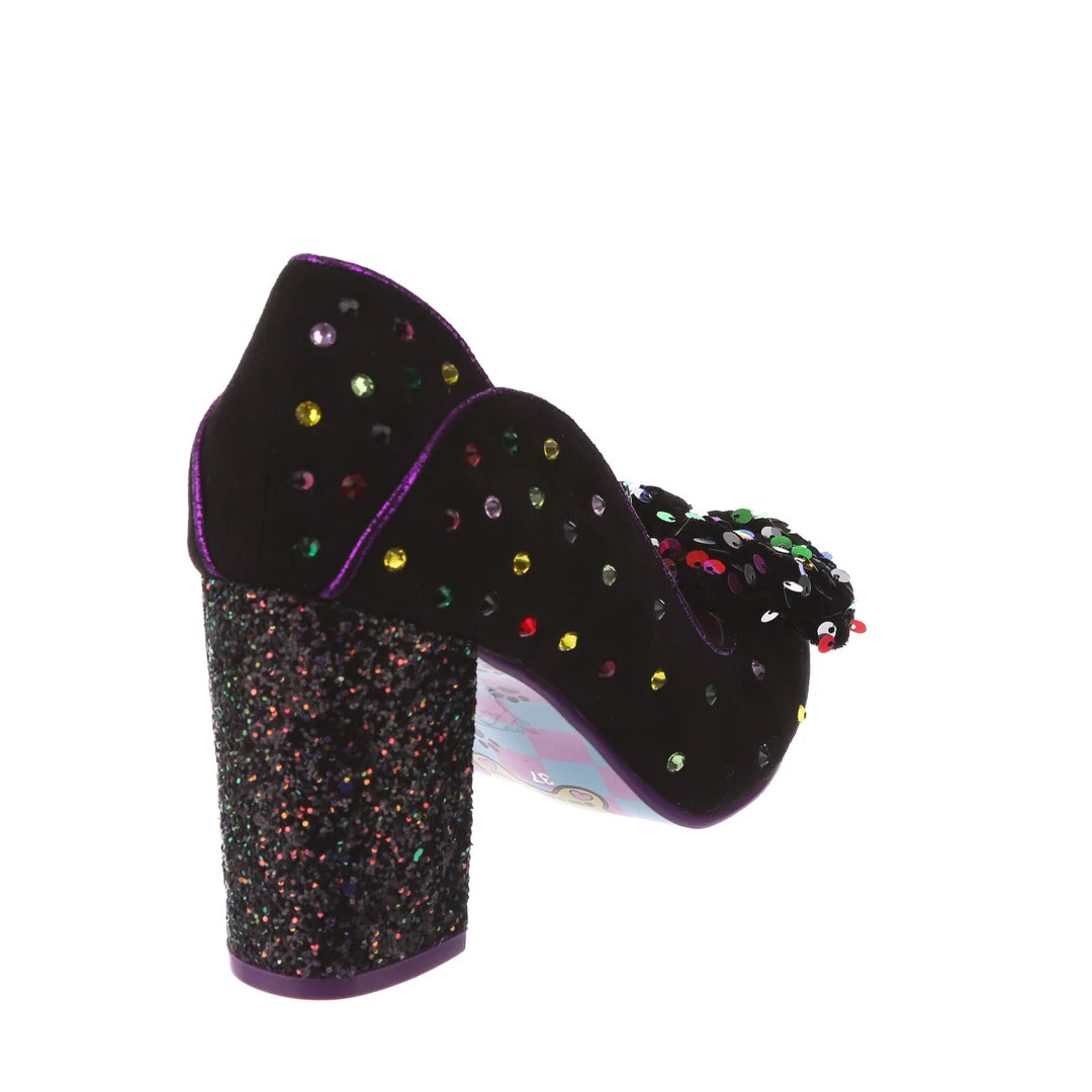 The perfect pair of pumps for party season! Elegant and sophisticated, these bejewelled beauties are enchanting in all black, from the sumptuous suede upper, to the glitter encrusted heel and the opulent rainbow sequin bow on the toe! Delicately placed rainbow rhinestones dot along the body of the shoe, and stunning brilliant purple piping adds the perfect final touch to these showstoppers!