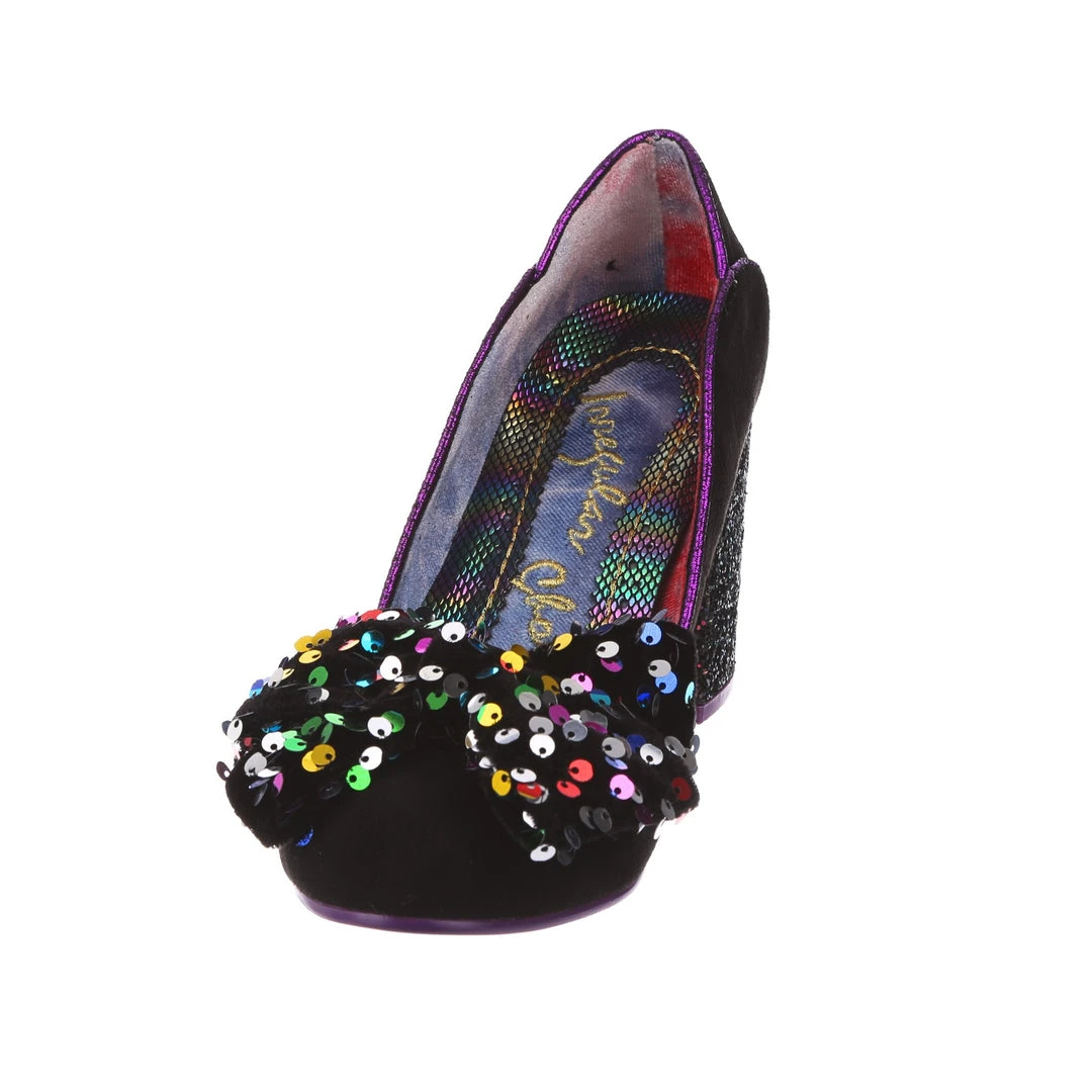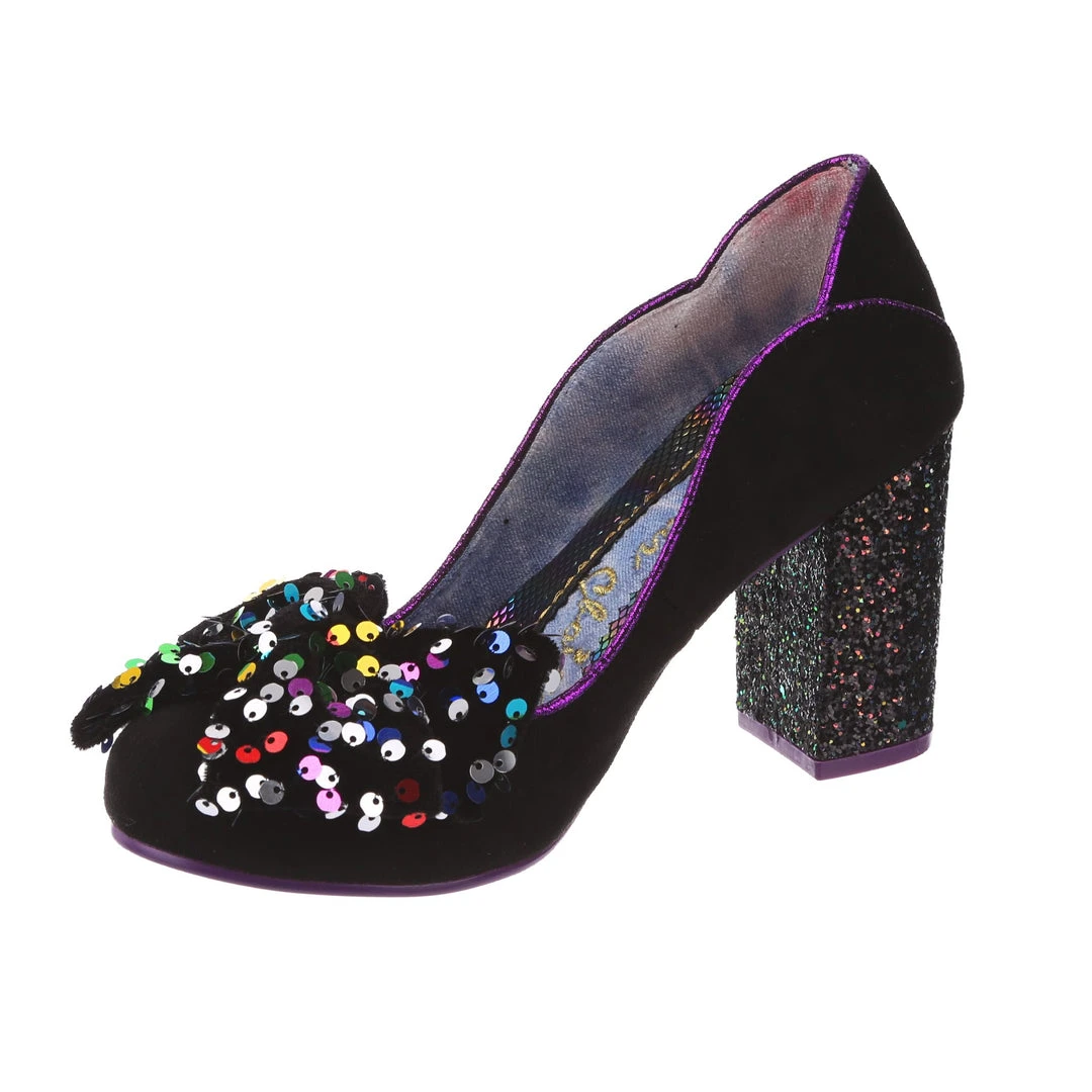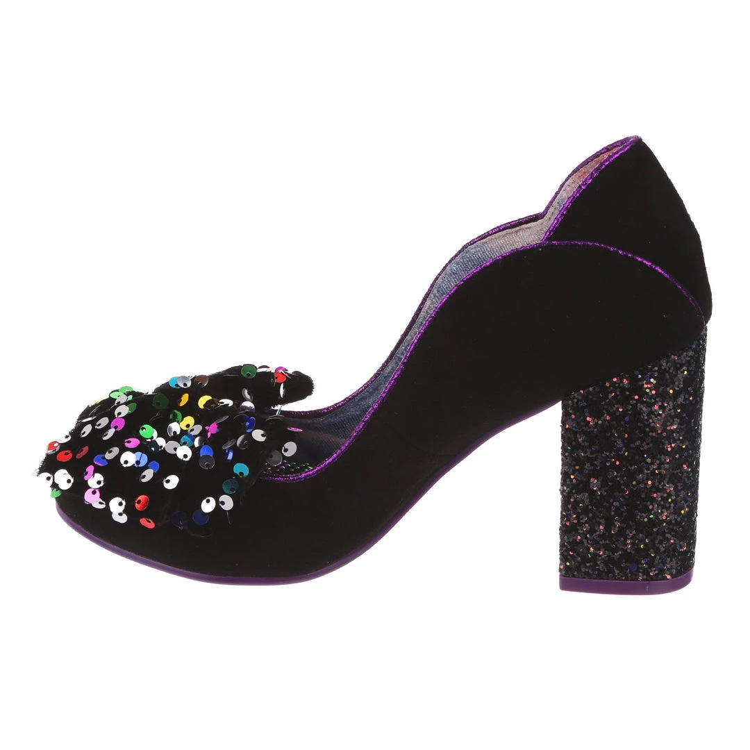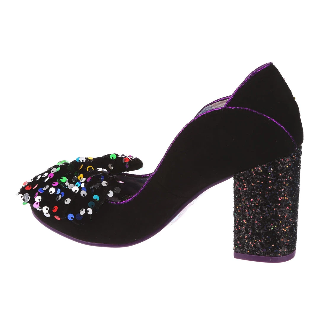 The perfect pair of pumps for party season! Elegant and sophisticated, these bejewelled beauties are enchanting in all black, from the sumptuous suede upper, to the glitter encrusted heel and the opulent rainbow sequin bow on the toe! Delicately placed rainbow rhinestones dot along the body of the shoe, and stunning brilliant purple piping adds the perfect final touch to these showstoppers!