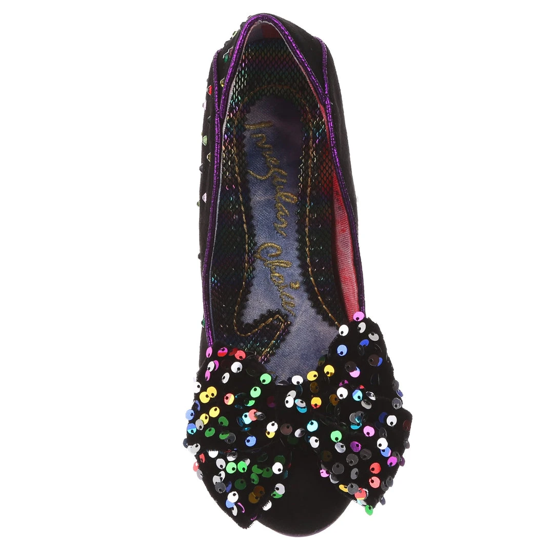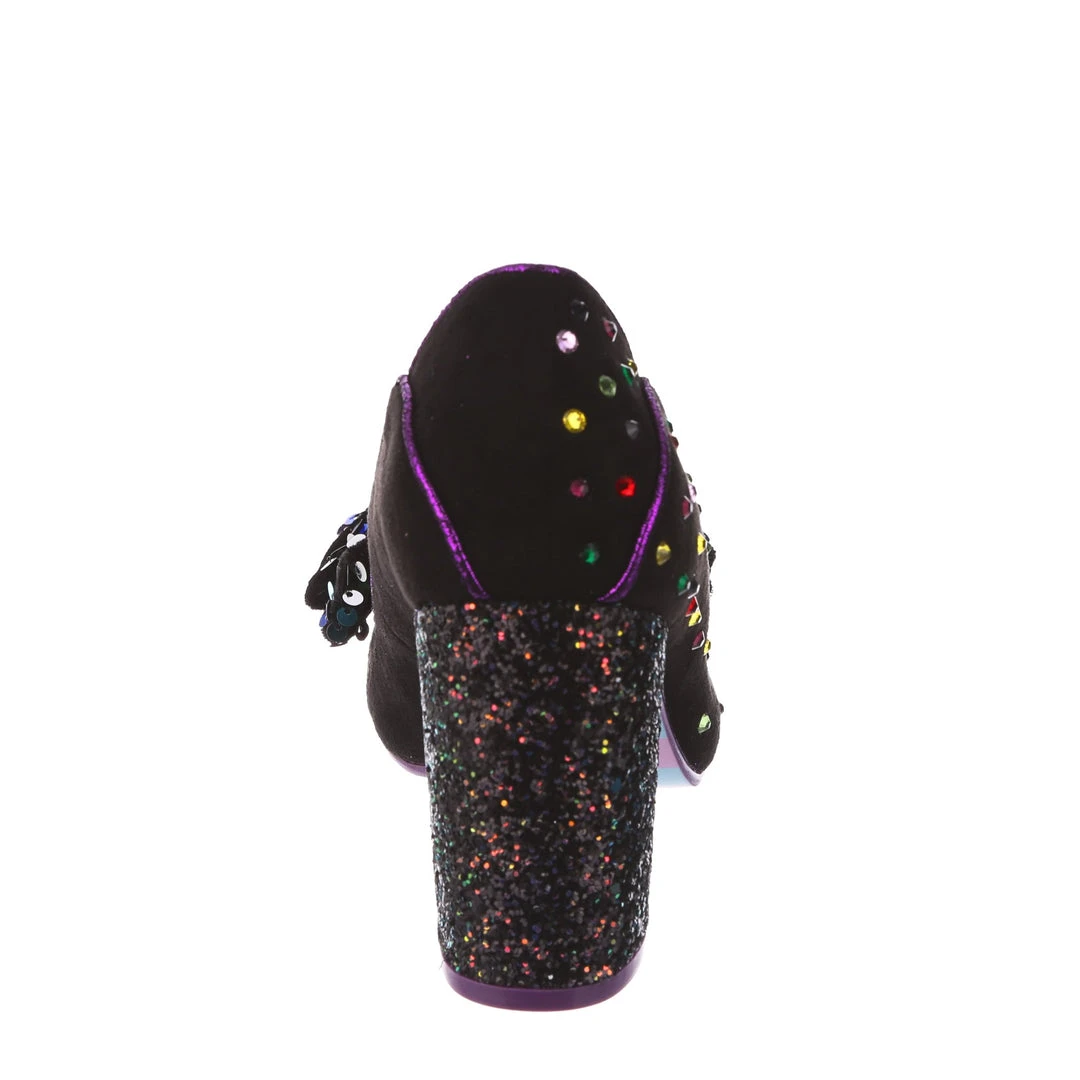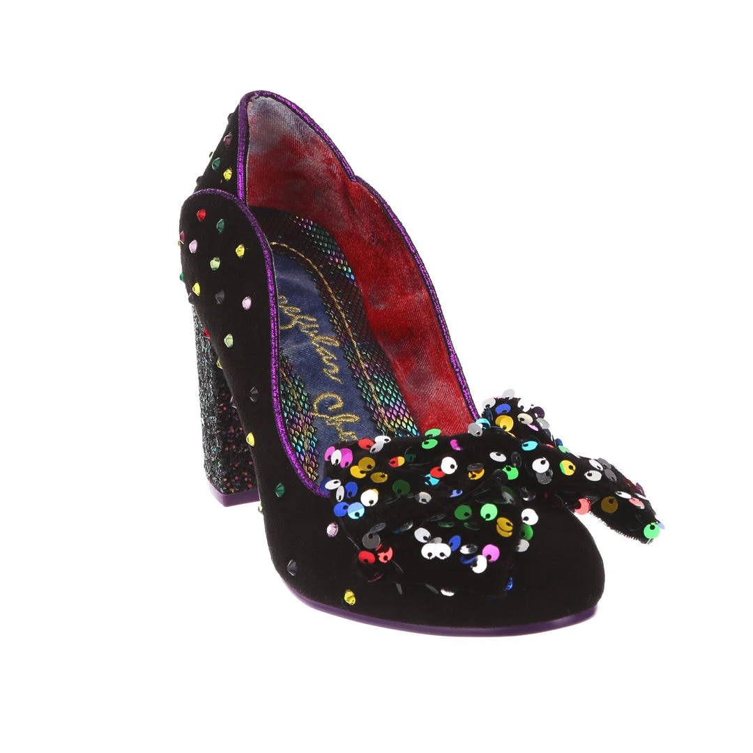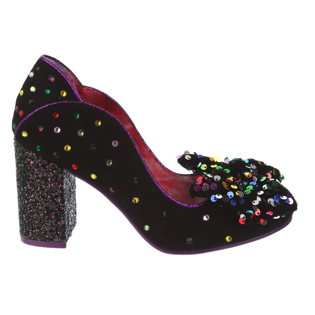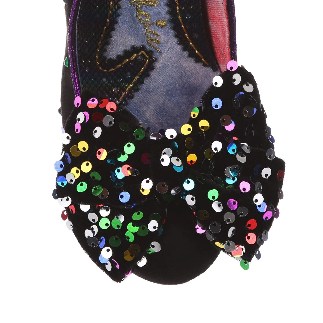 The perfect pair of pumps for party season! Elegant and sophisticated, these bejewelled beauties are enchanting in all black, from the sumptuous suede upper, to the glitter encrusted heel and the opulent rainbow sequin bow on the toe! Delicately placed rainbow rhinestones dot along the body of the shoe, and stunning brilliant purple piping adds the perfect final touch to these showstoppers!