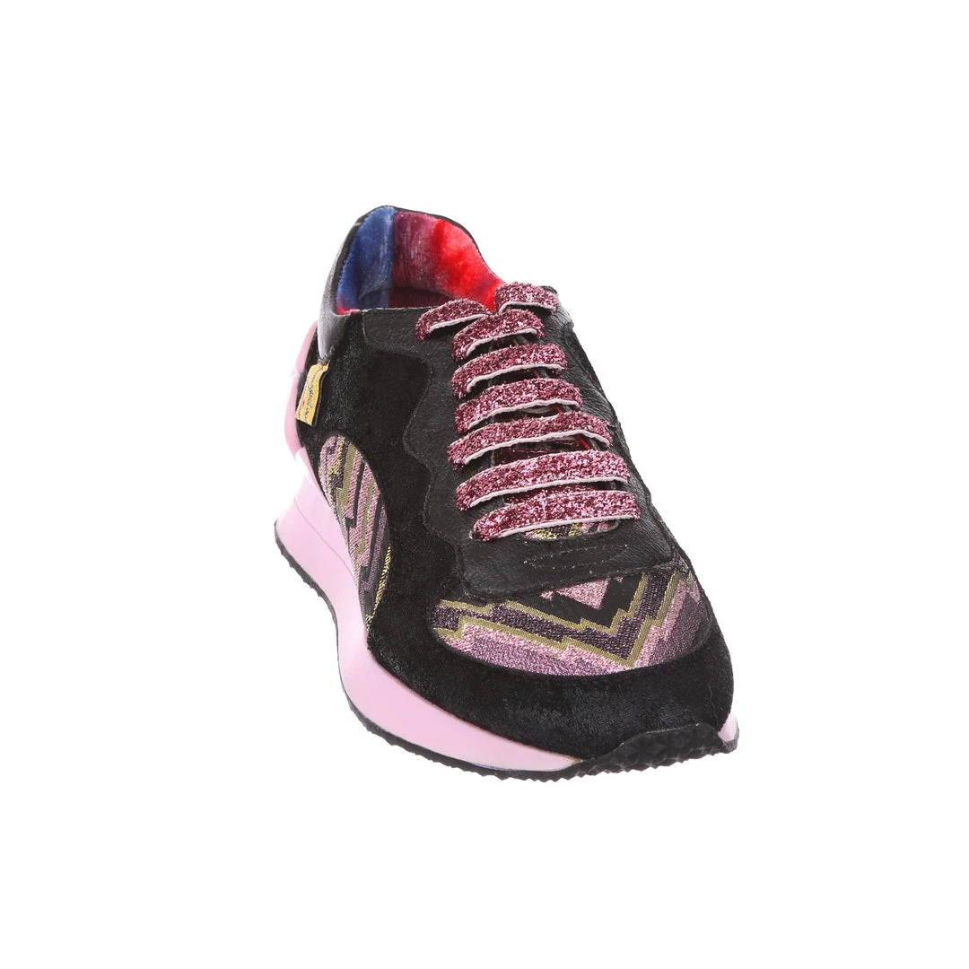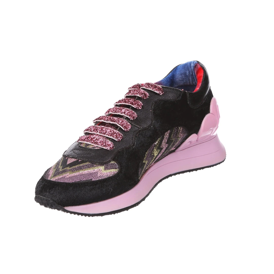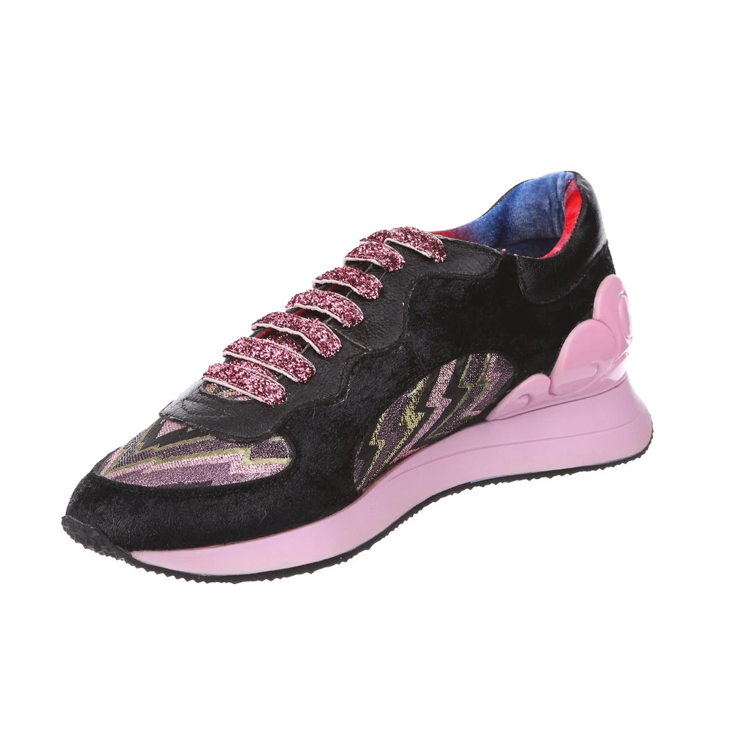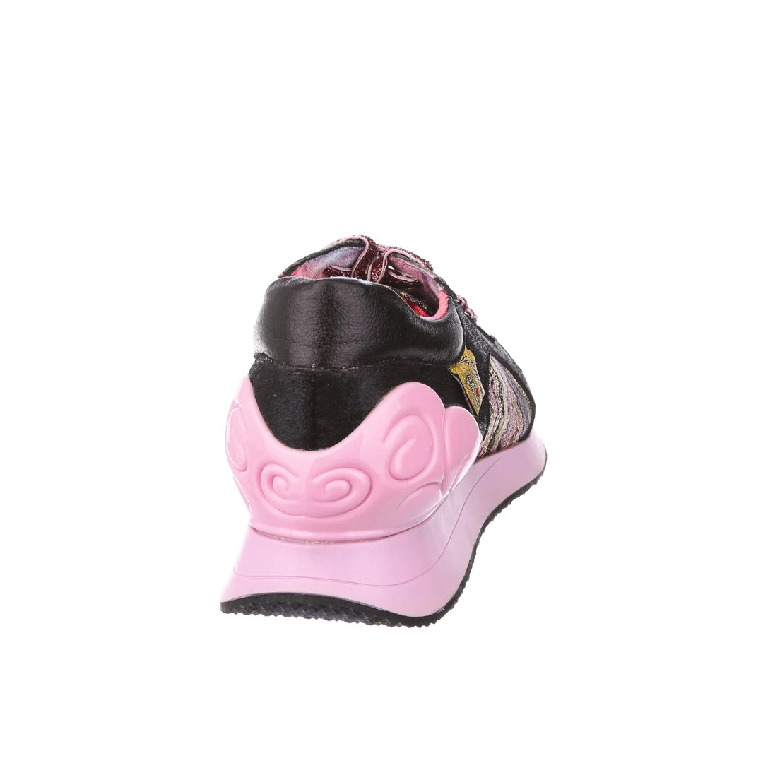 Lace into something out of this world! These trainers are sure to make your head spin! Featuring baby pink clouds which wrap around your heel, connecting to the athletic inspired sole in a similar hue. Decorated with shimmering retro purple, gold and pink zig zag stripes, all finished with fabulous blush tone glitter laces, these beauties are not to be missed!