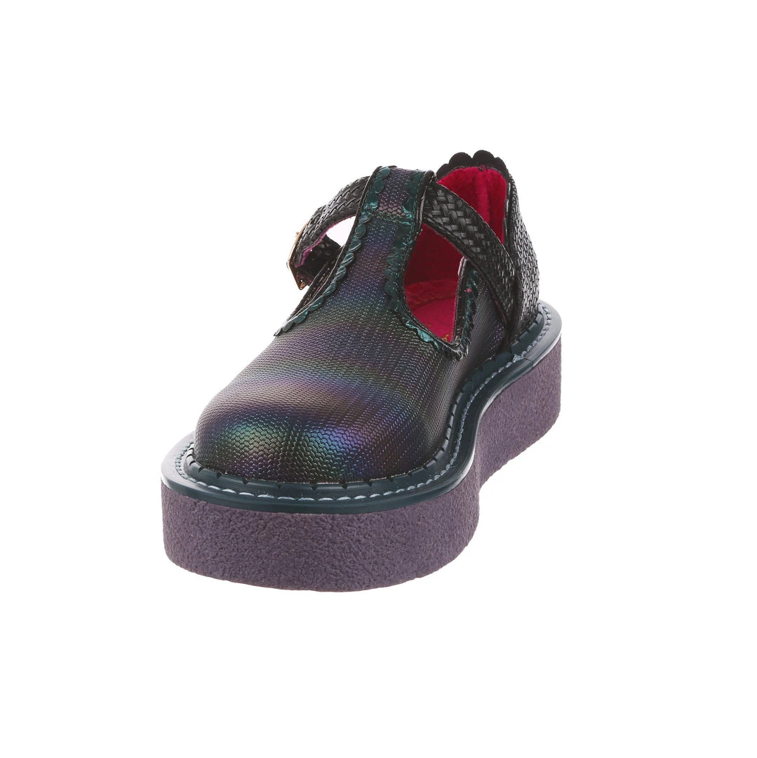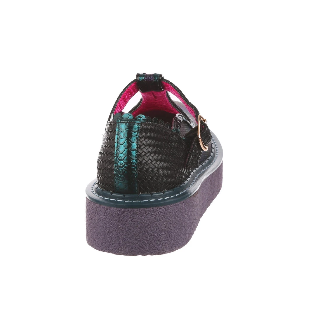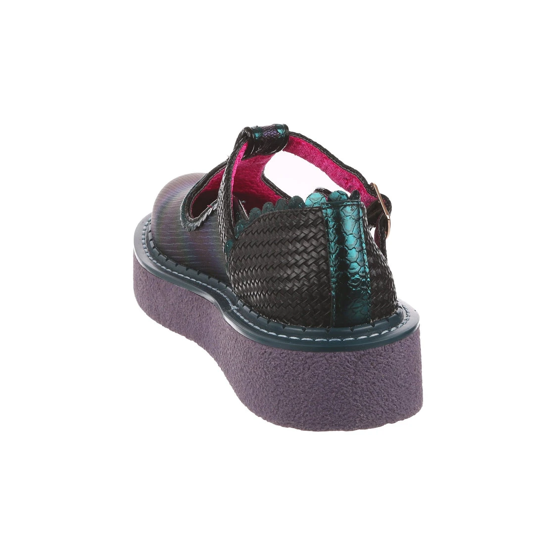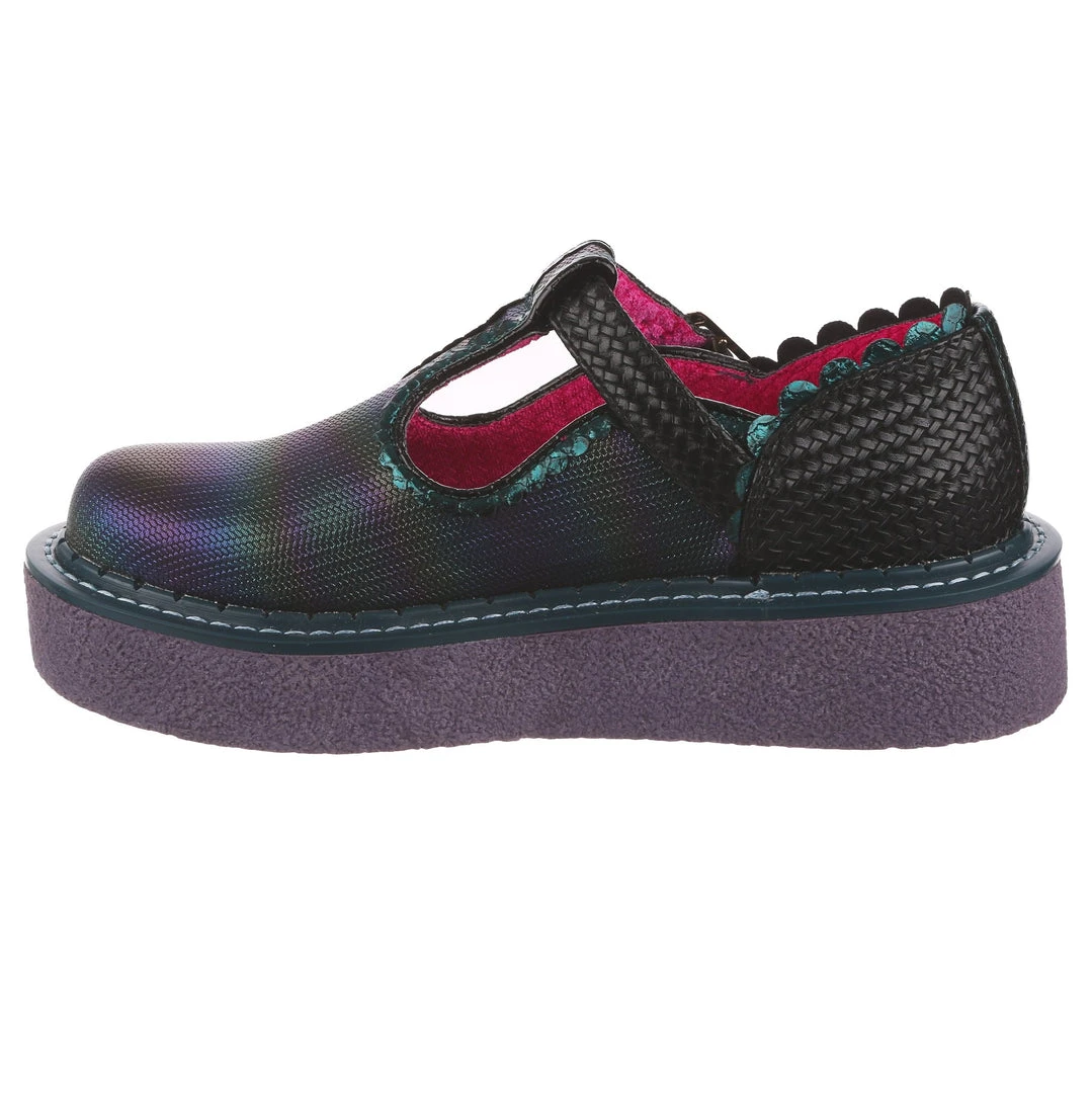 Feel summer perfect in these platform t-bar creepers! Textured metallic oil slick platform shoes with a black woven t-bar strap and rear panel that is offset with a shiny teal scalloped edge and green and lilac chunky platform sole. Fastened with a gold buckle on the t-bar strap. Grab a pair today to complete your summer wardrobe!