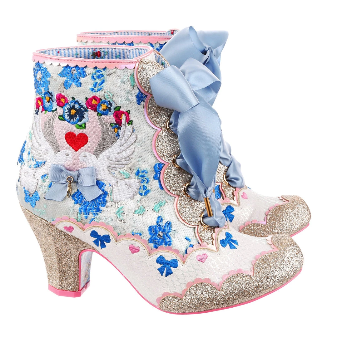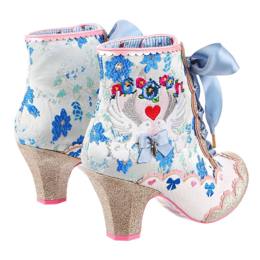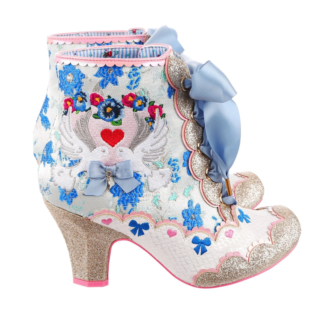 The look of dove! Beautiful pastel coloured mid heel bridal boots are decorated with stunning embroidered flowers, bows, hearts and of course the two doves that hold a gorgeous steel blue bow and gold trinket. Edged with delicate light pink scalloping and gold glitter and a matching gold mid heel, these stunners are finished with a steel blue ribbon lace that really makes an impact. Feel dove-ly in these wedding boots today!