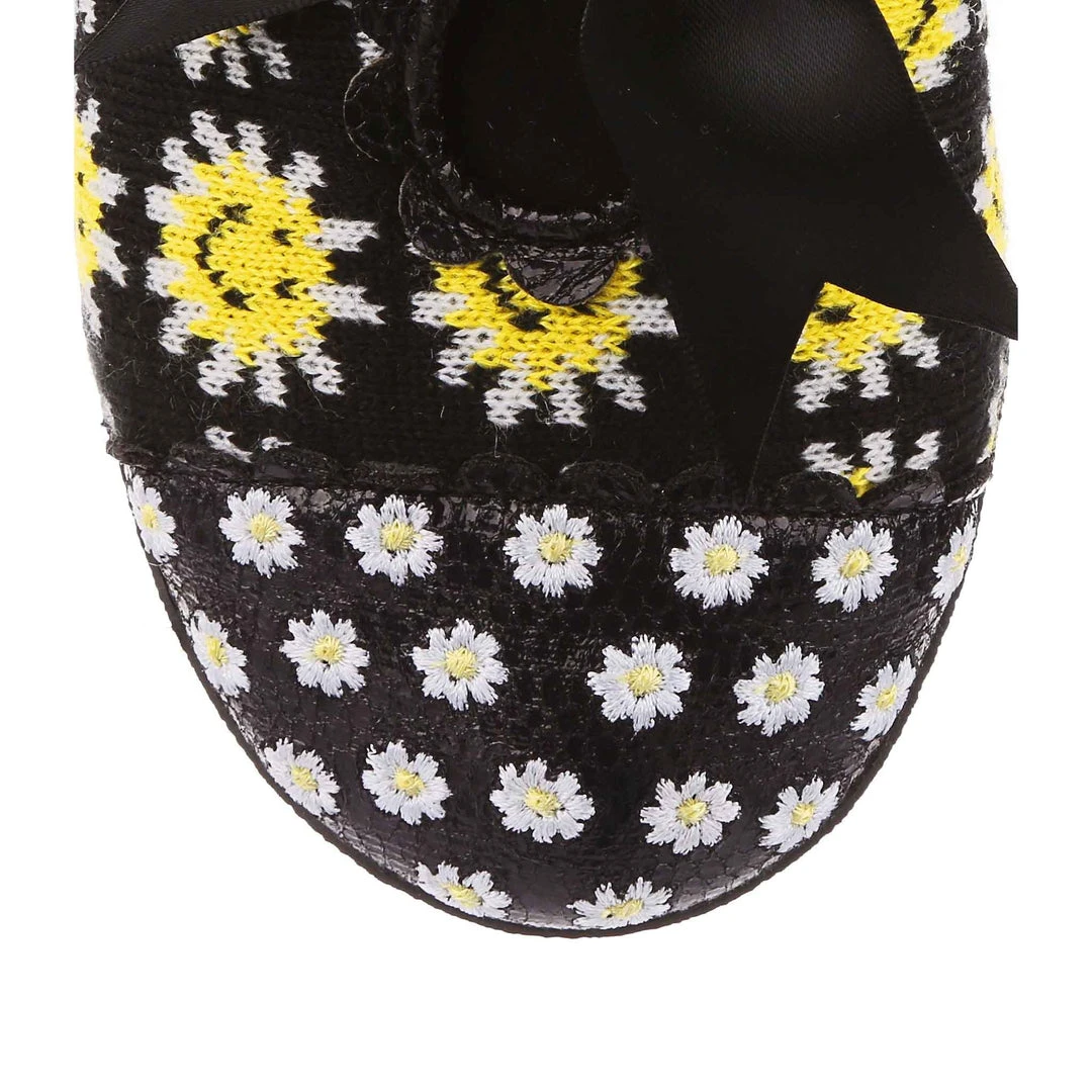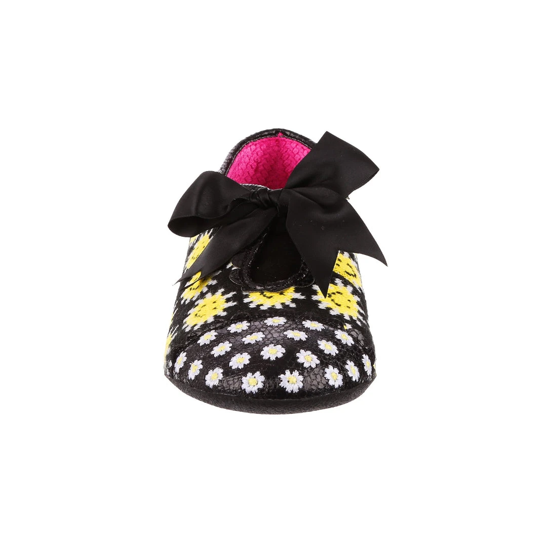 Are you feeling the flower power? We certainly are with these super cute lace-ups! A plush crocheted upper is covered in darling daisies on a black background, which is accented by the embroidered toe cap, matching ribbon laces and adorable scalloped edges along the topline! Super cute and fun to wear!