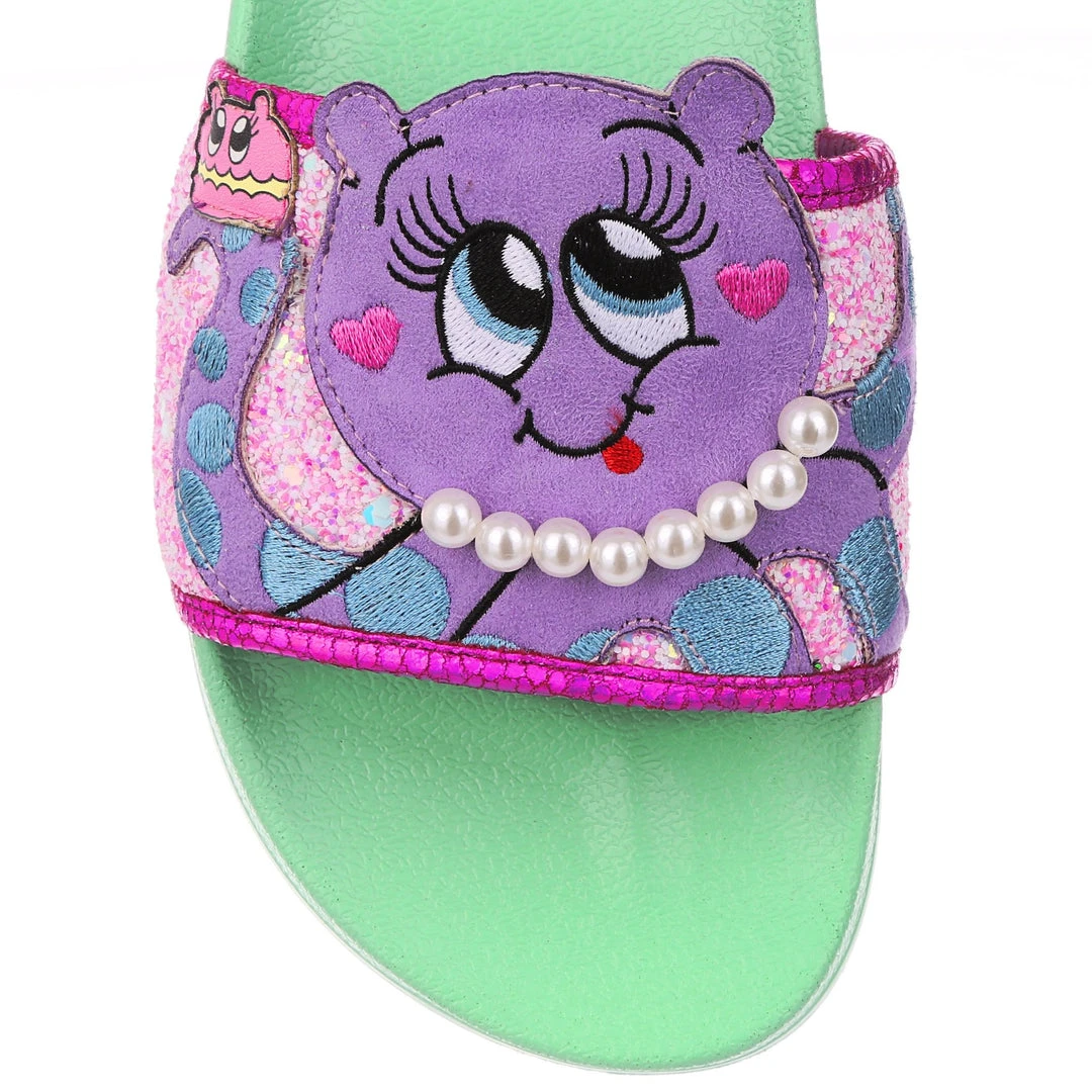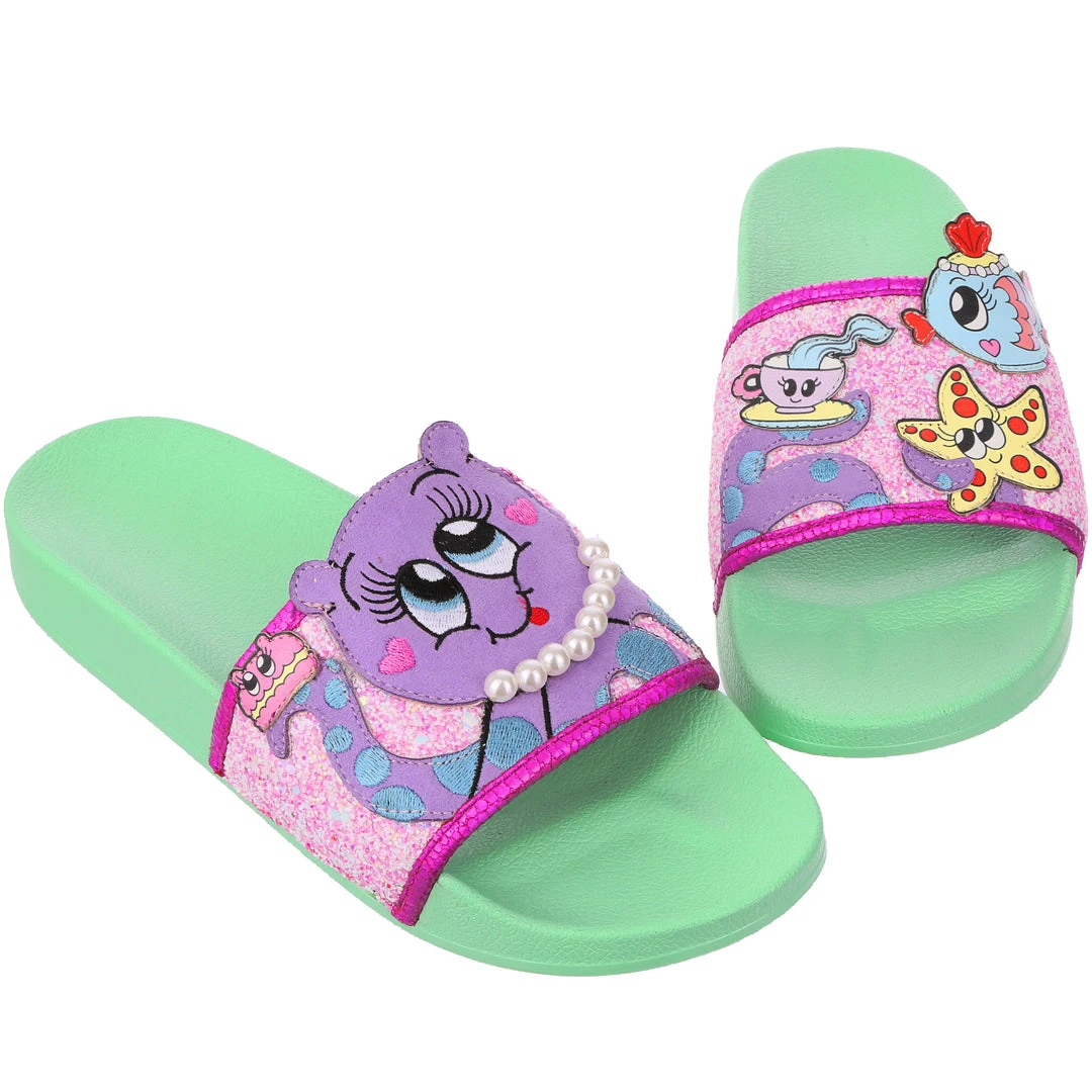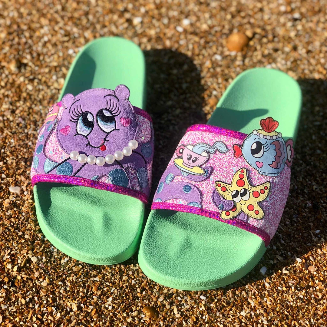 Who is up for an underwater tea party? We definitely are! Slip into these striking slides which feature our irregular octopus serving tea to all their fishy friends! Backed onto a pink glitter texture and finished with 3D pearl detailing, these seafoam green wonders are here to make your summer spectacular!
