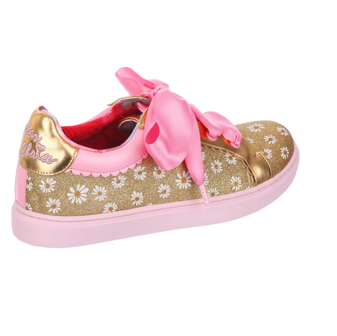 Wanting something comfy and casual but still with some irregular flair, these are the shoes for you! A comfy lace up sneaker style, these pumps are all decked out in a shimmering gold daisy covered glitter, with golden metallic details and a sumptuous pink satin ribbon lace! Absolutely perfect to lace up, step out and show the world what you are made of!