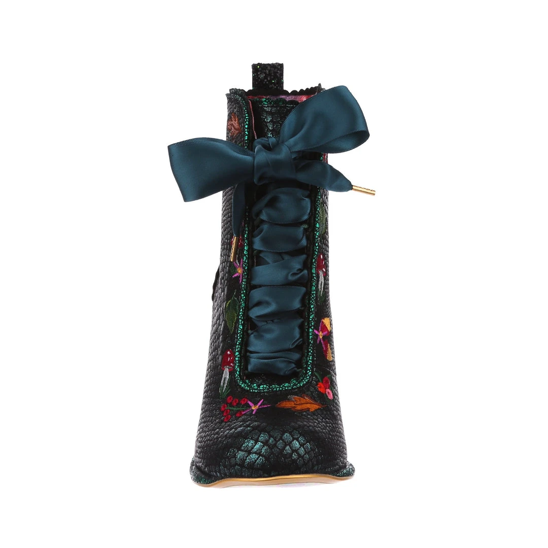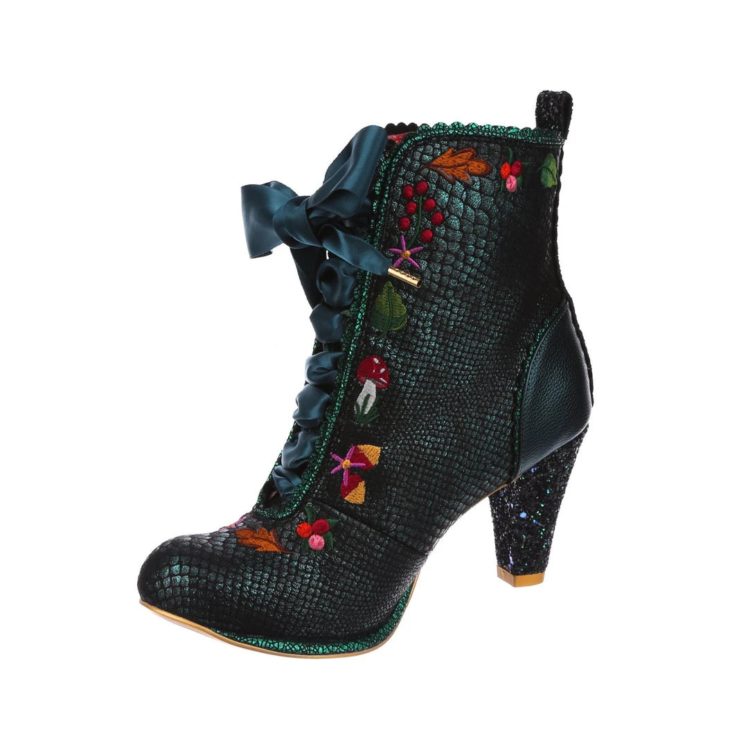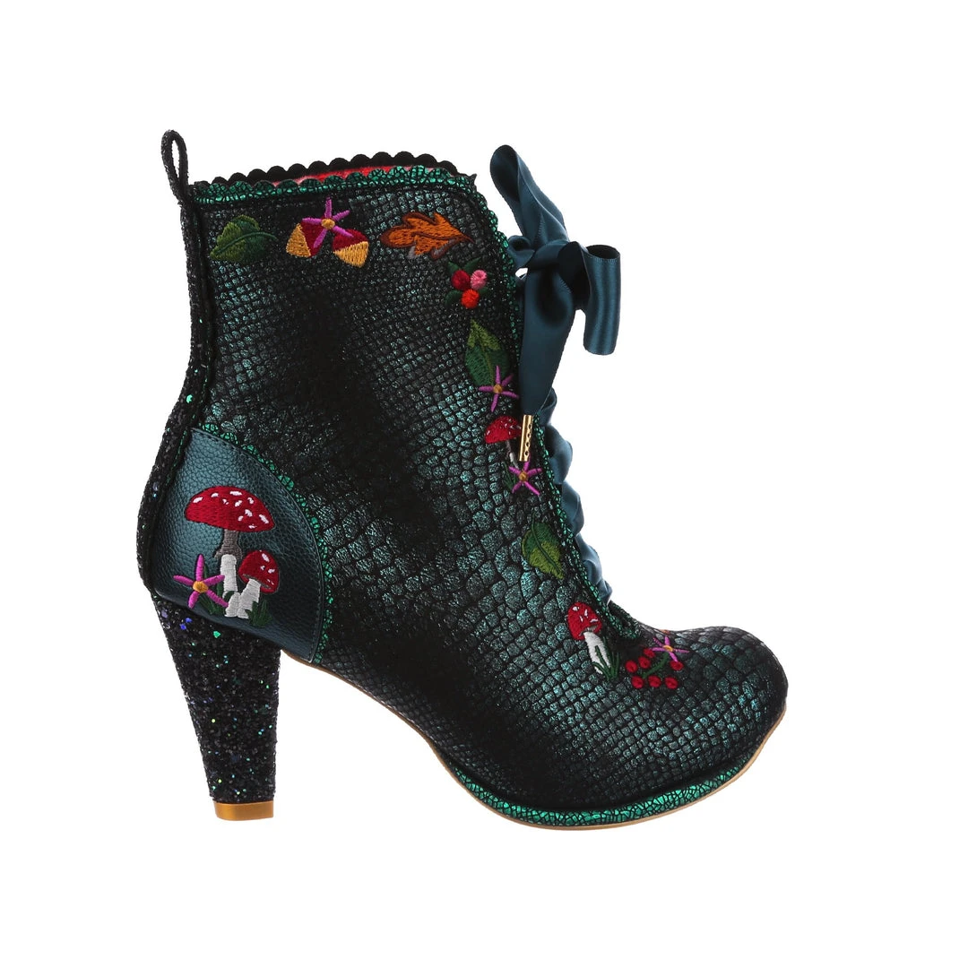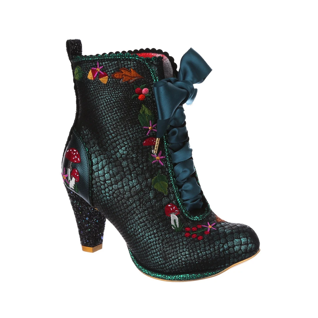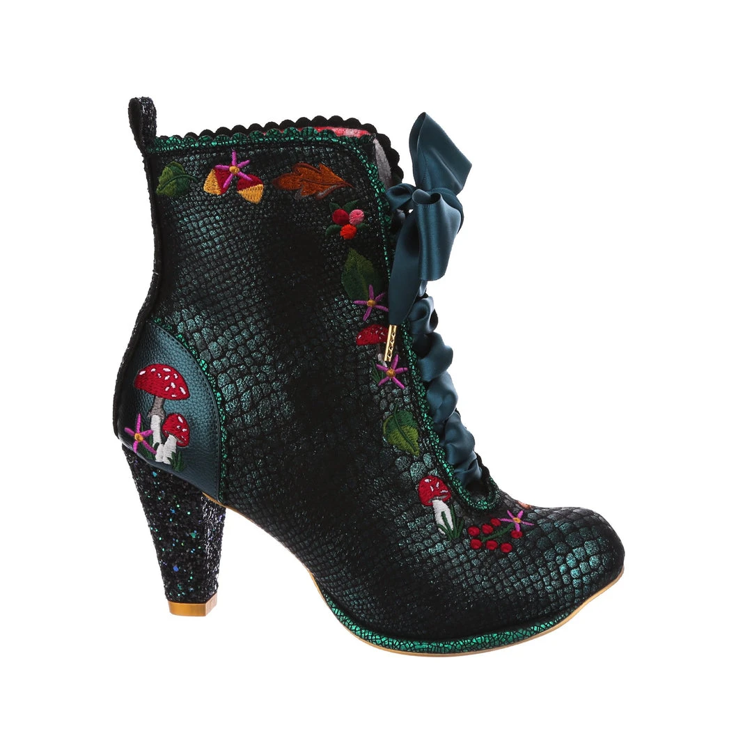 Lace up into these lovelies! Perfect to show your love for all things foresty and magical, these boots feature a statement shimmering teal snake texture, adorned with adorable embroidery of mushrooms, leaves and flowers! Perfect to feel like you are on a little woodland adventure, add them to your life today!