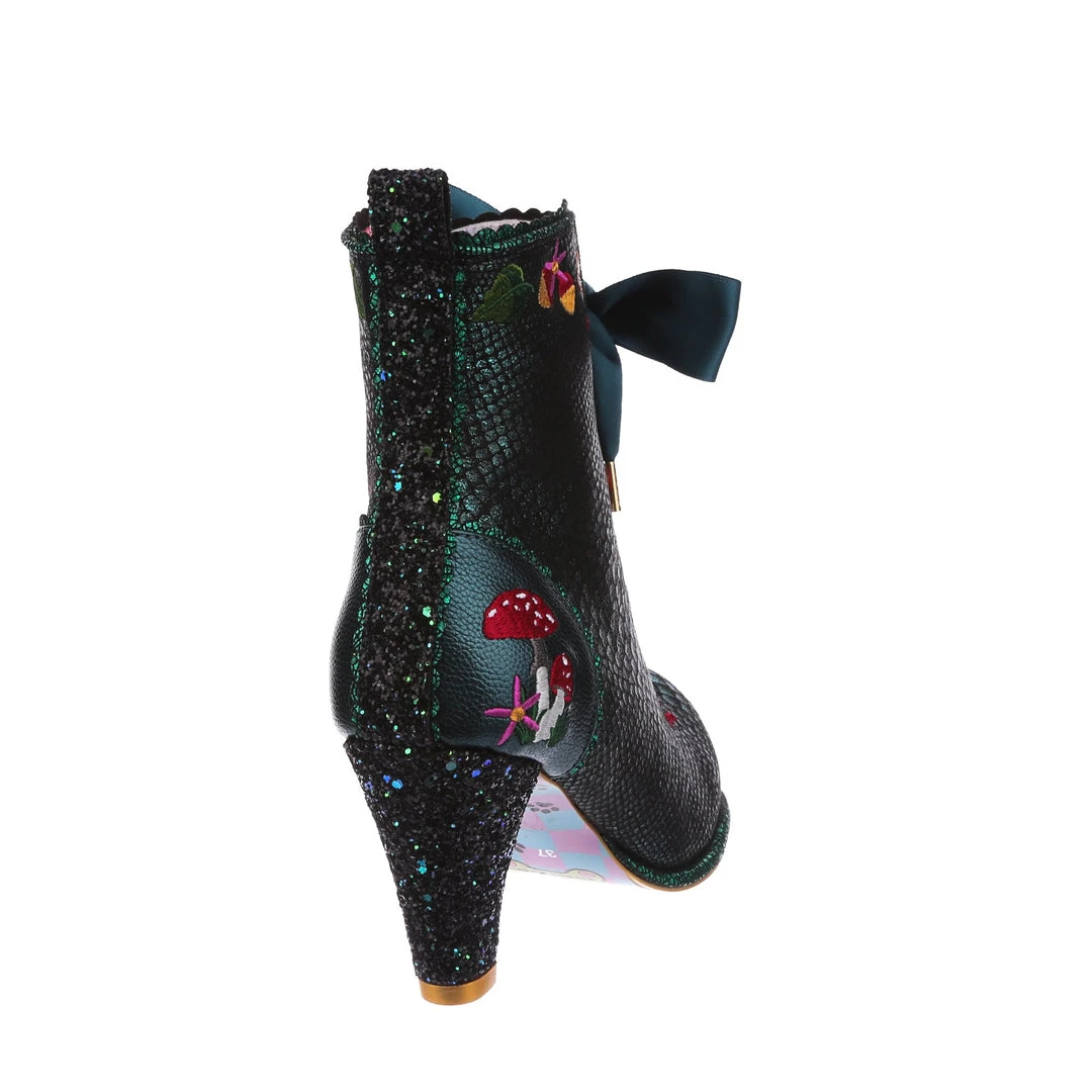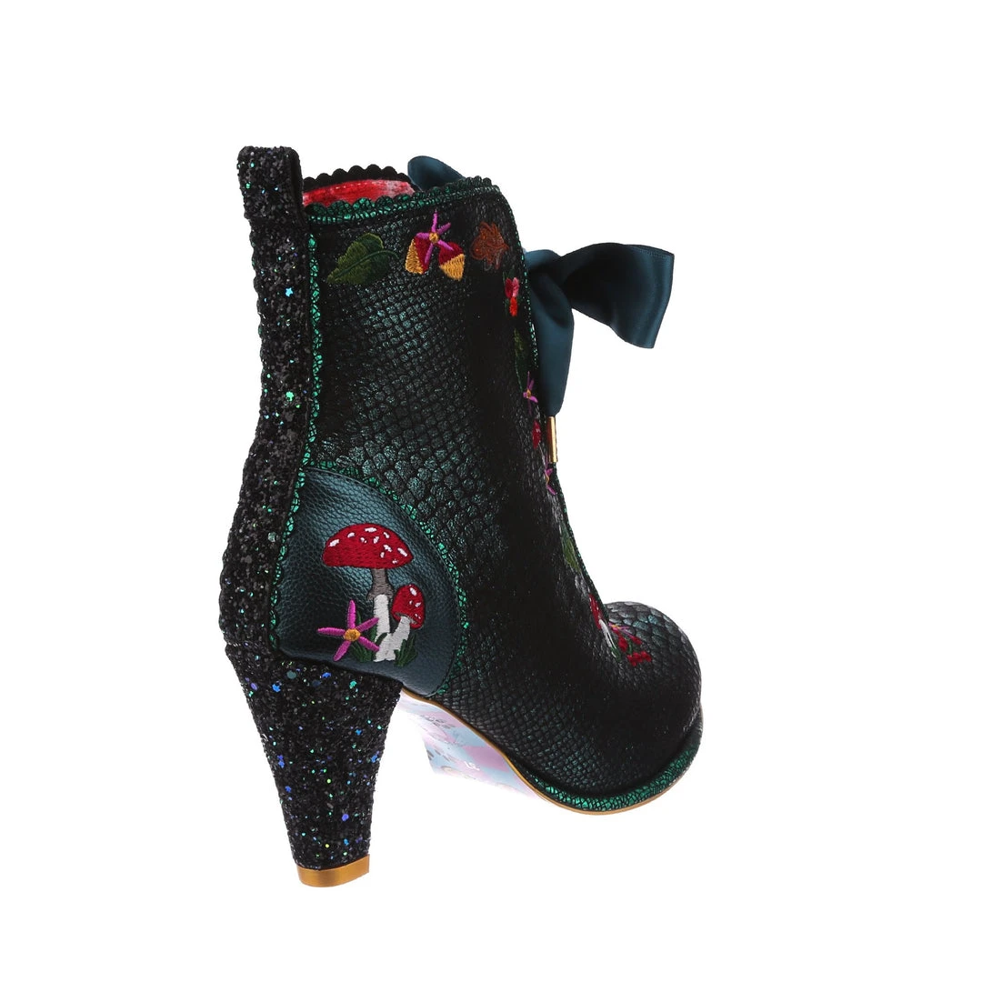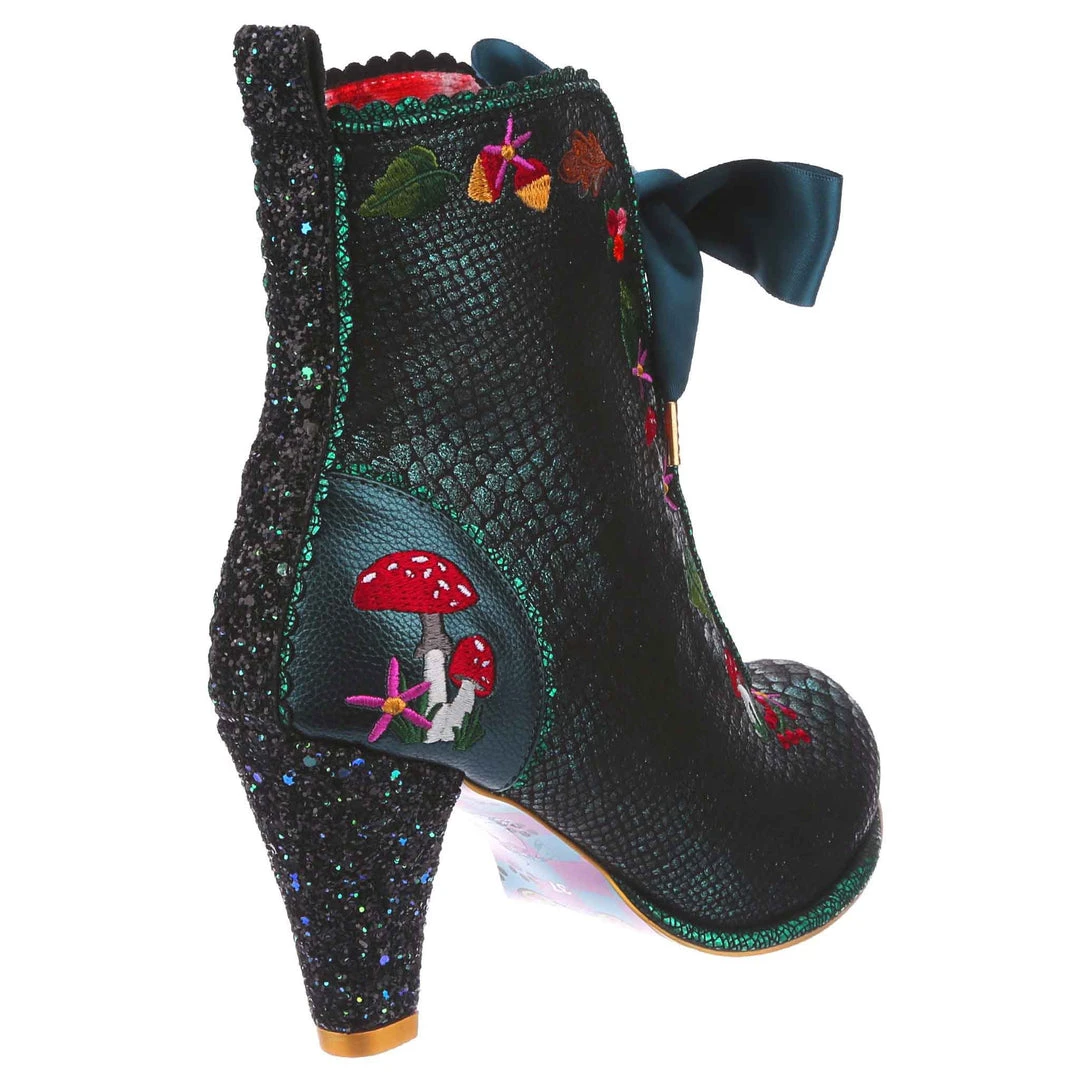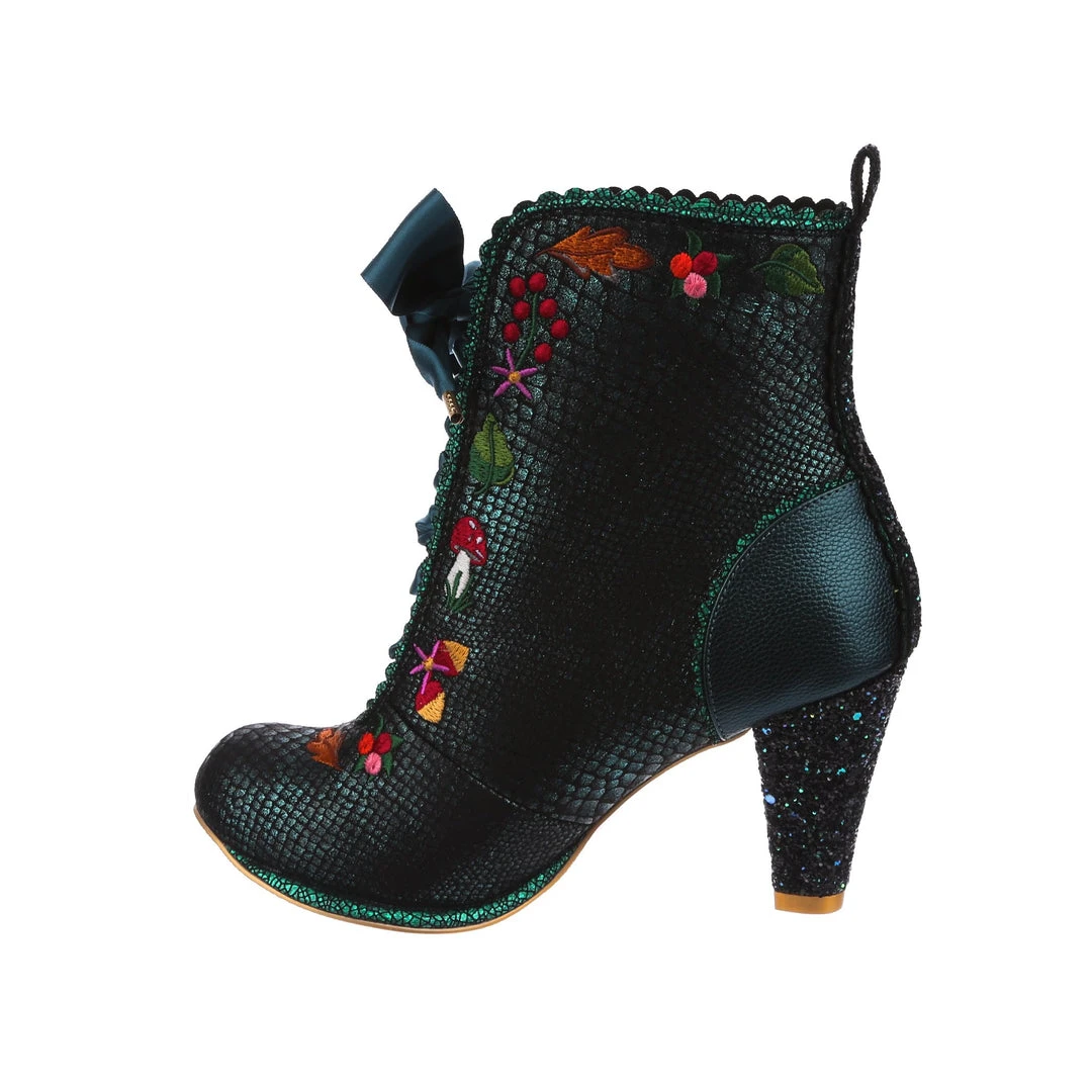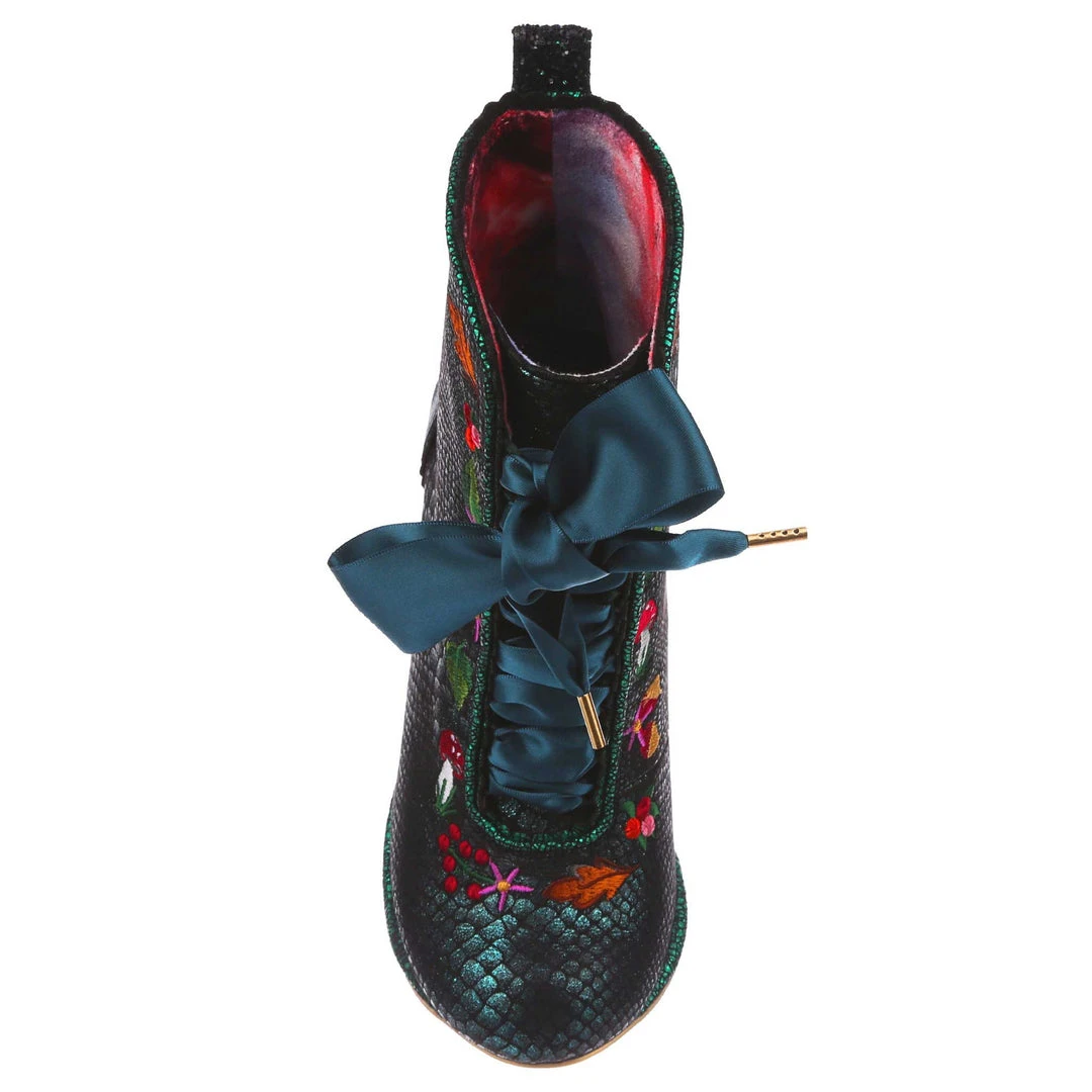 Lace up into these lovelies! Perfect to show your love for all things foresty and magical, these boots feature a statement shimmering teal snake texture, adorned with adorable embroidery of mushrooms, leaves and flowers! Perfect to feel like you are on a little woodland adventure, add them to your life today!