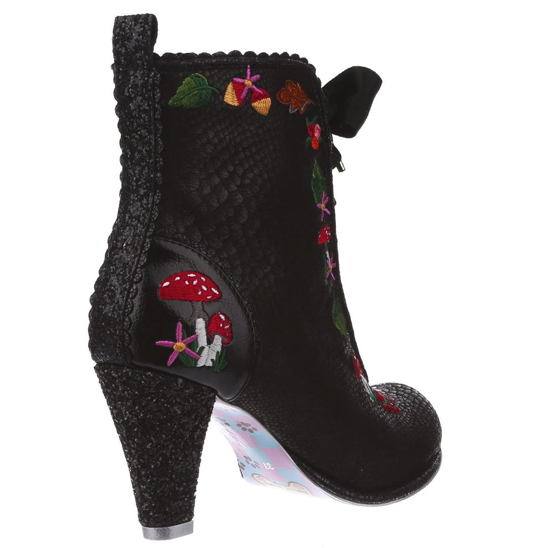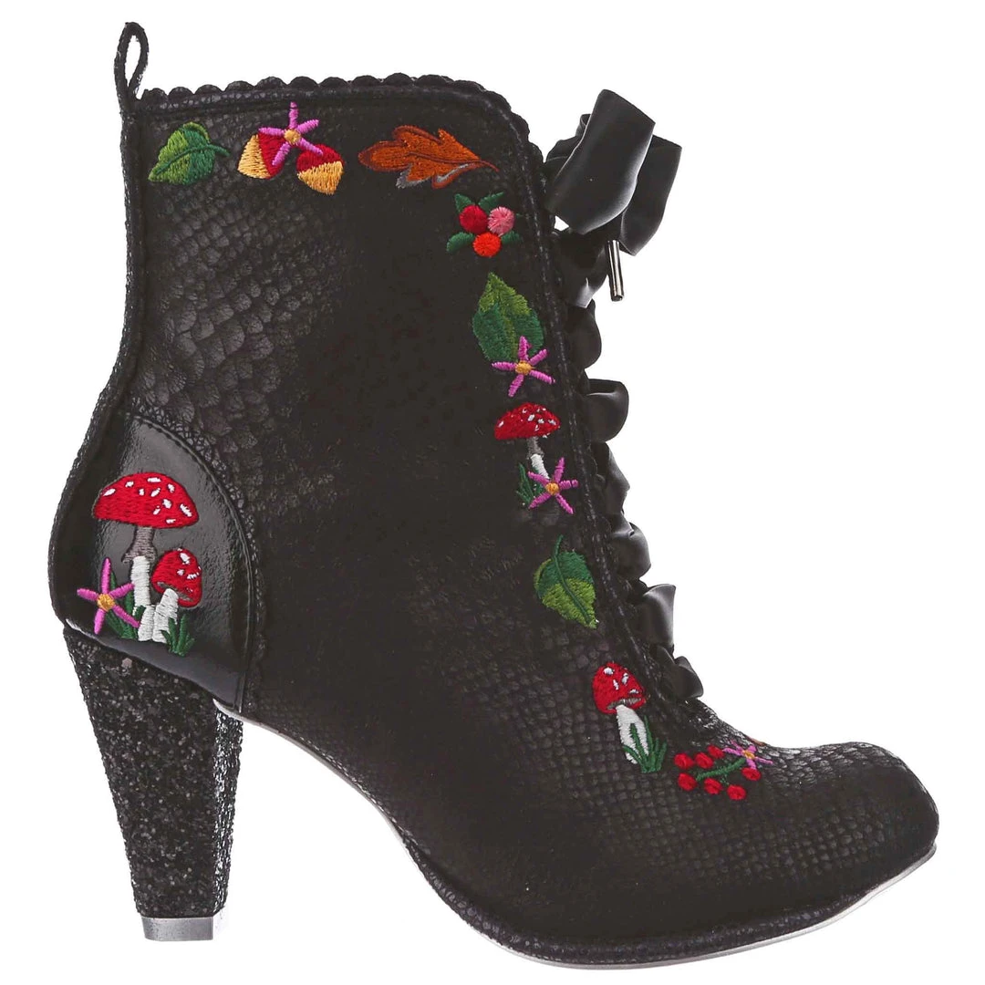 Lace up into these lovelies! Perfect to show your love for all things foresty and magical, these boots feature a statement shimmering black snake texture, adorned with adorable embroidery of mushrooms, leaves and flowers! Perfect to feel like you are on a little woodland adventure, add them to your life today!