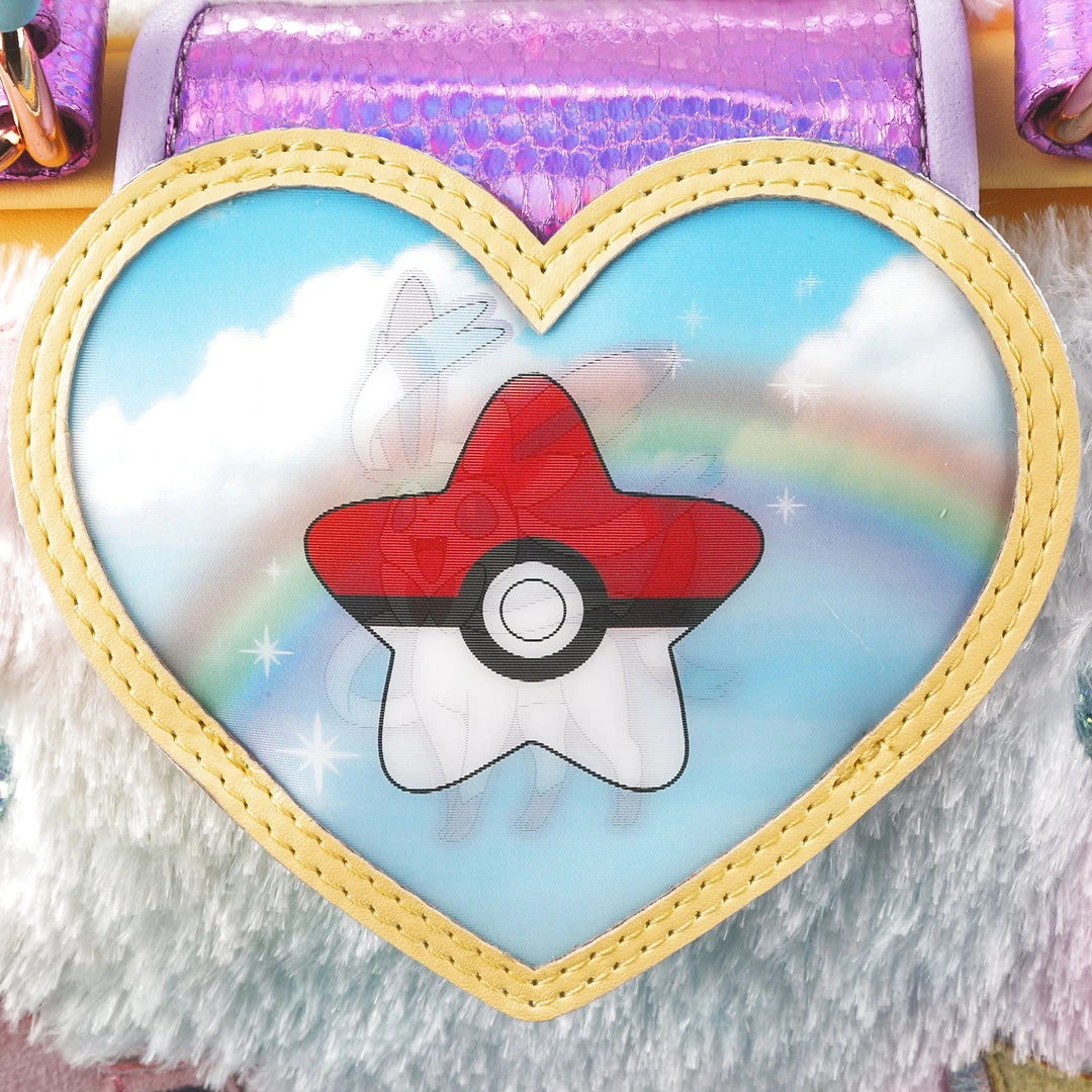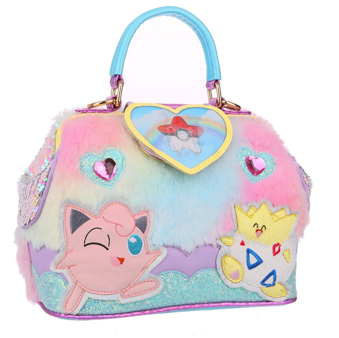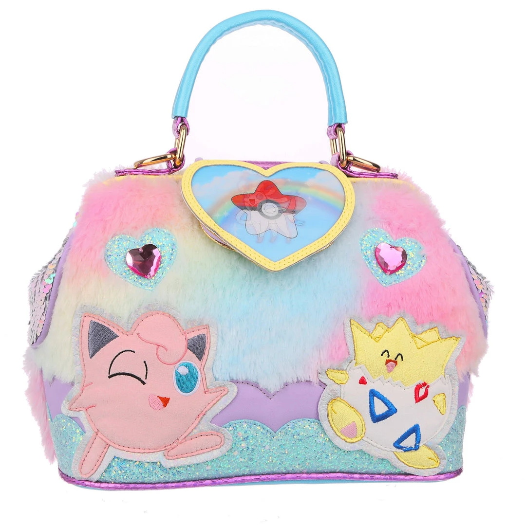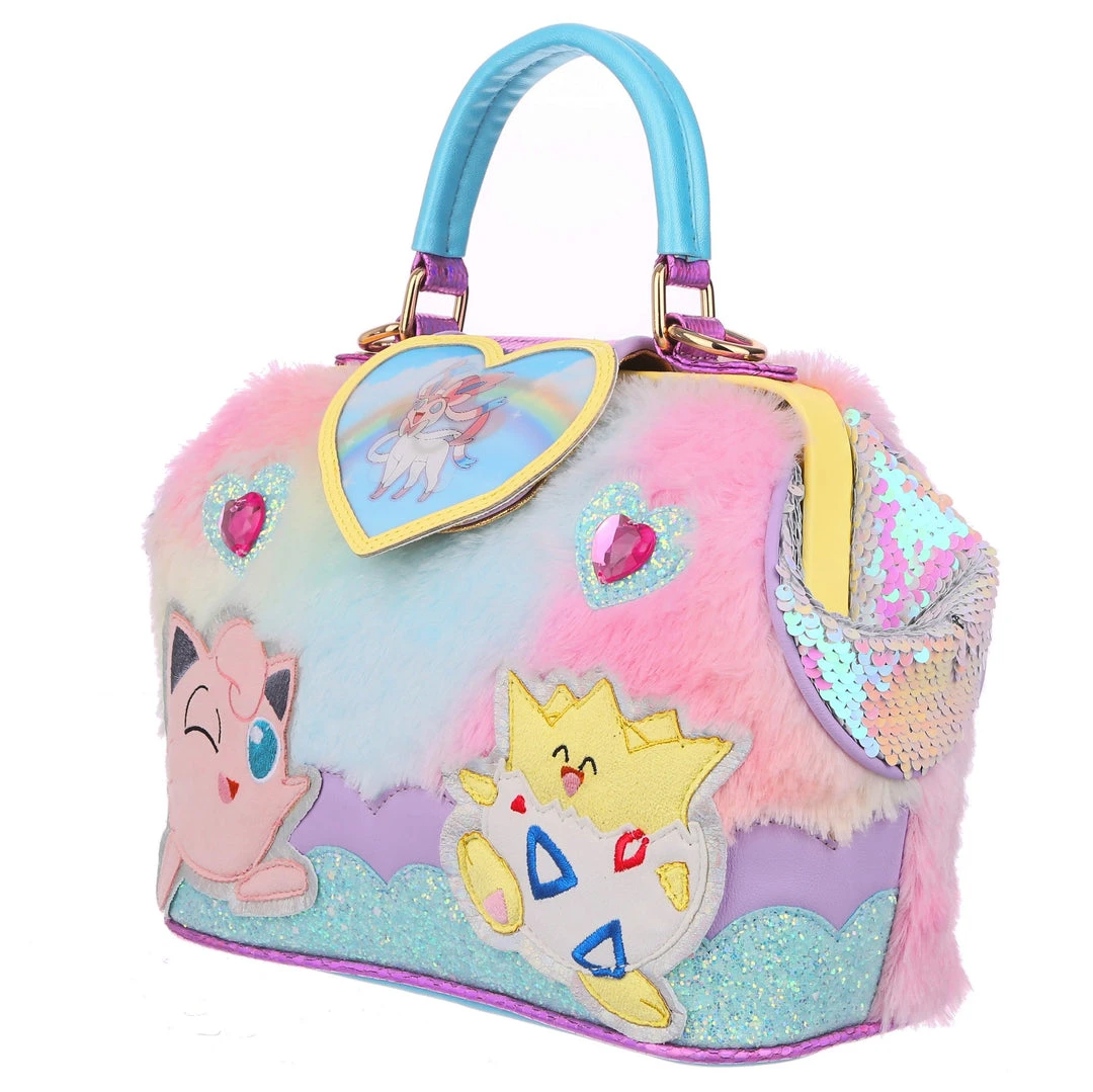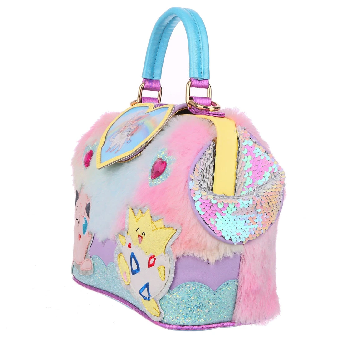 Give yourself a little fairy magic with this darling handbag! A fabulous pastel ombre faux fur is topped with matching scalloped panelling along the bottom and the fabulous Jigglypuff and Togepi are in pride of place on the front. The magnetic fastening features a stunning lenticular image of a star shaped Poké Ball, which shifts to the cutest Sylveon ever! Complete with a top handle, as well as a detachable removable shoulder strap, this bag is sure to give you a little boost whenever you wear it! Featuring Jigglypuff, Togepi, & Sylveon.